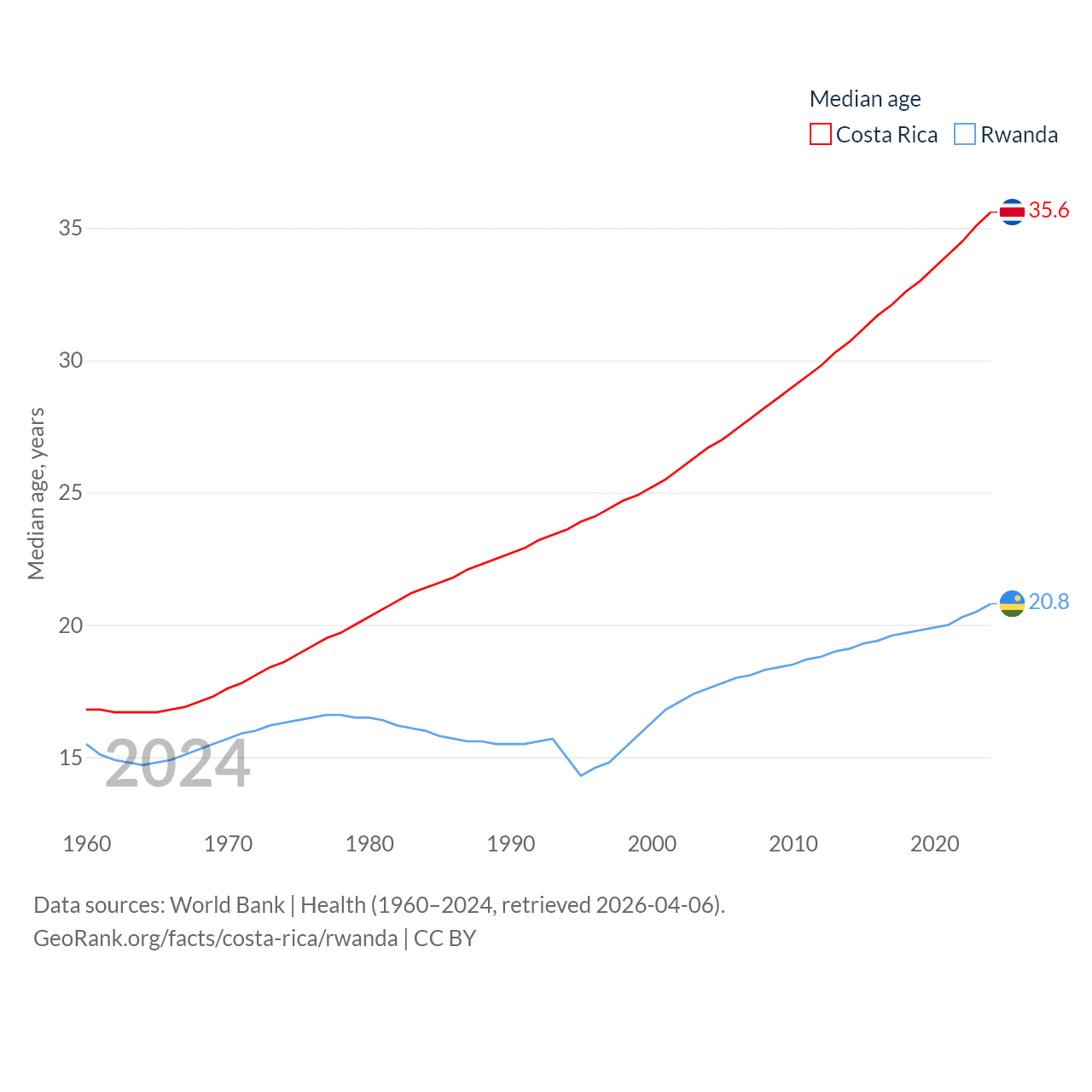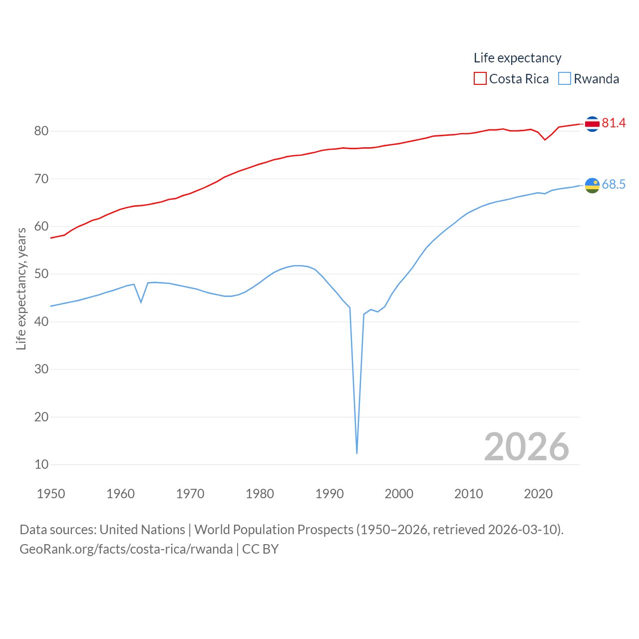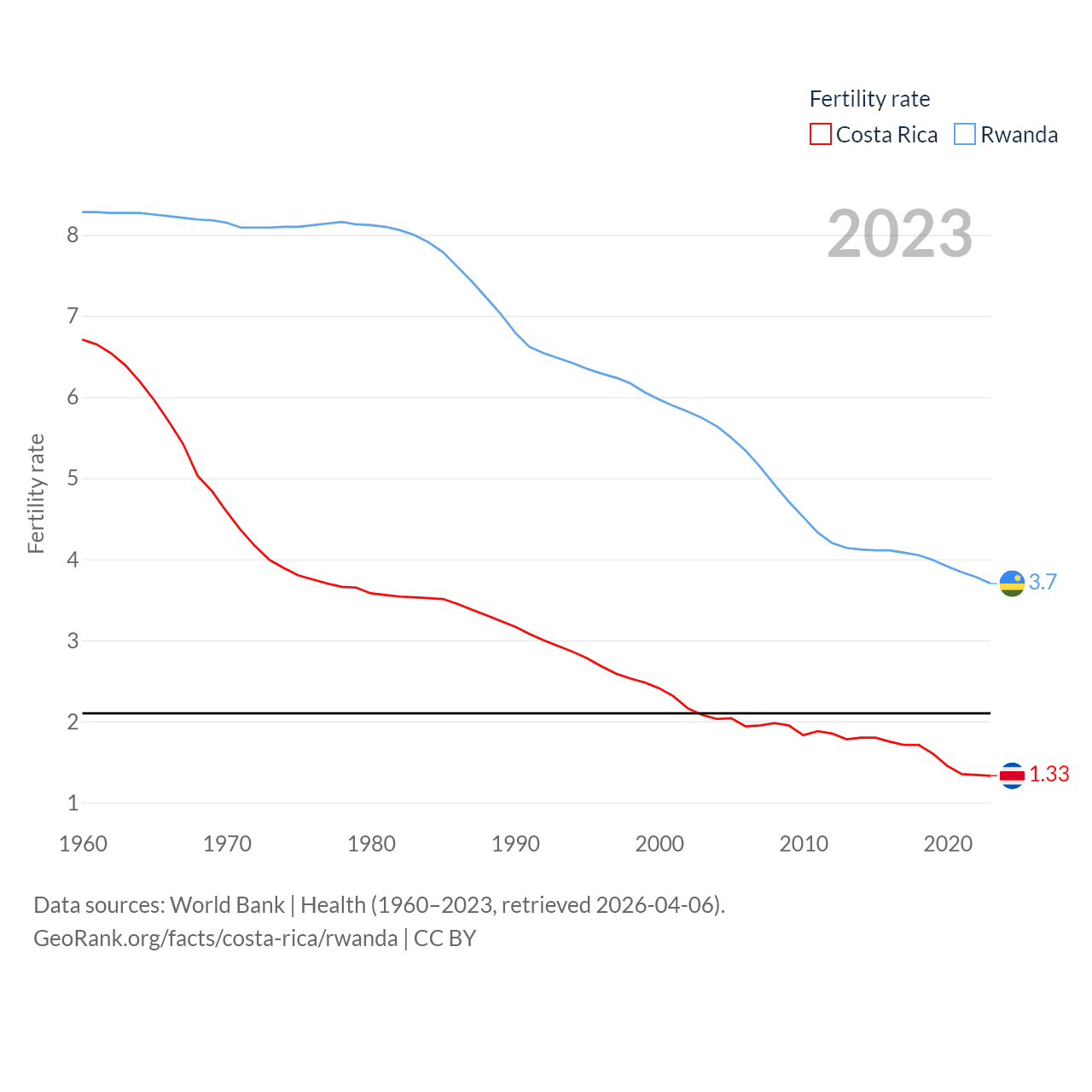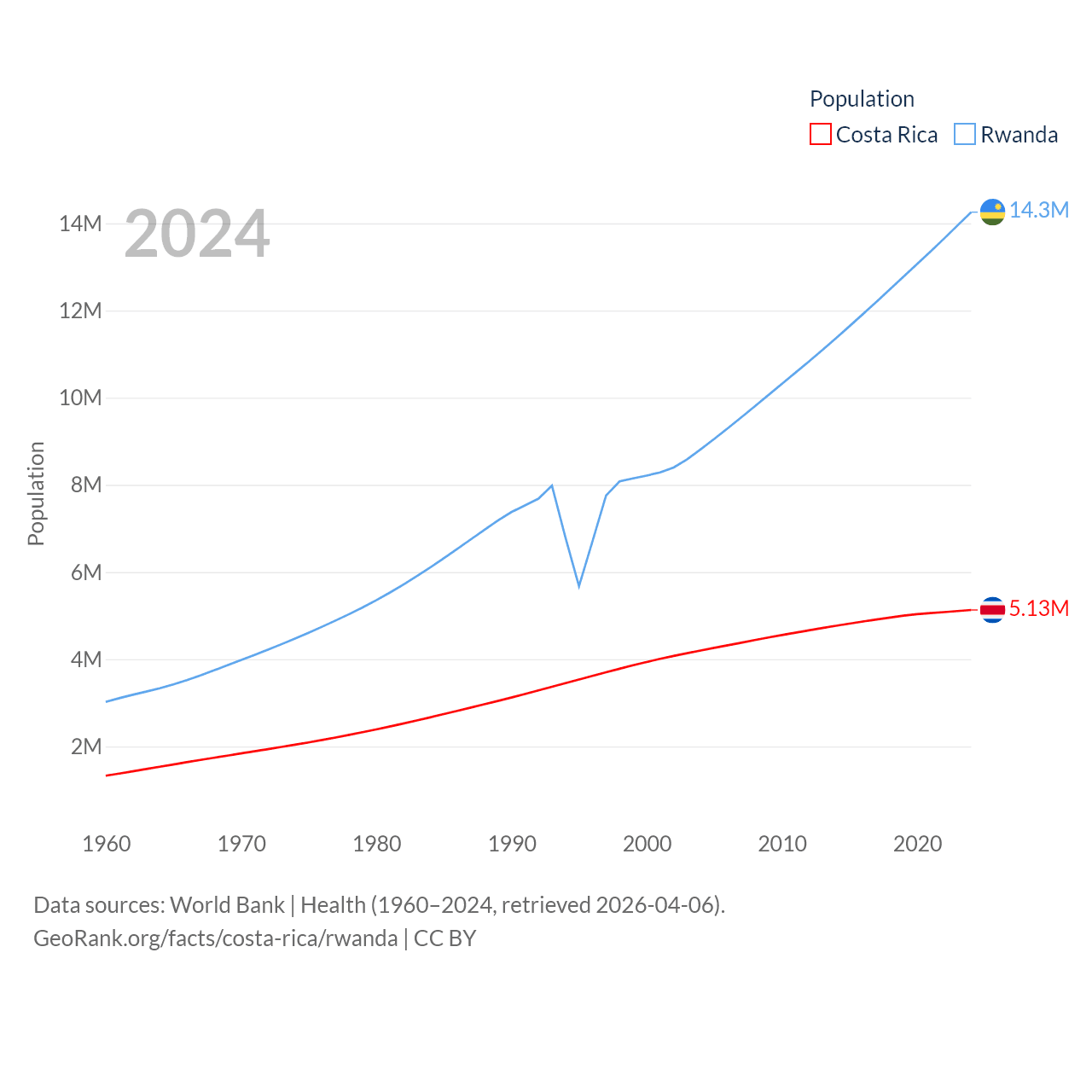 Costa Rica has a population of 5.13M (ranked 126/197), compared with 14.3M in Rwanda (ranked 77/197). Costa Rica's land area is 19,714 sq mi versus 9,525 sq mi for Rwanda (ranked 126th vs. 146th).