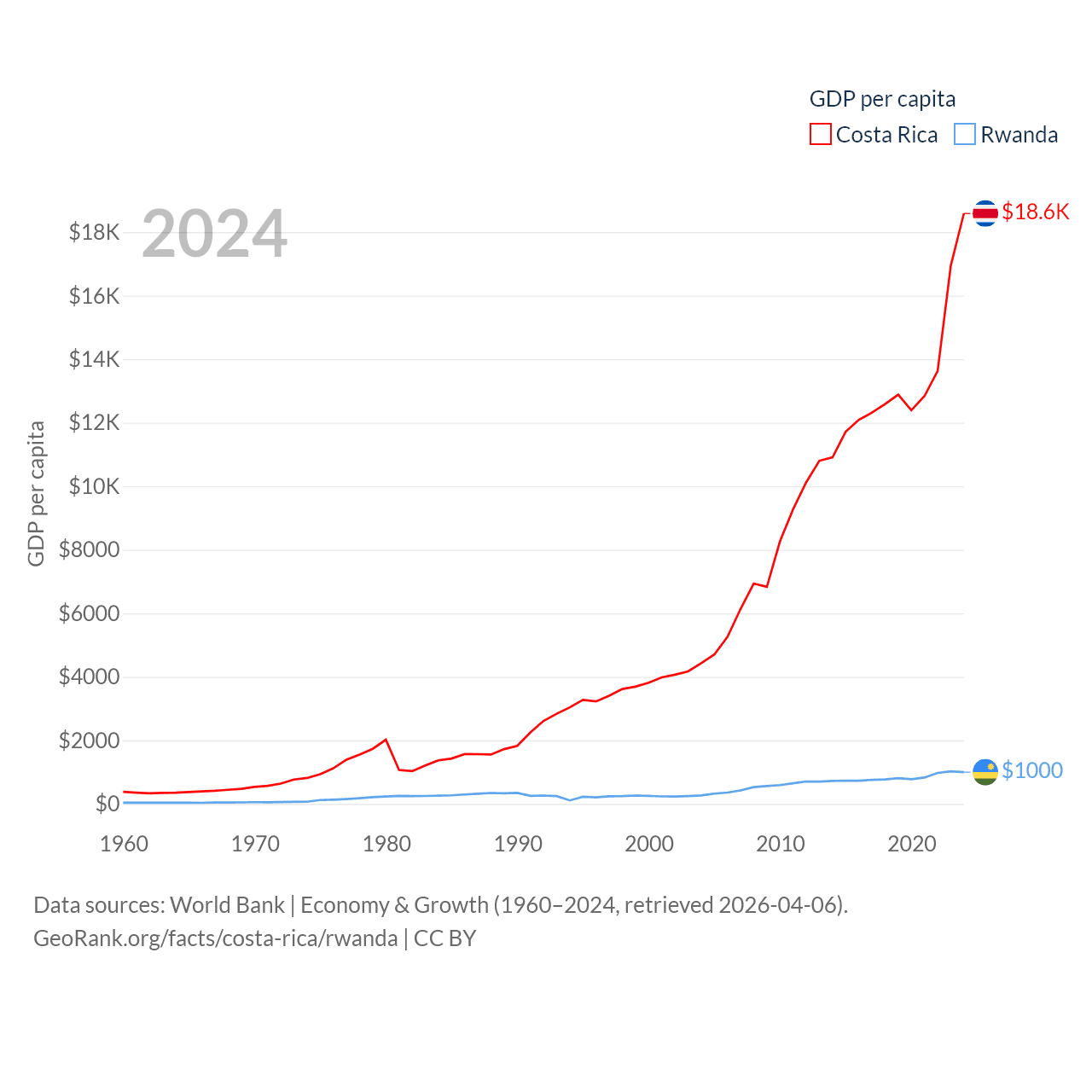By GDP, Costa Rica ranks 73/197 ($95.4B) and Rwanda ranks 144/197 ($14.3B). By GDP per capita, Costa Rica ranks 62/197 ($18,587), while Rwanda ranks 178/197 ($1,000).
