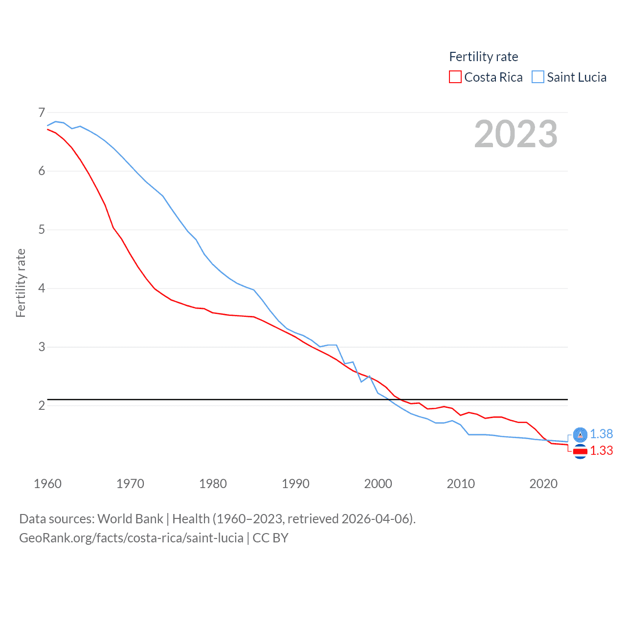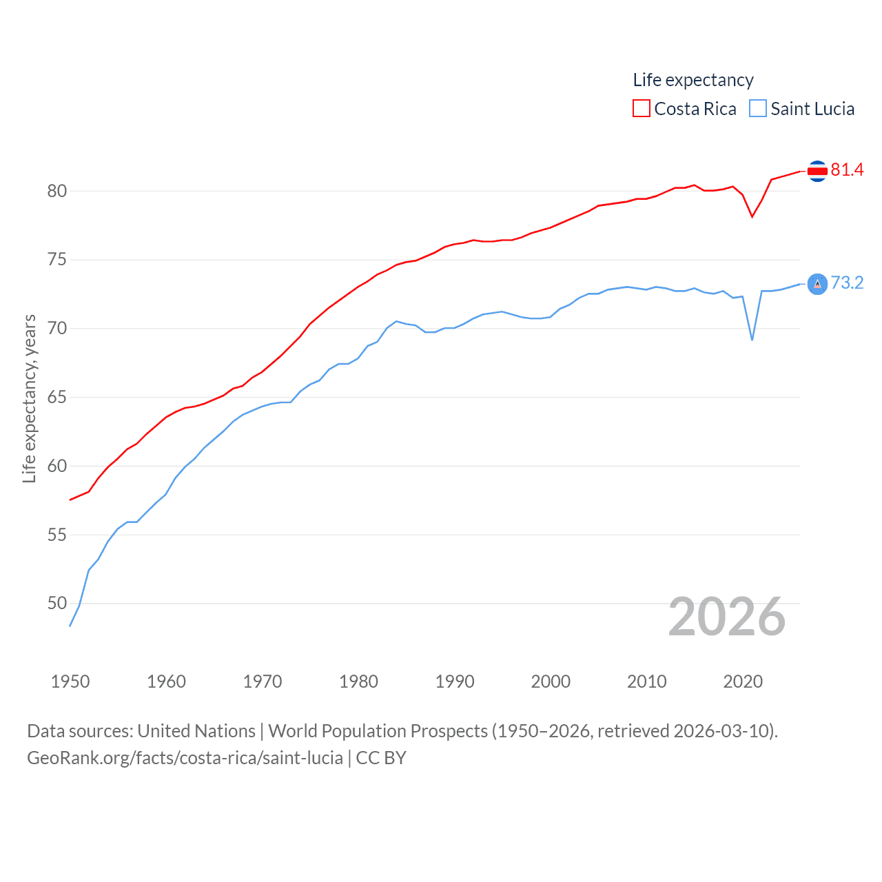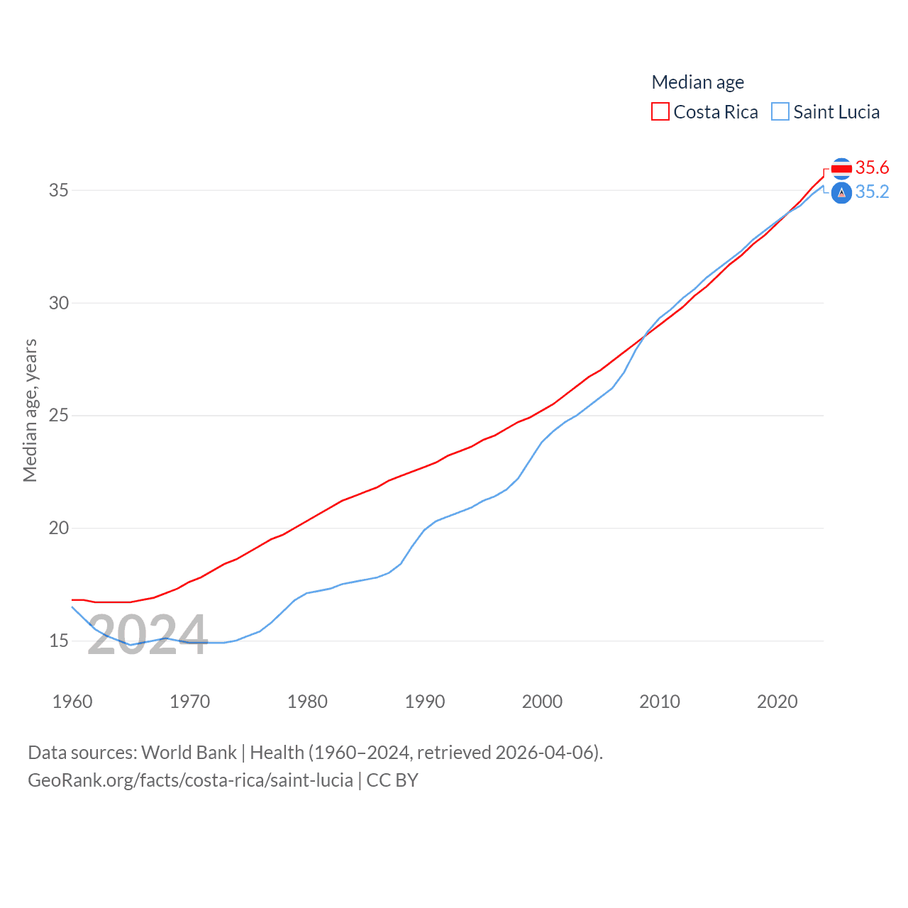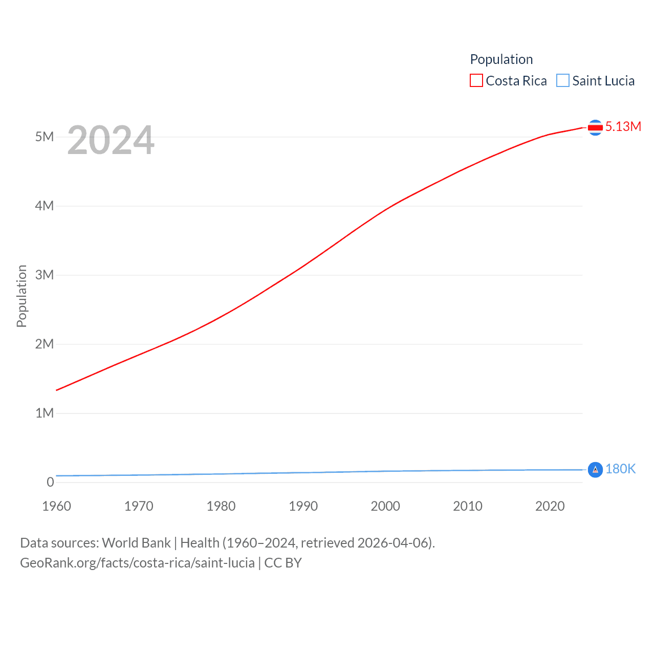 Costa Rica has a population of 5.13M (ranked 126/197), compared with 180K in Saint Lucia (ranked 178/197). Costa Rica's land area is 19,714 sq mi versus 235.5 sq mi for Saint Lucia (ranked 126th vs. 178th).