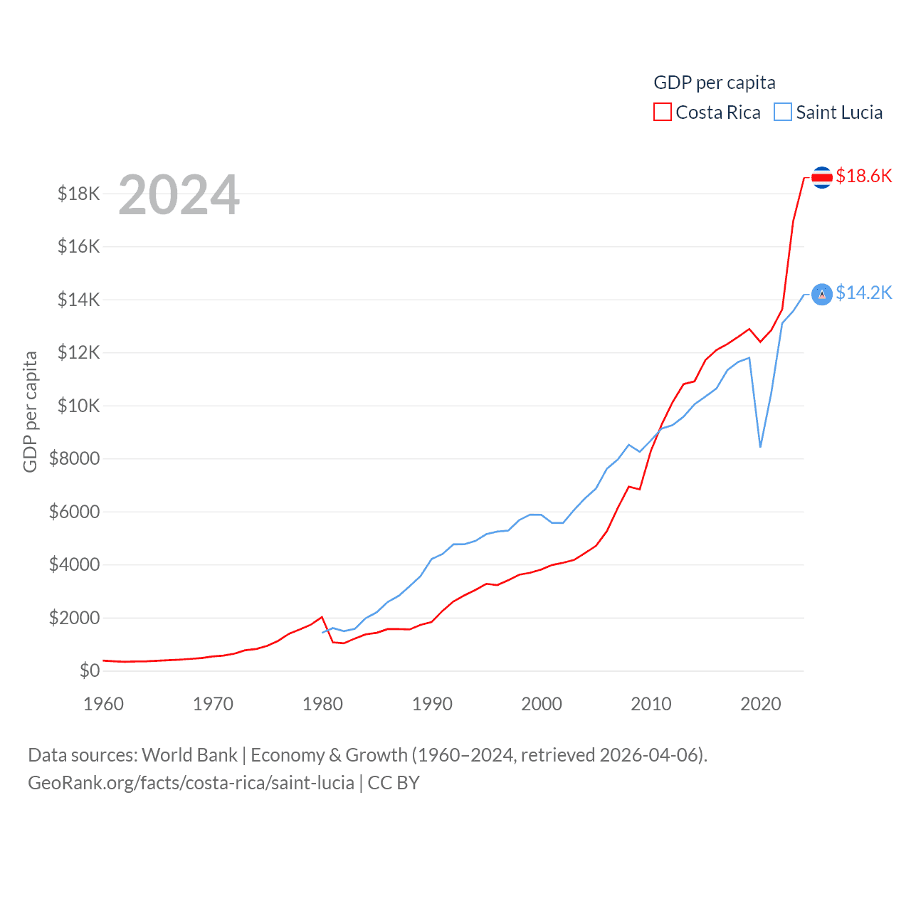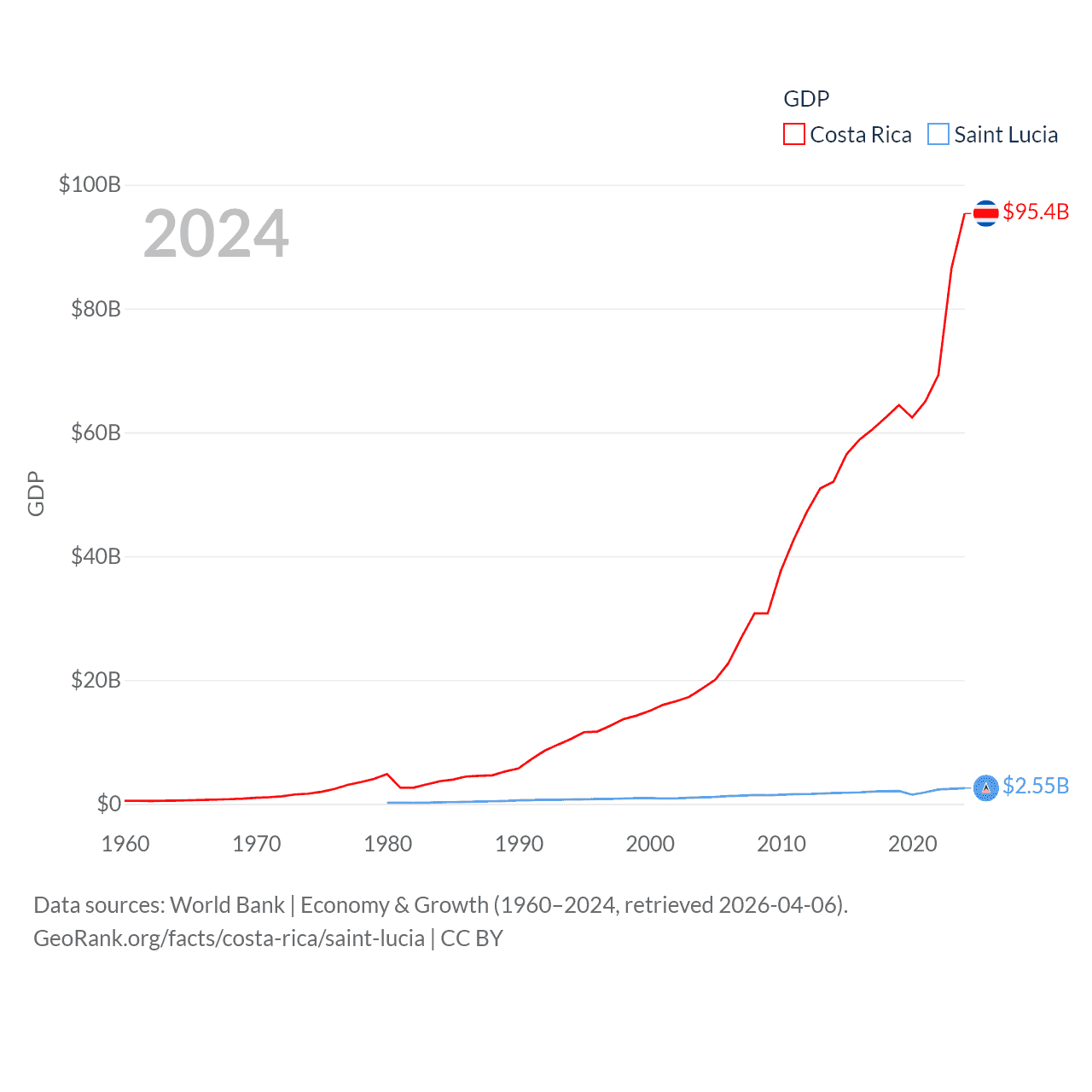 By GDP, Costa Rica ranks 73/197 ($95.4B) and Saint Lucia ranks 173/197 ($2.55B). By GDP per capita, Costa Rica ranks 62/197 ($18,587), while Saint Lucia ranks 70/197 ($14,182).