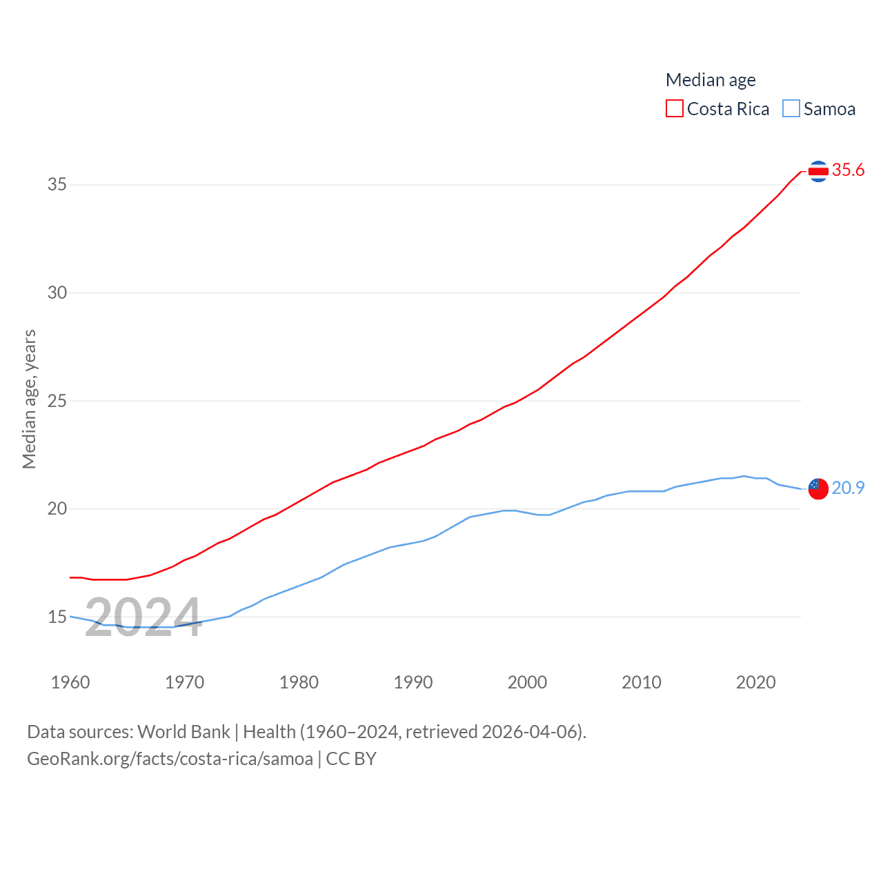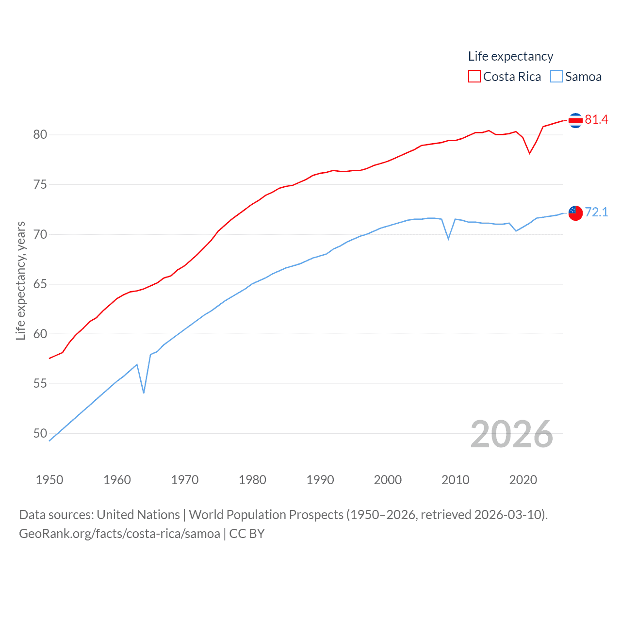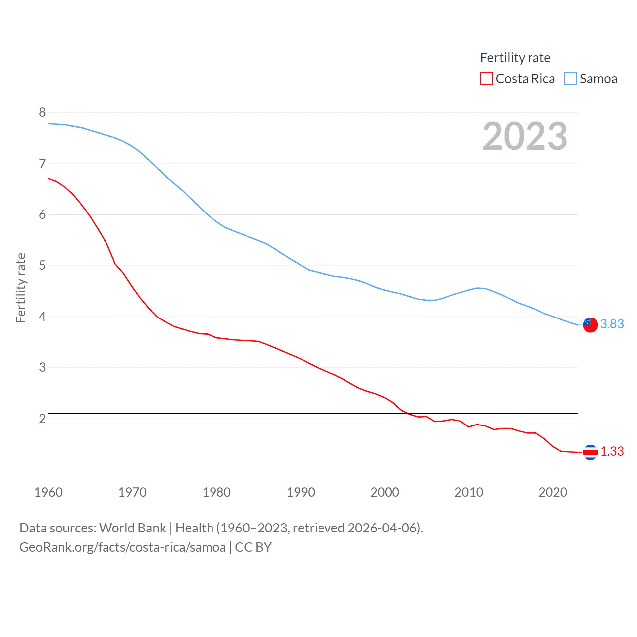 Costa Rica has a population of 5.13M (ranked 126/197), compared with 218K in Samoa (ranked 177/197). Costa Rica's land area is 19,714 sq mi versus 1,073 sq mi for Samoa (ranked 126th vs. 168th).