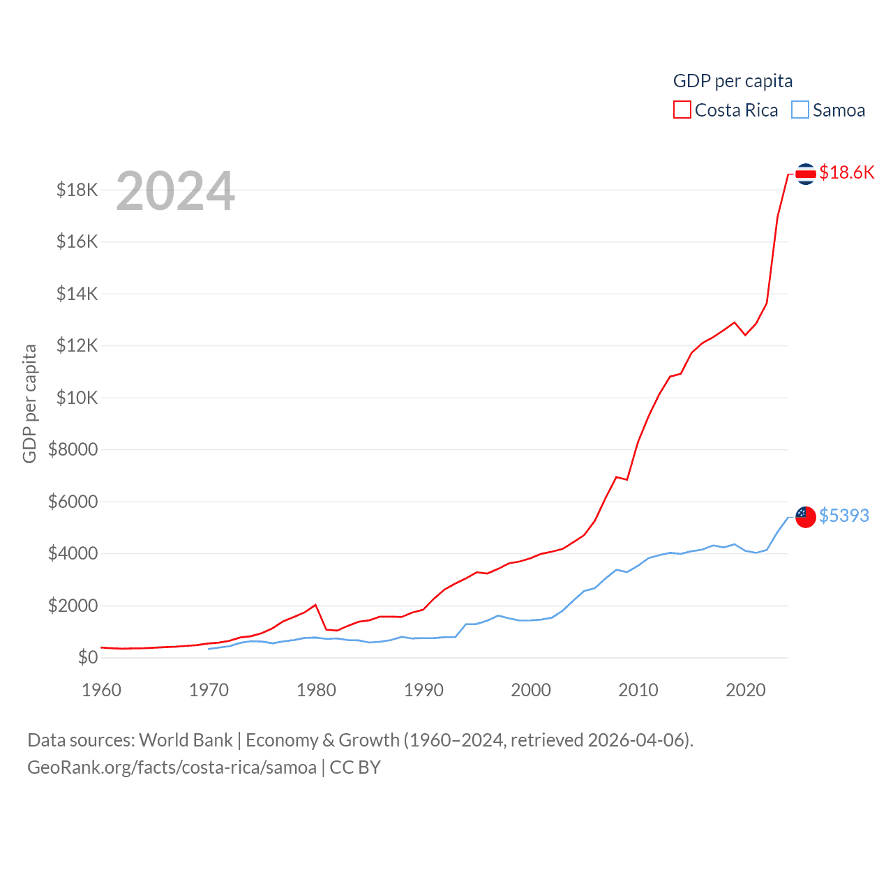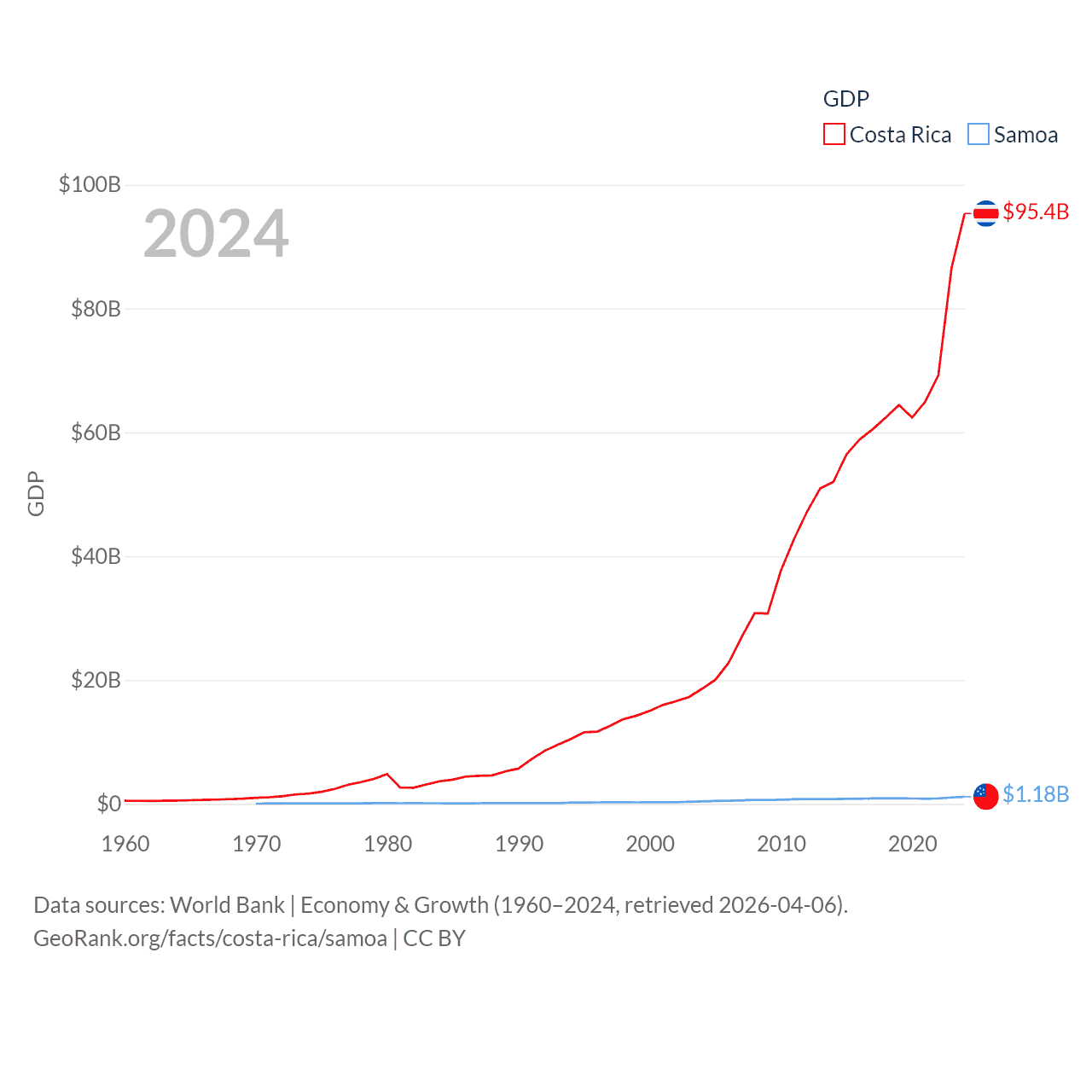 By GDP, Costa Rica ranks 73/197 ($95.4B) and Samoa ranks 185/197 ($1.18B). By GDP per capita, Costa Rica ranks 62/197 ($18,587), while Samoa ranks 117/197 ($5,393).