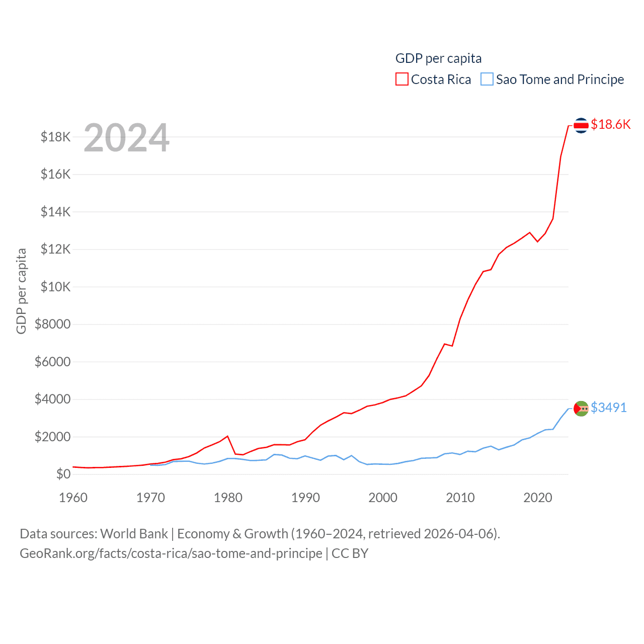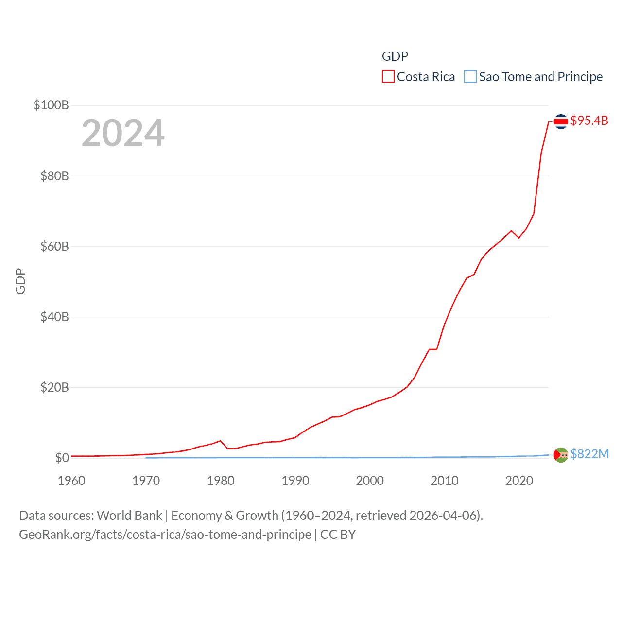 By GDP, Costa Rica ranks 73/197 ($95.4B) and Sao Tome and Principe ranks 189/197 ($822M). By GDP per capita, Costa Rica ranks 62/197 ($18,587), while Sao Tome and Principe ranks 134/197 ($3,491).