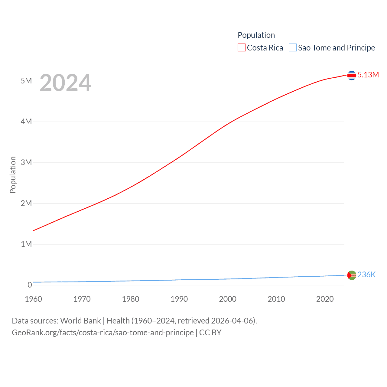 Costa Rica has a population of 5.13M (ranked 126/197), compared with 236K in Sao Tome and Principe (ranked 176/197). Costa Rica's land area is 19,714 sq mi versus 371 sq mi for Sao Tome and Principe (ranked 126th vs. 172nd).