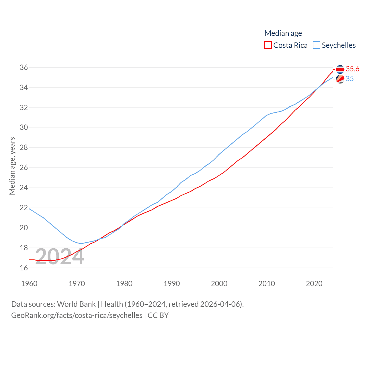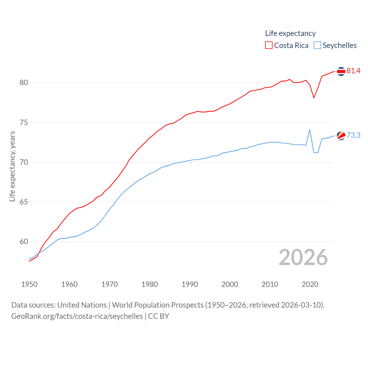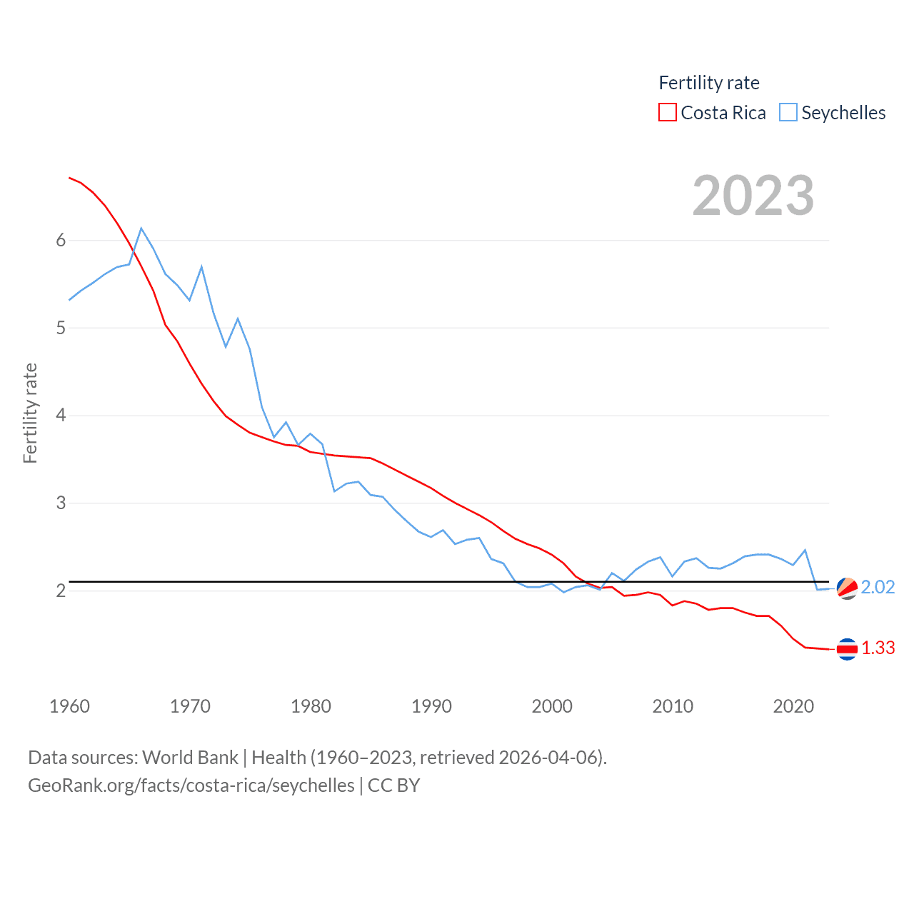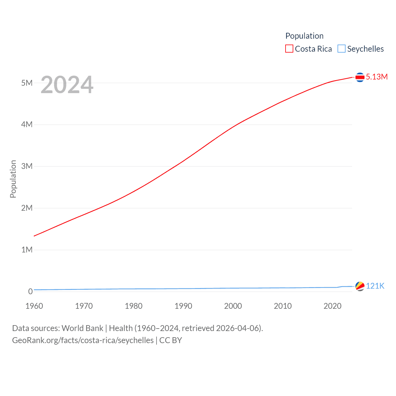 Costa Rica has a population of 5.13M (ranked 126/197), compared with 121K in The Seychelles (ranked 181/197). Costa Rica's land area is 19,714 sq mi versus 177.6 sq mi for The Seychelles (ranked 126th vs. 181st).