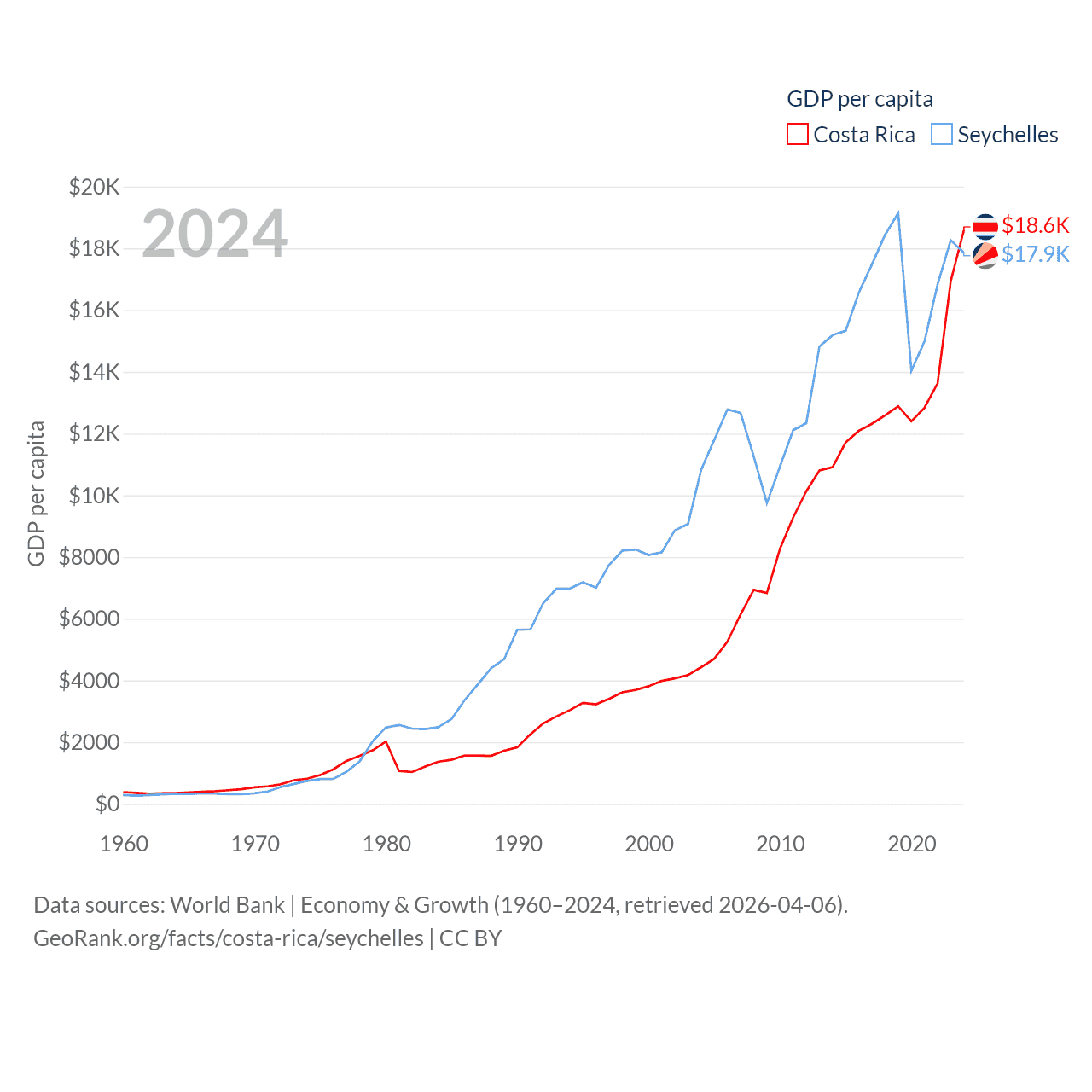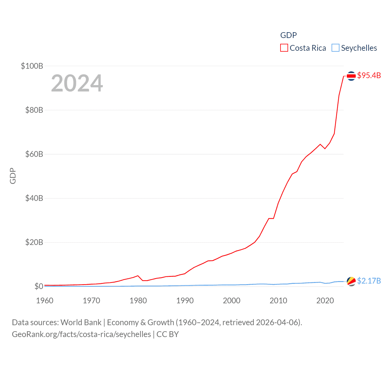 By GDP, Costa Rica ranks 73/197 ($95.4B) and The Seychelles ranks 178/197 ($2.17B). By GDP per capita, Costa Rica ranks 62/197 ($18,587), while The Seychelles ranks 63/197 ($17,859).