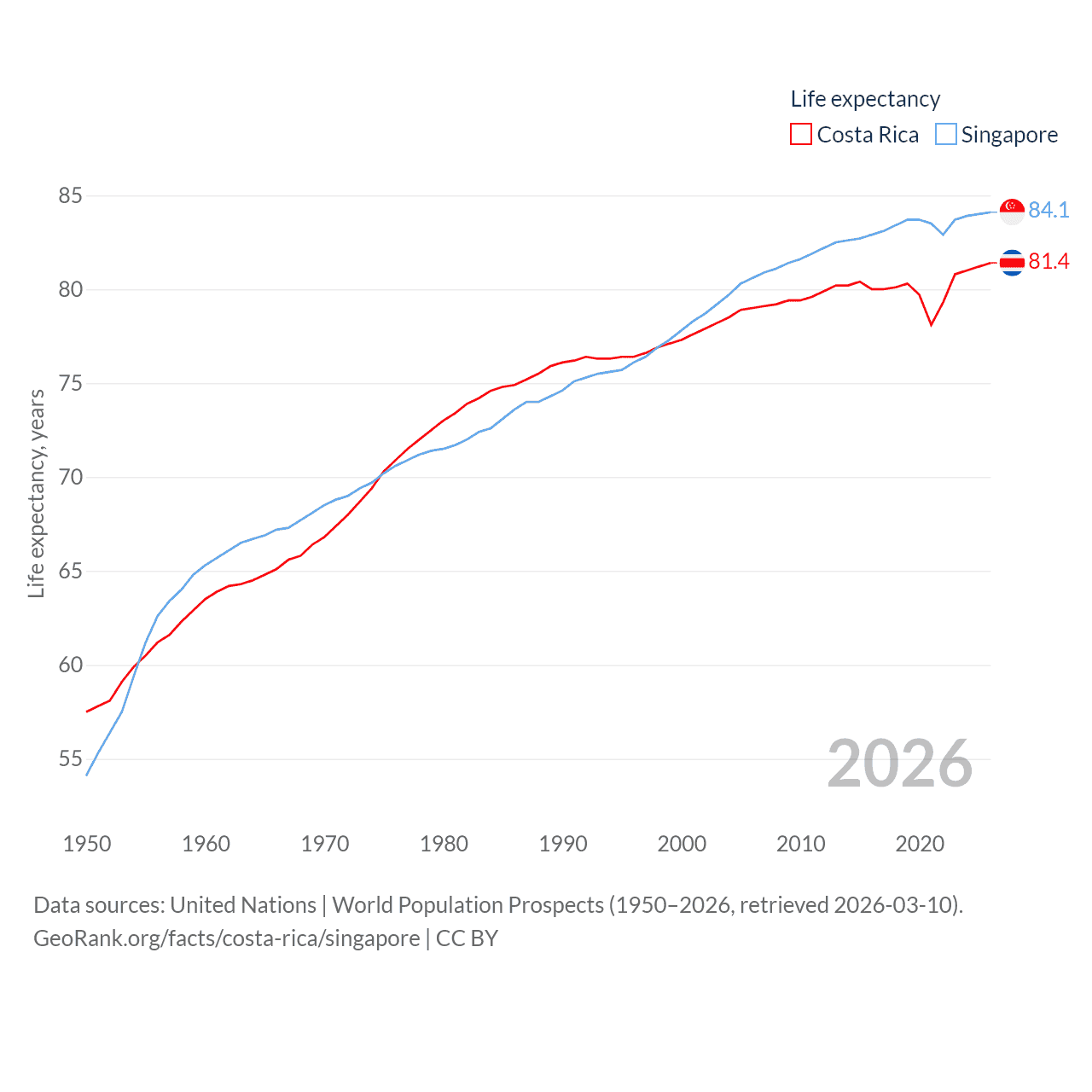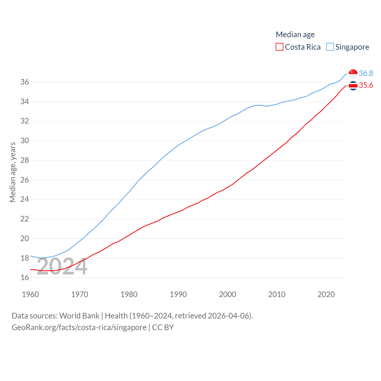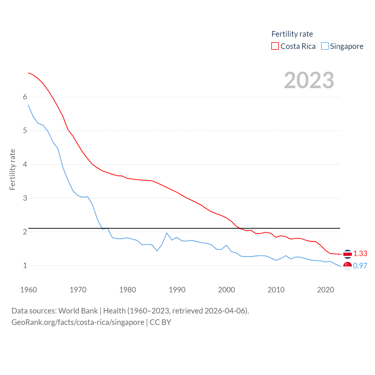 Costa Rica has a population of 5.13M (ranked 126/197), compared with 6.04M in Singapore (ranked 113/197). Costa Rica's land area is 19,714 sq mi versus 277.2 sq mi for Singapore (ranked 126th vs. 177th).