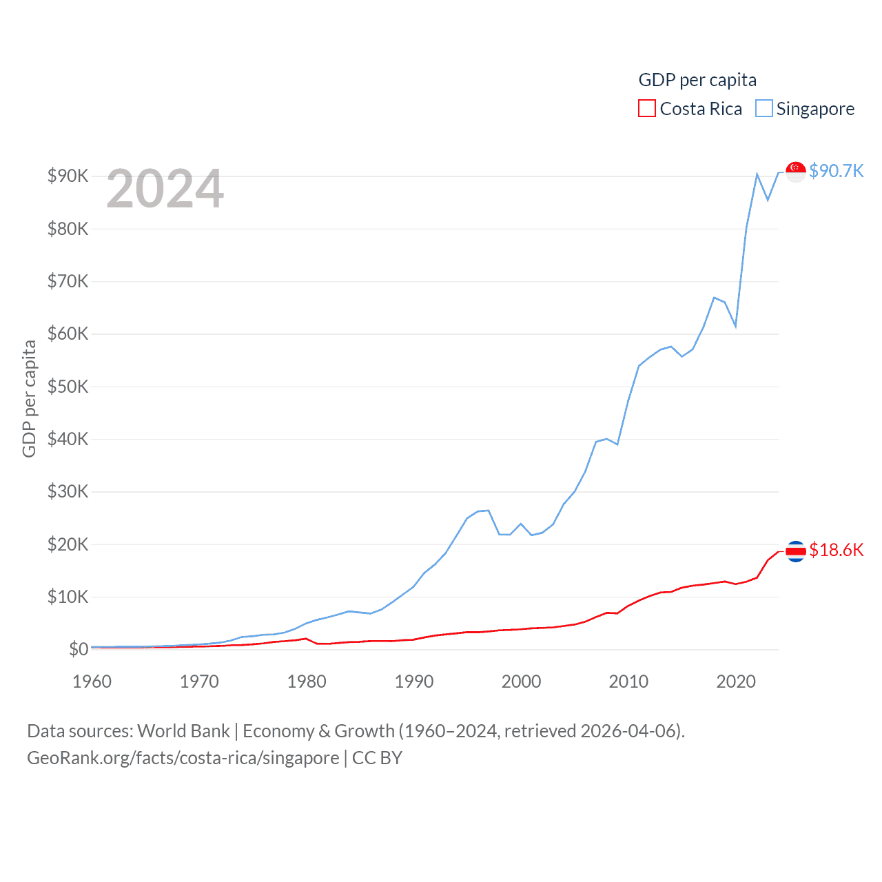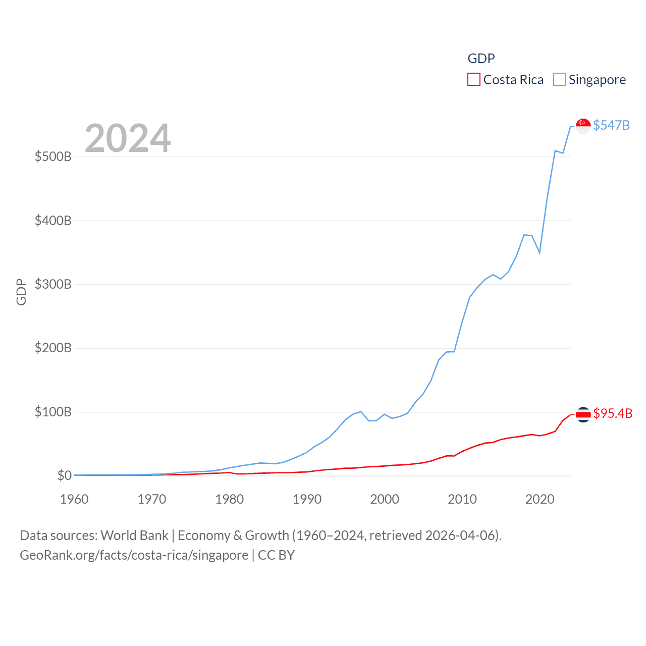 By GDP, Costa Rica ranks 73/197 ($95.4B) and Singapore ranks 28/197 ($547B). By GDP per capita, Costa Rica ranks 62/197 ($18,587), while Singapore ranks 7/197 ($90,674).