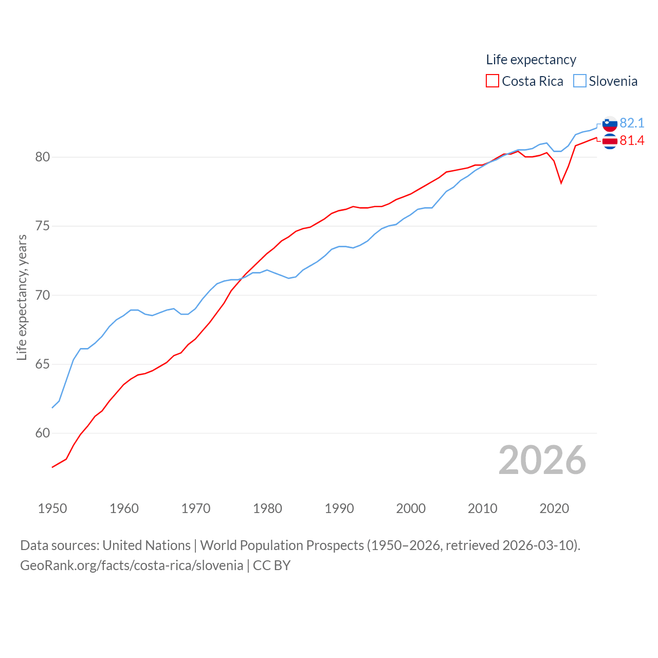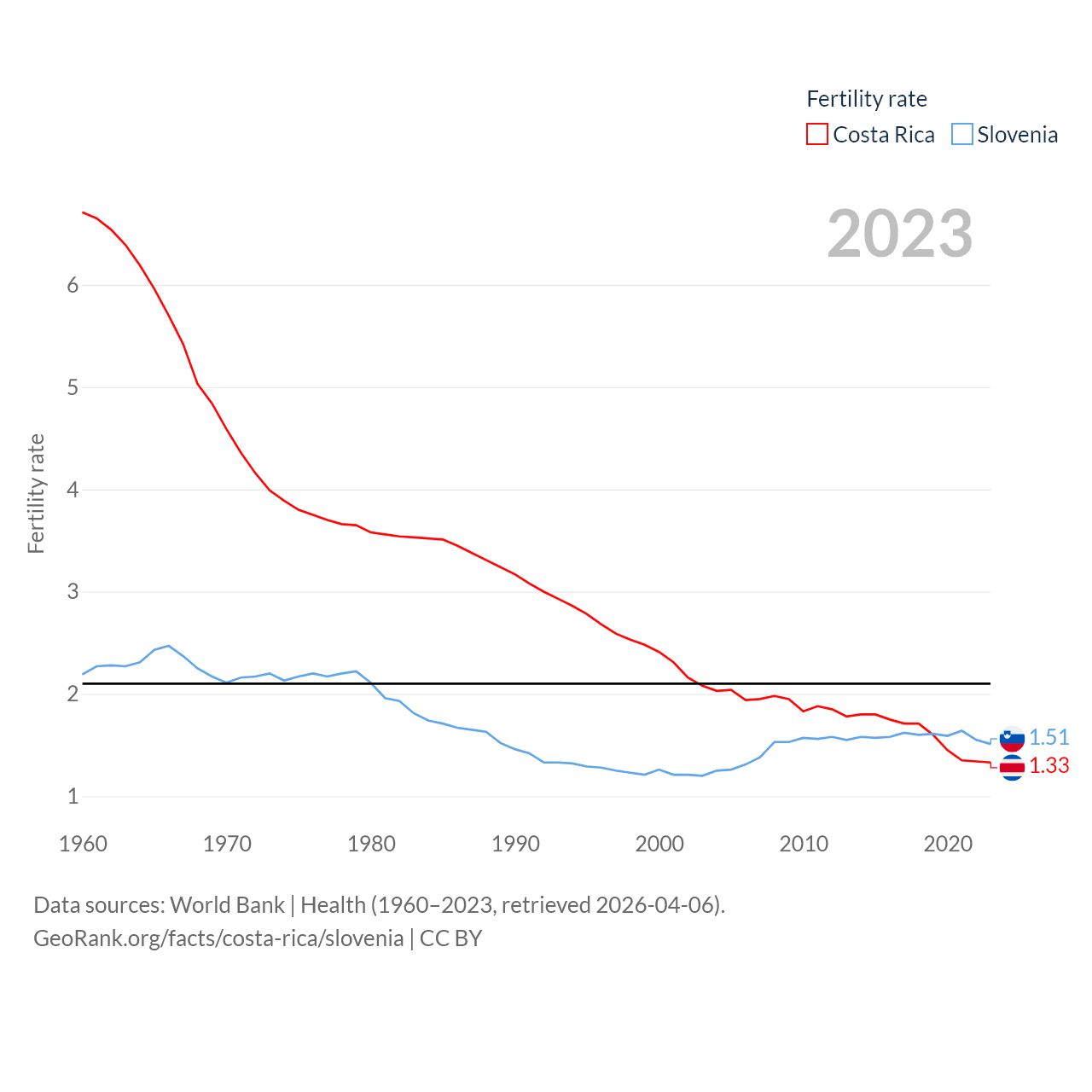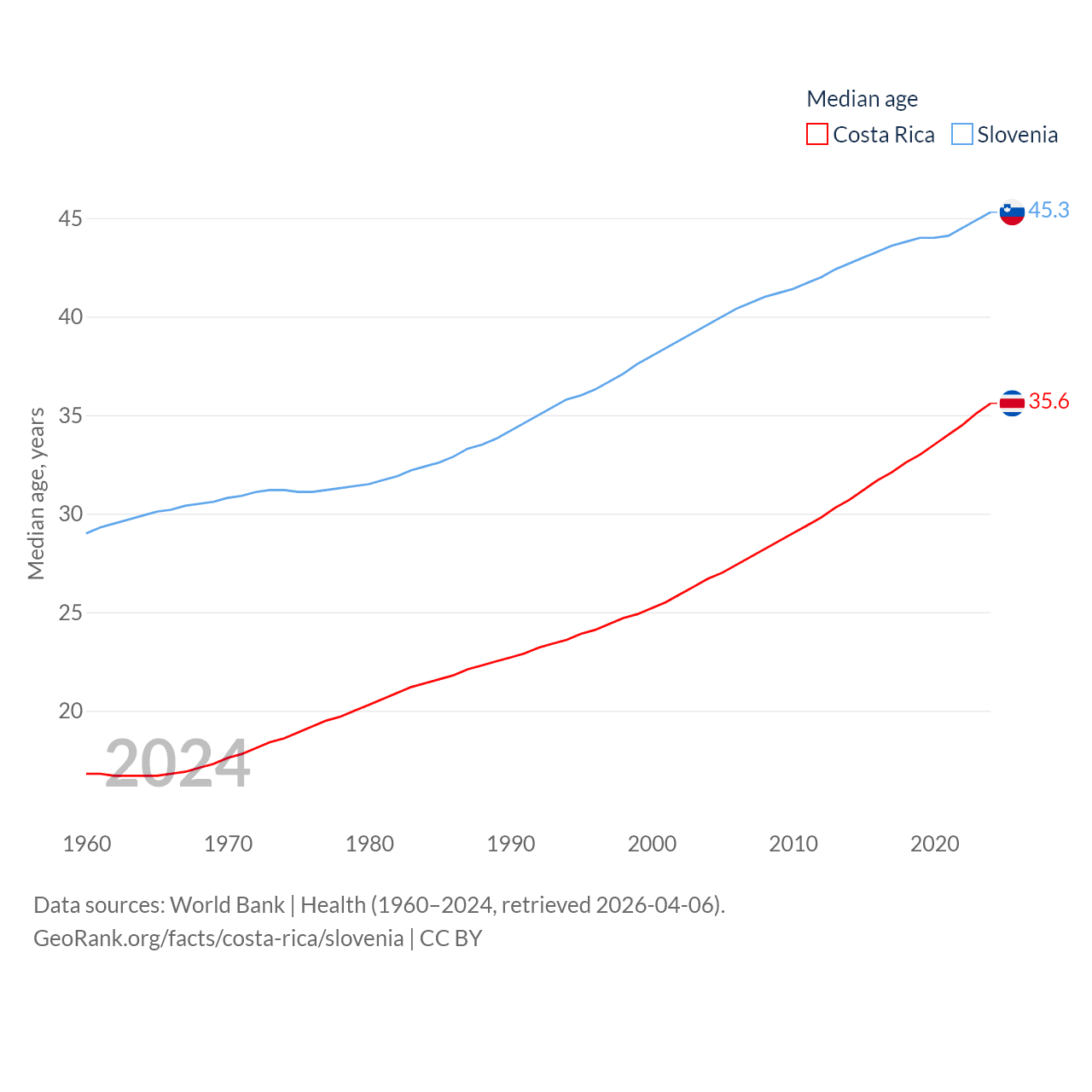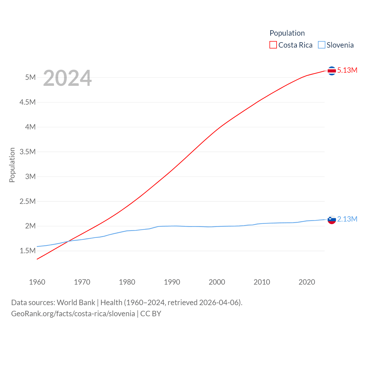 Costa Rica has a population of 5.13M (ranked 126/197), compared with 2.13M in Slovenia (ranked 147/197). Costa Rica's land area is 19,714 sq mi versus 7,774 sq mi for Slovenia (ranked 126th vs. 151st).