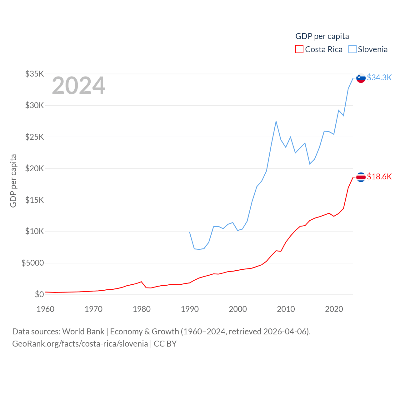 By GDP, Costa Rica ranks 73/197 ($95.4B) and Slovenia ranks 86/197 ($73B). By GDP per capita, Costa Rica ranks 62/197 ($18,587), while Slovenia ranks 34/197 ($34,301).