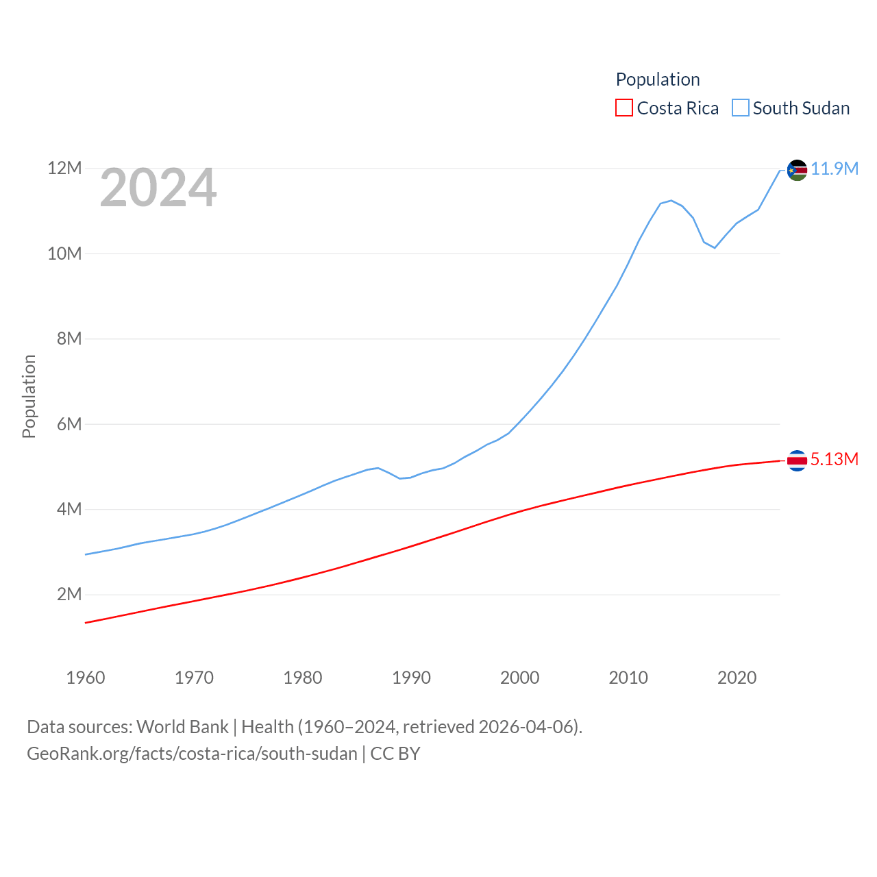 Costa Rica has a population of 5.13M (ranked 126/197), compared with 11.9M in South Sudan (ranked 81/197). Costa Rica's land area is 19,714 sq mi versus 243,990 sq mi for South Sudan (ranked 126th vs. 41st).