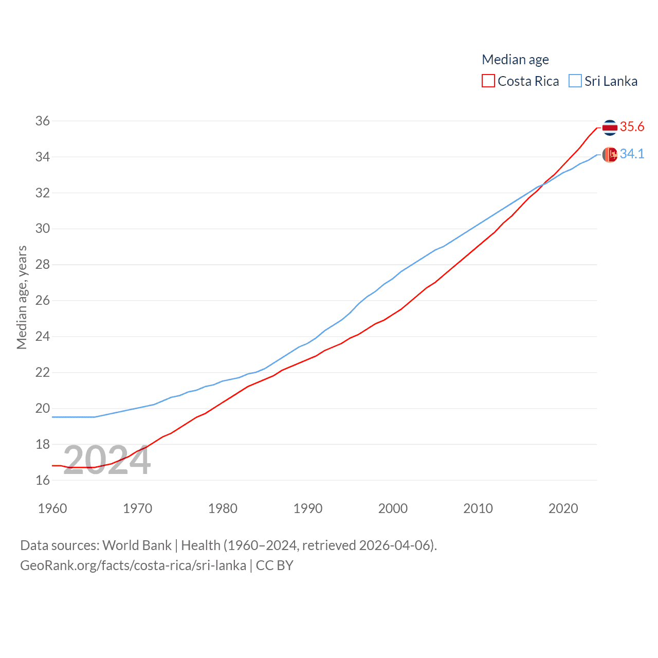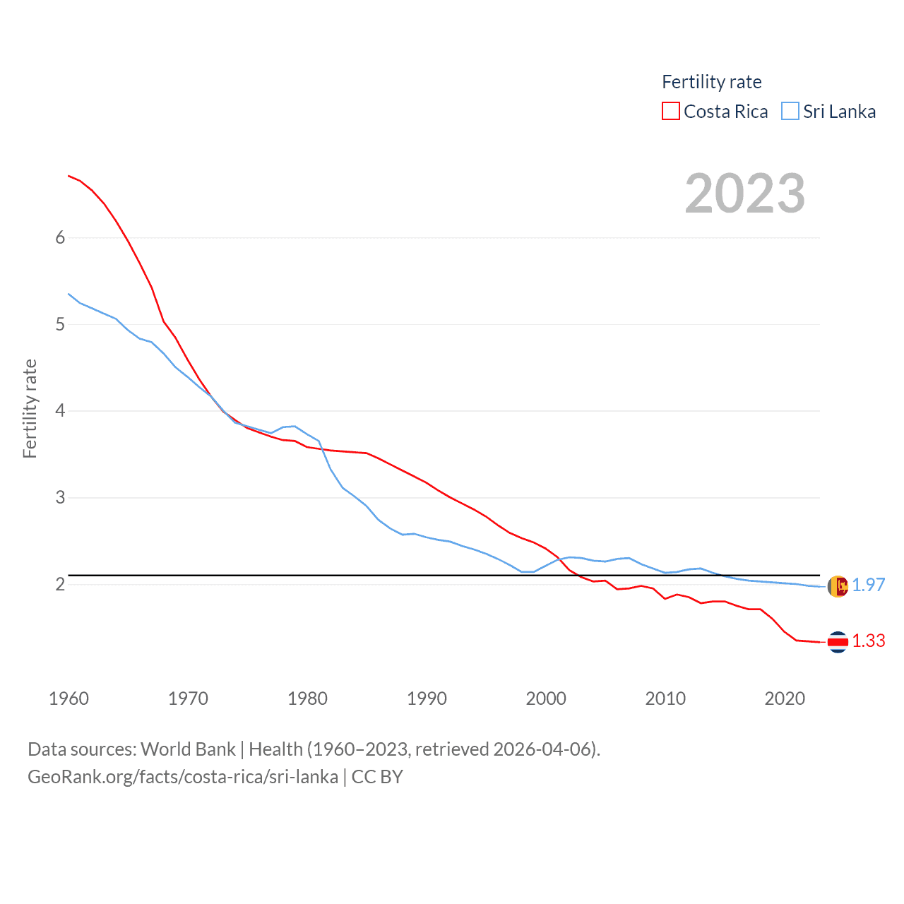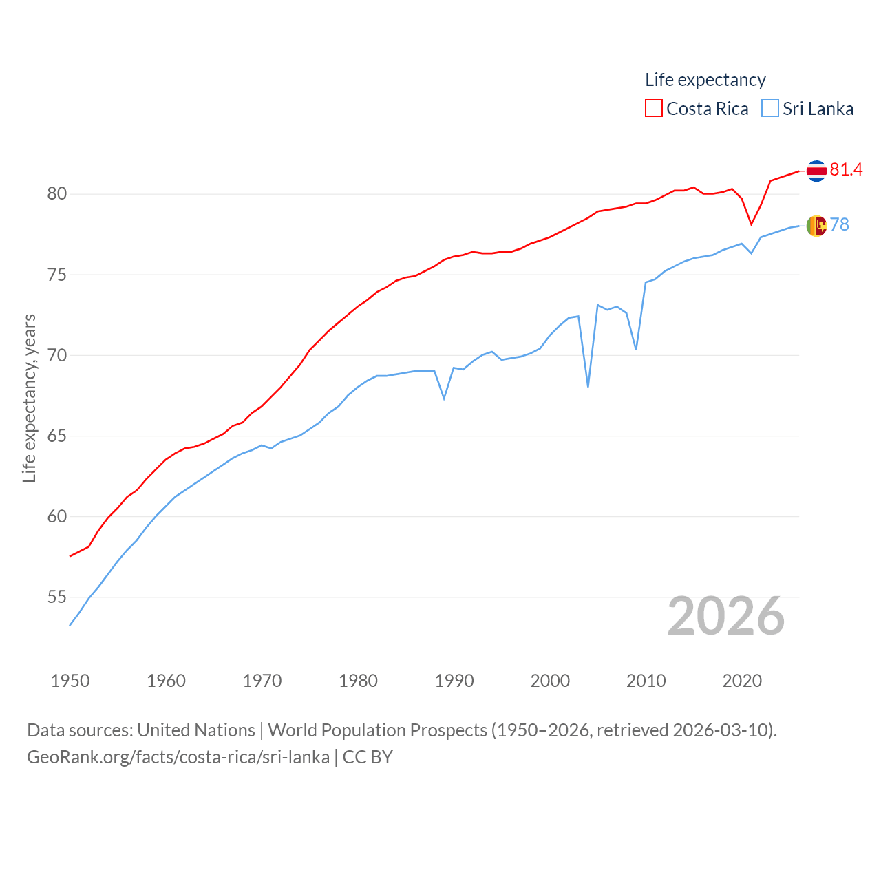 Costa Rica has a population of 5.13M (ranked 126/197), compared with 21.9M in Sri Lanka (ranked 61/197). Costa Rica's land area is 19,714 sq mi versus 23,884 sq mi for Sri Lanka (ranked 126th vs. 122nd).