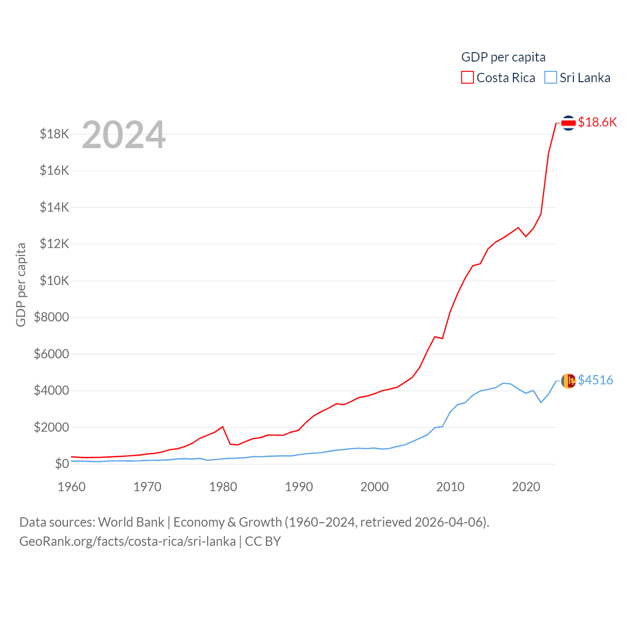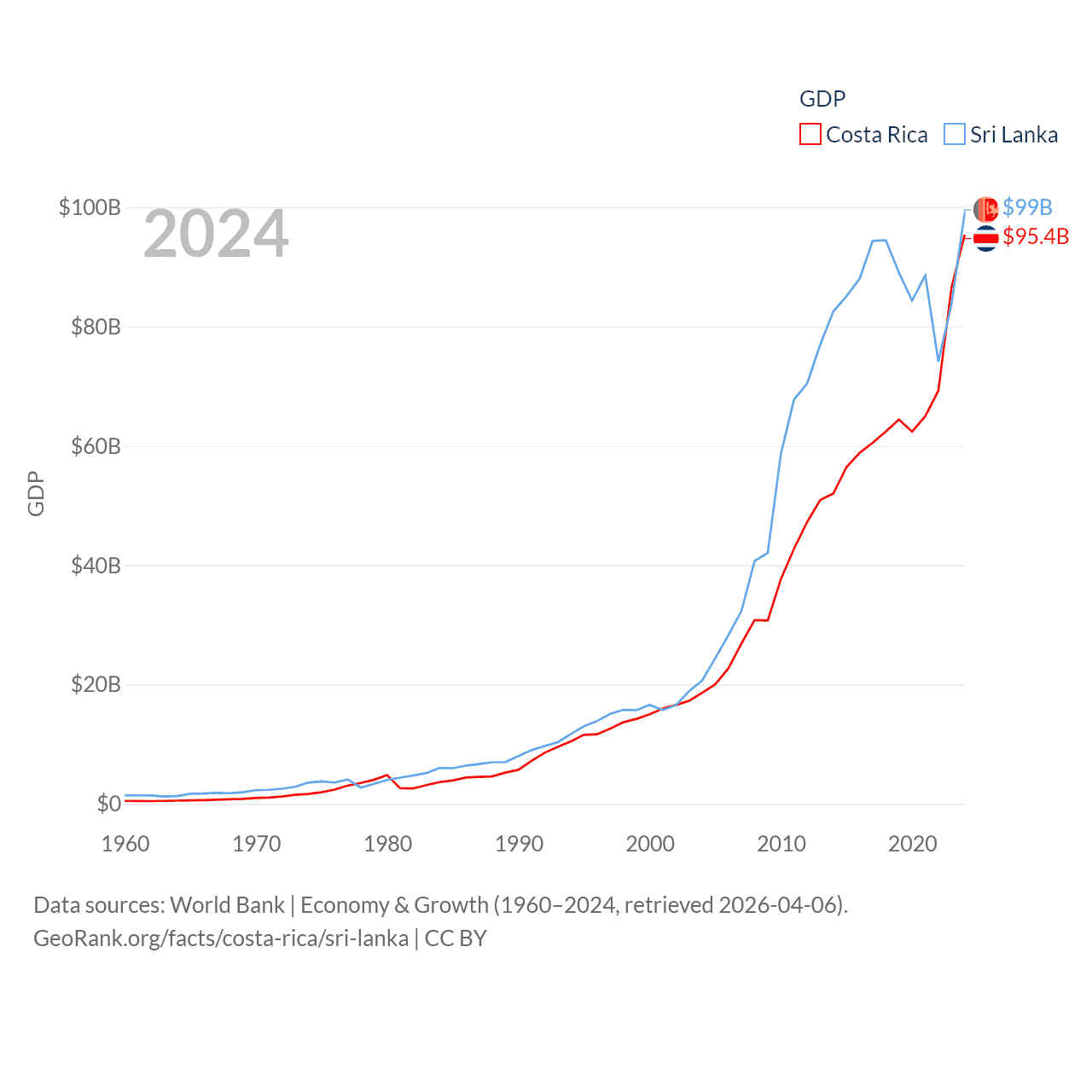 By GDP, Costa Rica ranks 73/197 ($95.4B) and Sri Lanka ranks 72/197 ($99B). By GDP per capita, Costa Rica ranks 62/197 ($18,587), while Sri Lanka ranks 124/197 ($4,516).