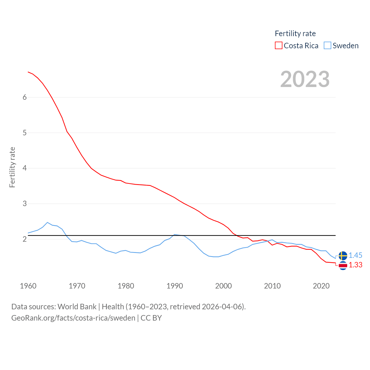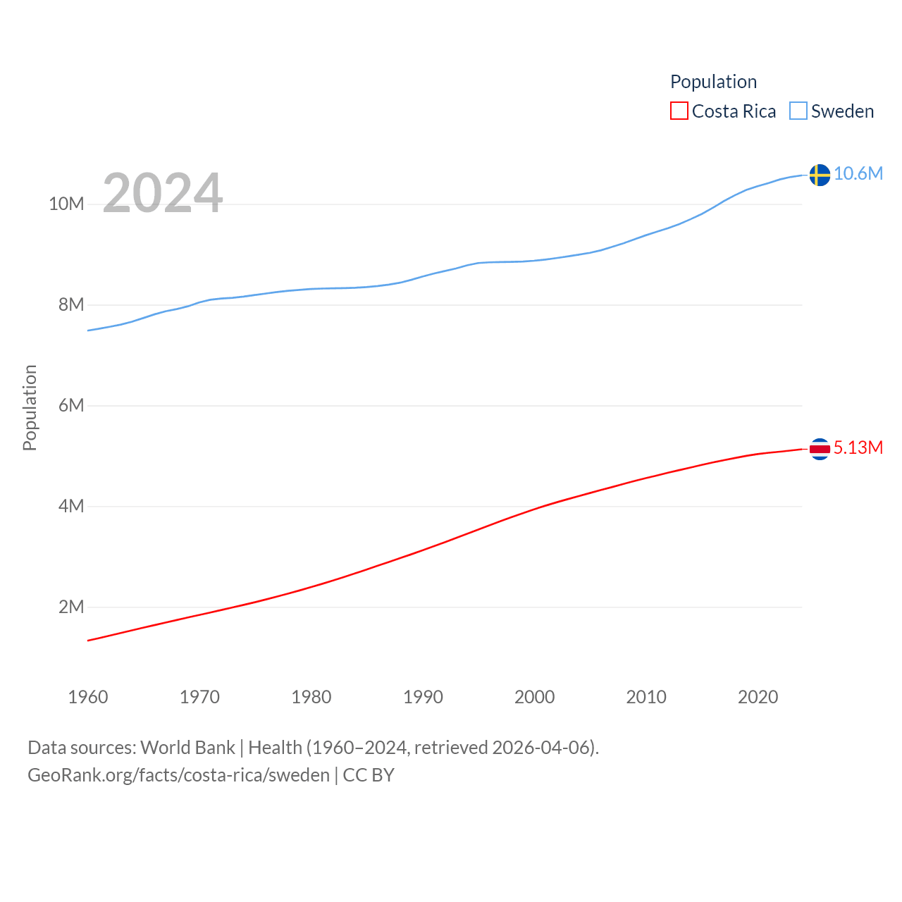 Costa Rica has a population of 5.13M (ranked 126/197), compared with 10.6M in Sweden (ranked 93/197). Costa Rica's land area is 19,714 sq mi versus 157,248 sq mi for Sweden (ranked 126th vs. 58th).