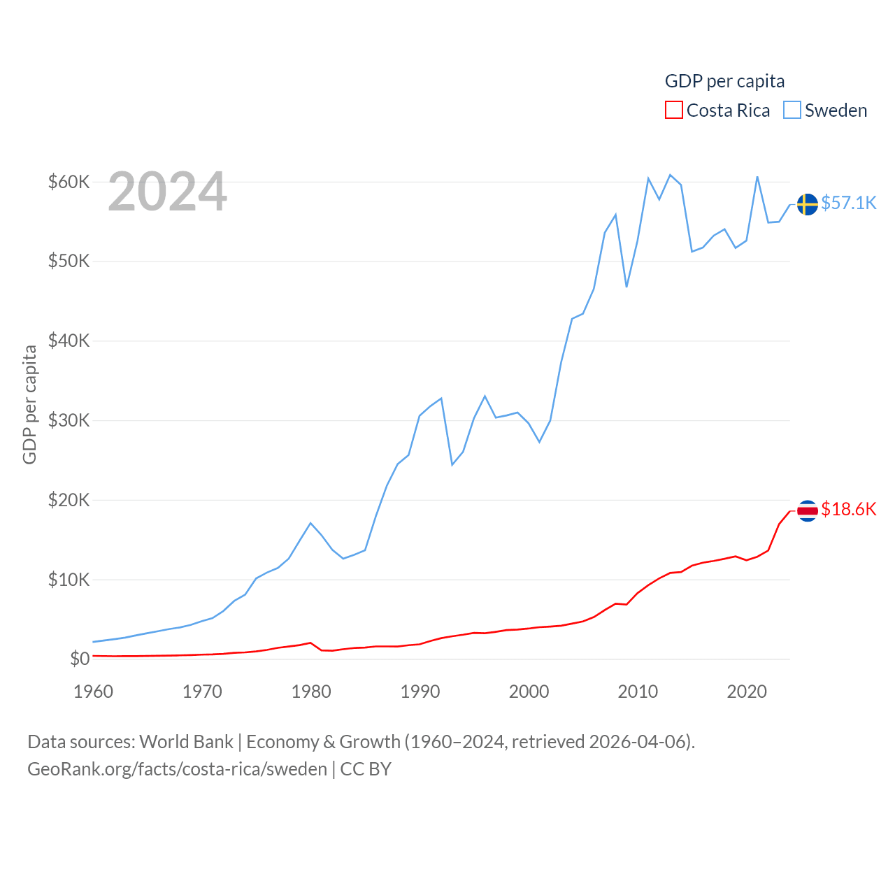 By GDP, Costa Rica ranks 73/197 ($95.4B) and Sweden ranks 26/197 ($604B). By GDP per capita, Costa Rica ranks 62/197 ($18,587), while Sweden ranks 17/197 ($57,117).