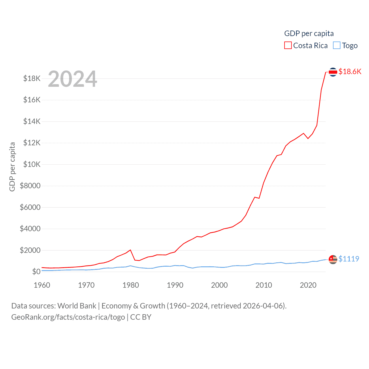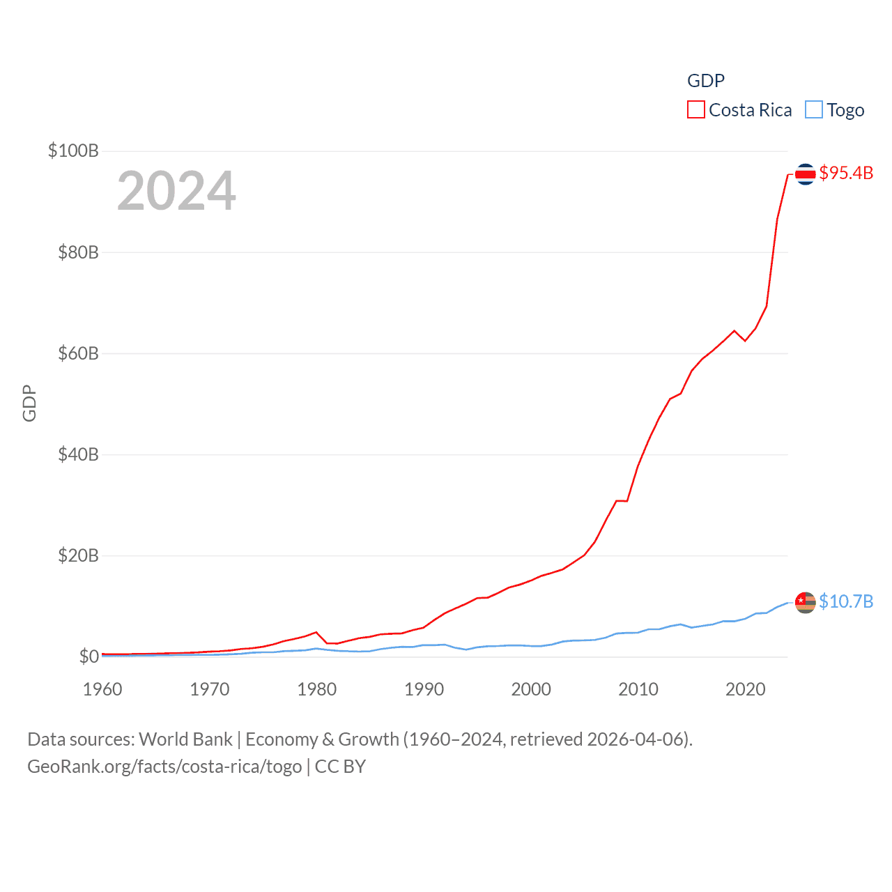 By GDP, Costa Rica ranks 73/197 ($95.4B) and Togo ranks 154/197 ($10.7B). By GDP per capita, Costa Rica ranks 62/197 ($18,587), while Togo ranks 172/197 ($1,119).