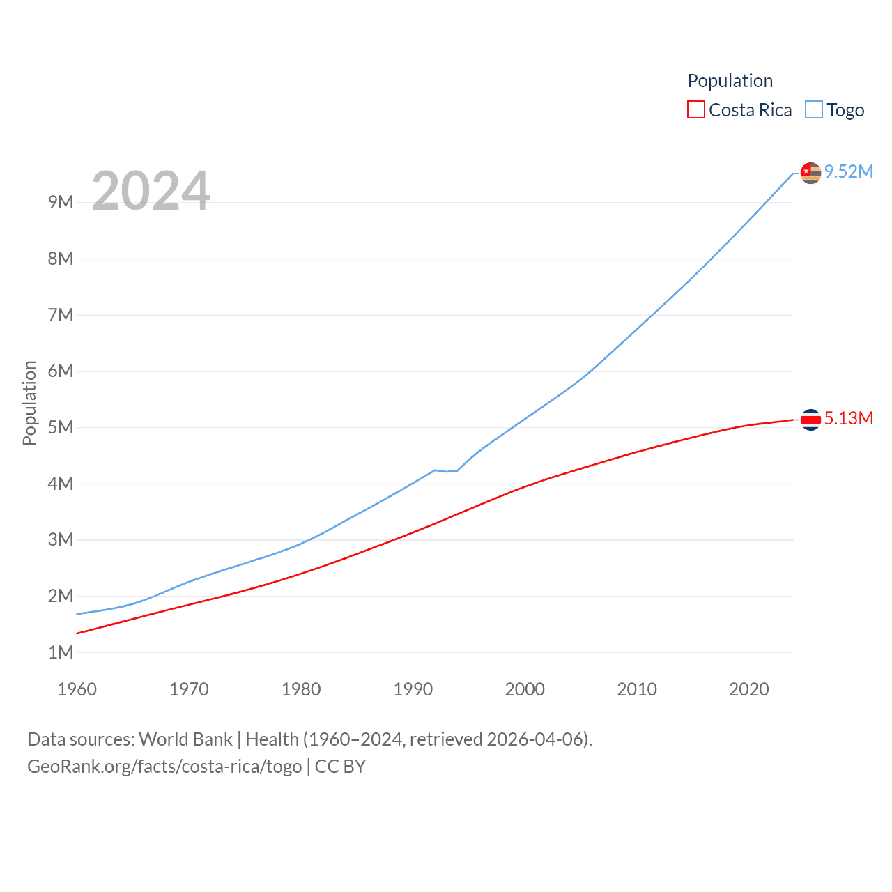 Costa Rica has a population of 5.13M (ranked 126/197), compared with 9.52M in Togo (ranked 98/197). Costa Rica's land area is 19,714 sq mi versus 21,000 sq mi for Togo (ranked 126th vs. 124th).
