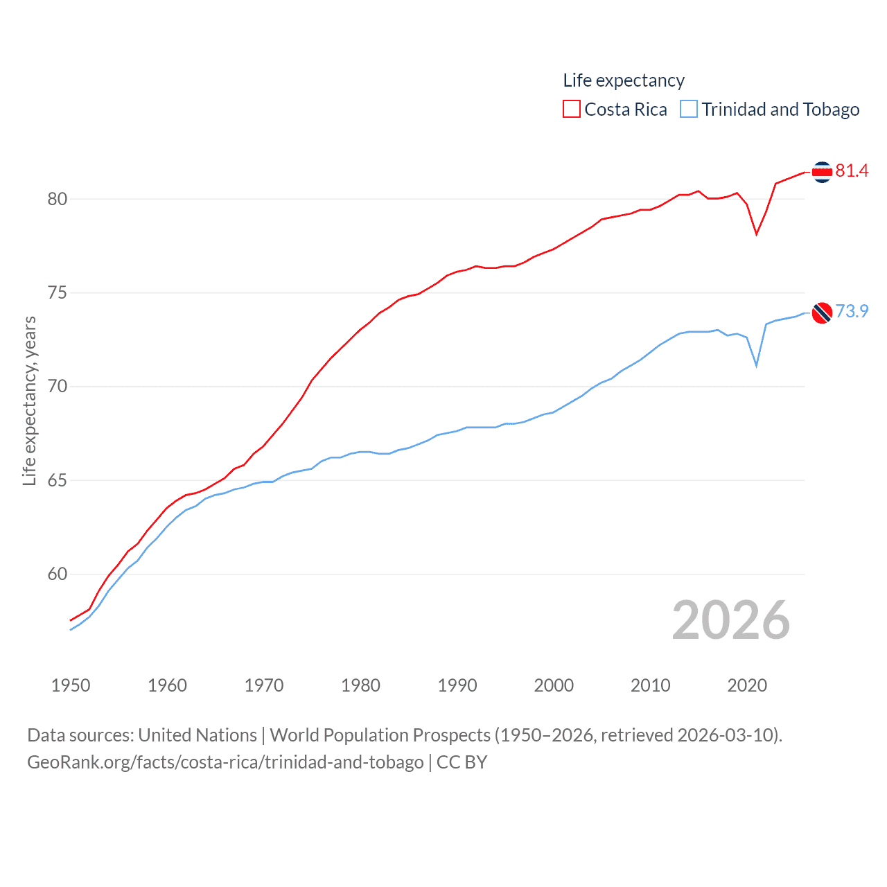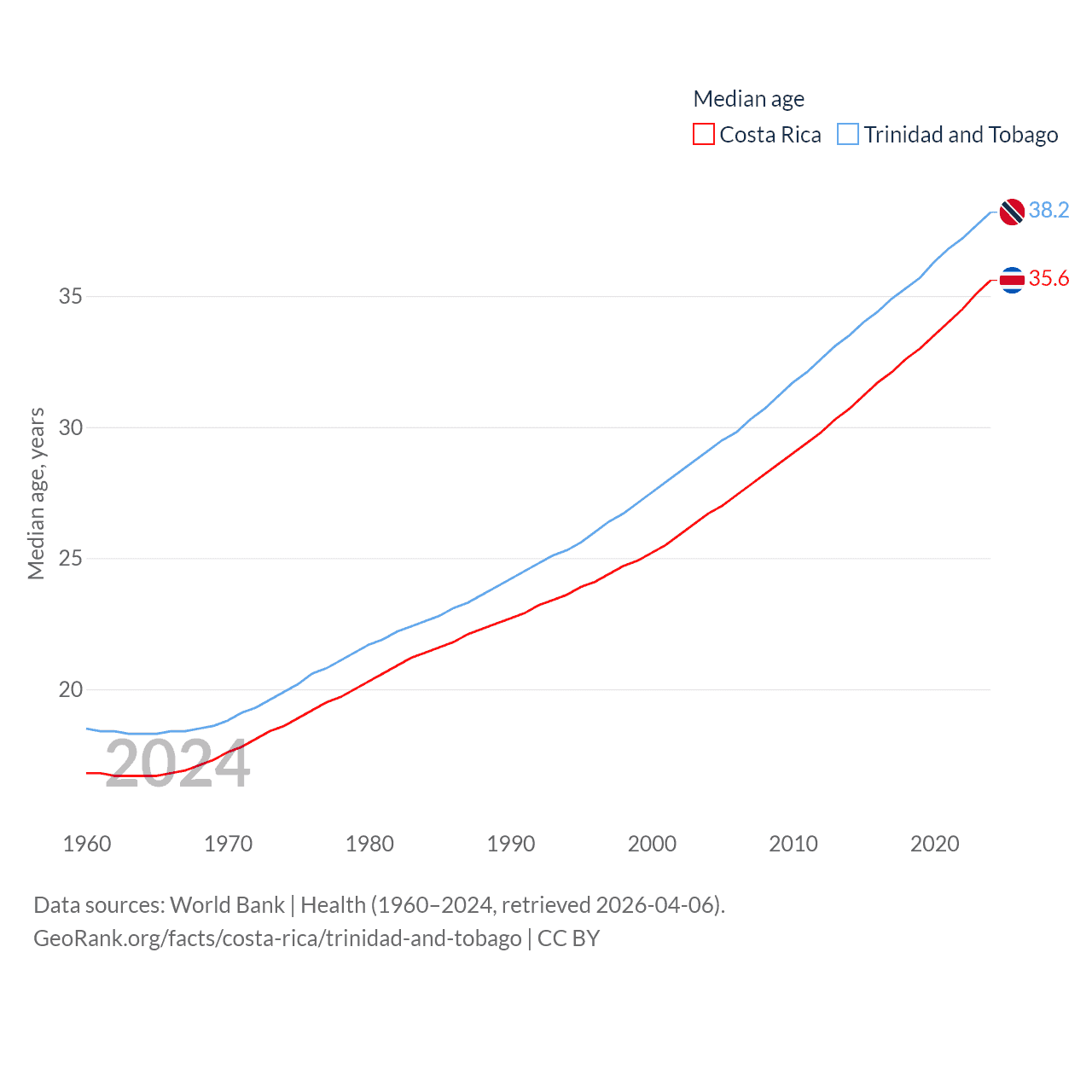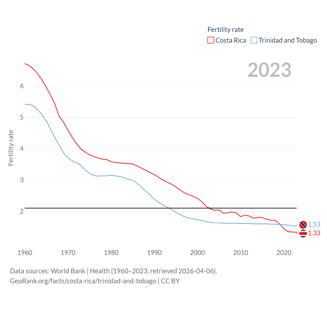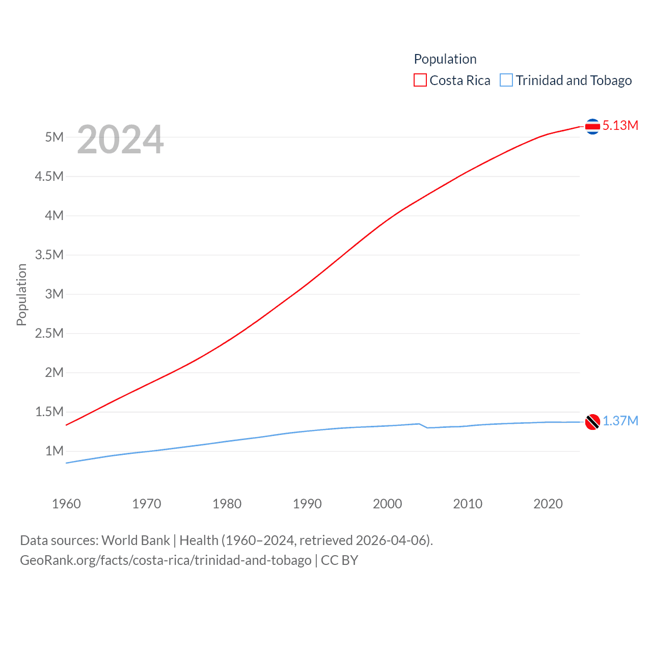 Costa Rica has a population of 5.13M (ranked 126/197), compared with 1.37M in Trinidad and Tobago (ranked 154/197). Costa Rica's land area is 19,714 sq mi versus 1,981 sq mi for Trinidad and Tobago (ranked 126th vs. 166th).