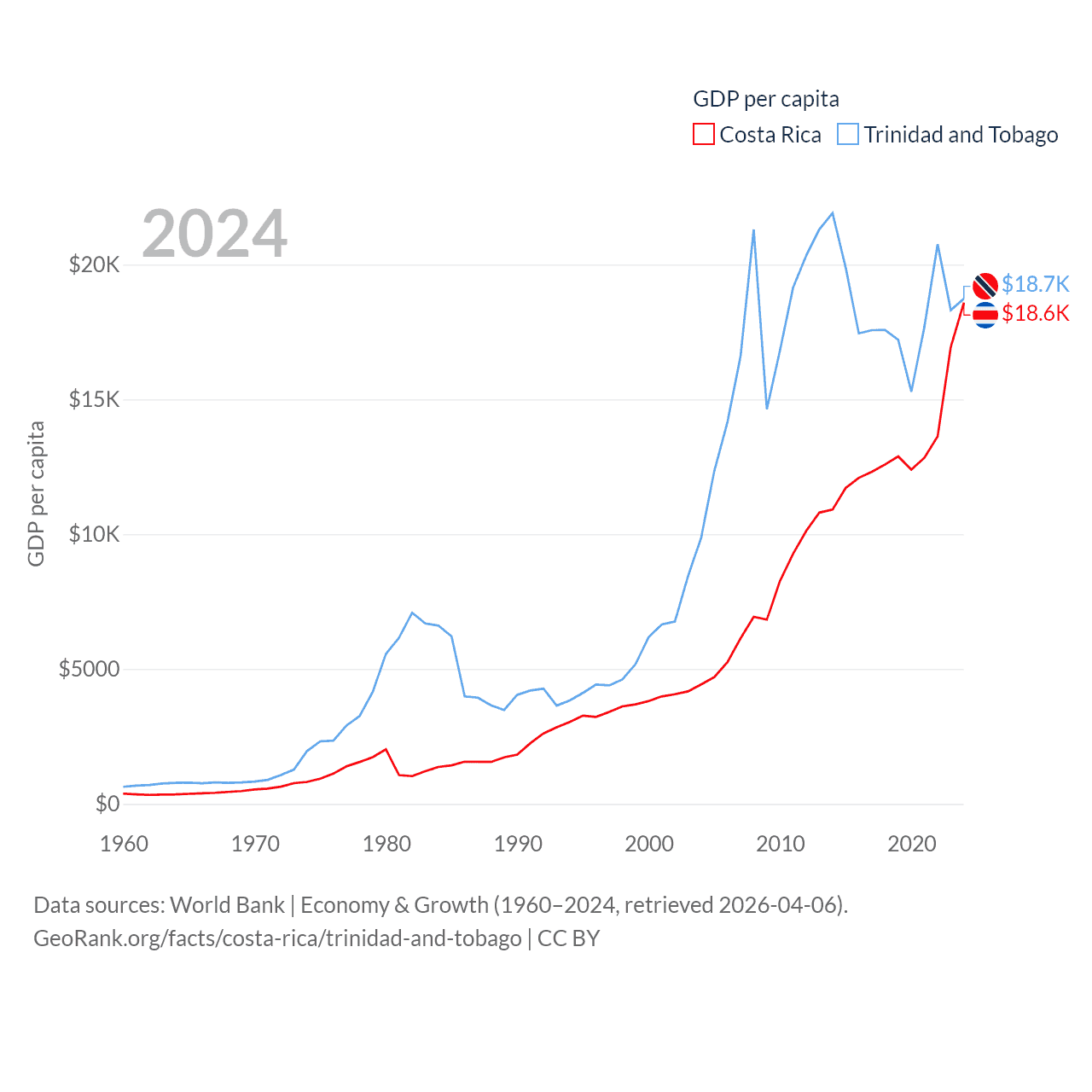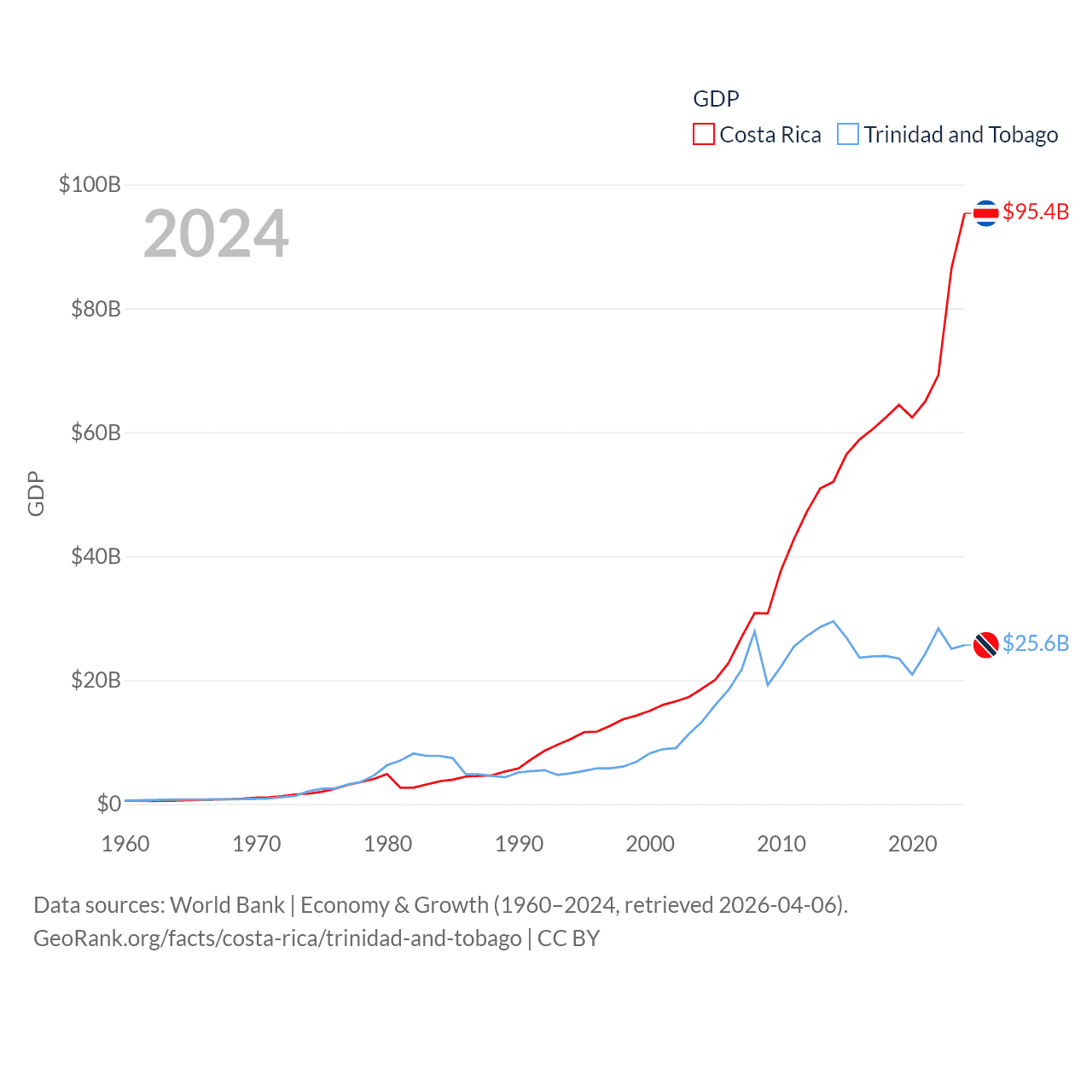 By GDP, Costa Rica ranks 73/197 ($95.4B) and Trinidad and Tobago ranks 115/197 ($25.6B). By GDP per capita, Costa Rica ranks 62/197 ($18,587), while Trinidad and Tobago ranks 61/197 ($18,733).