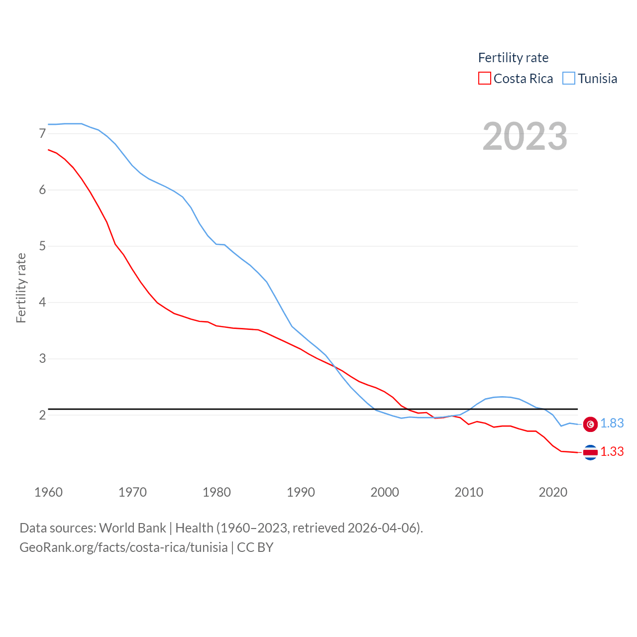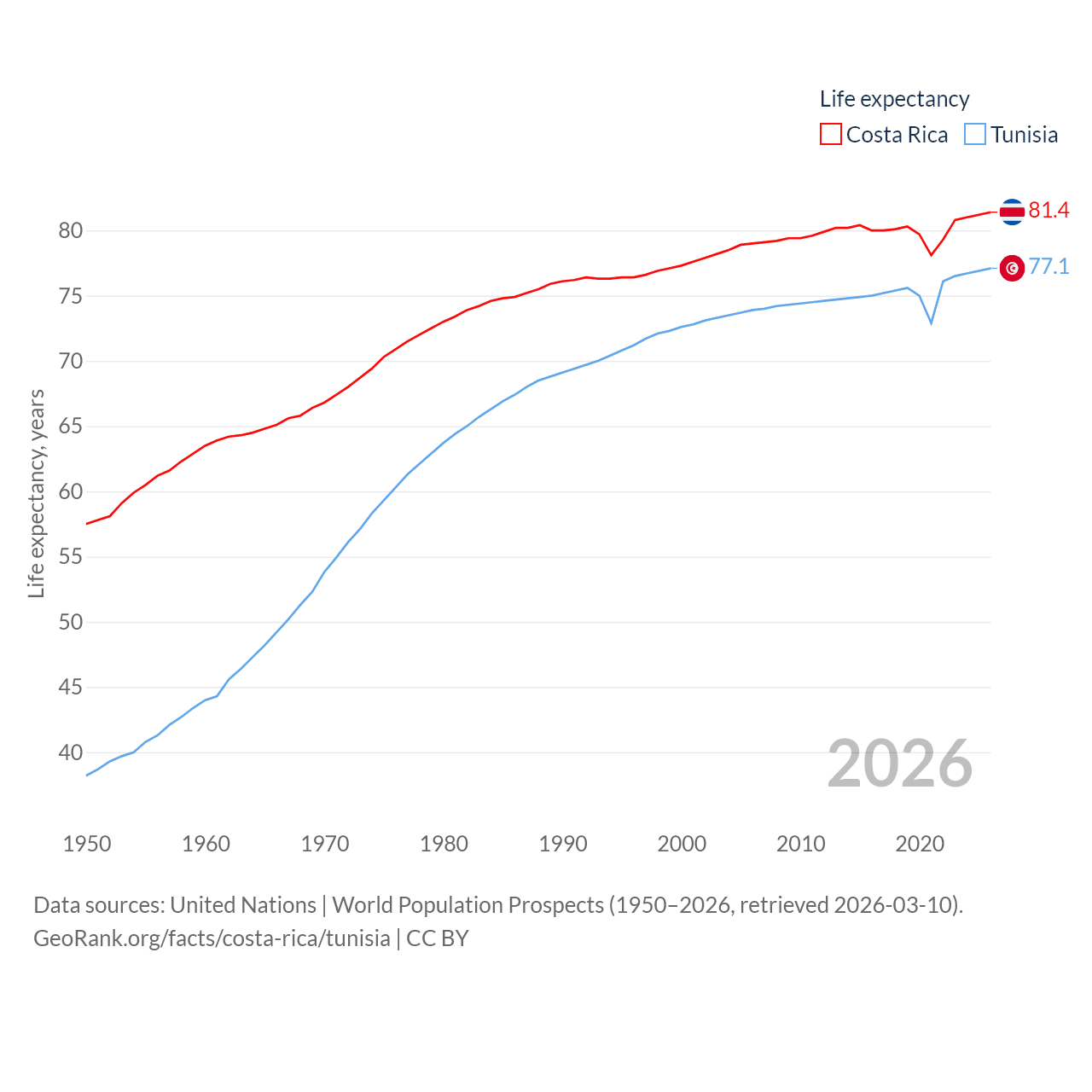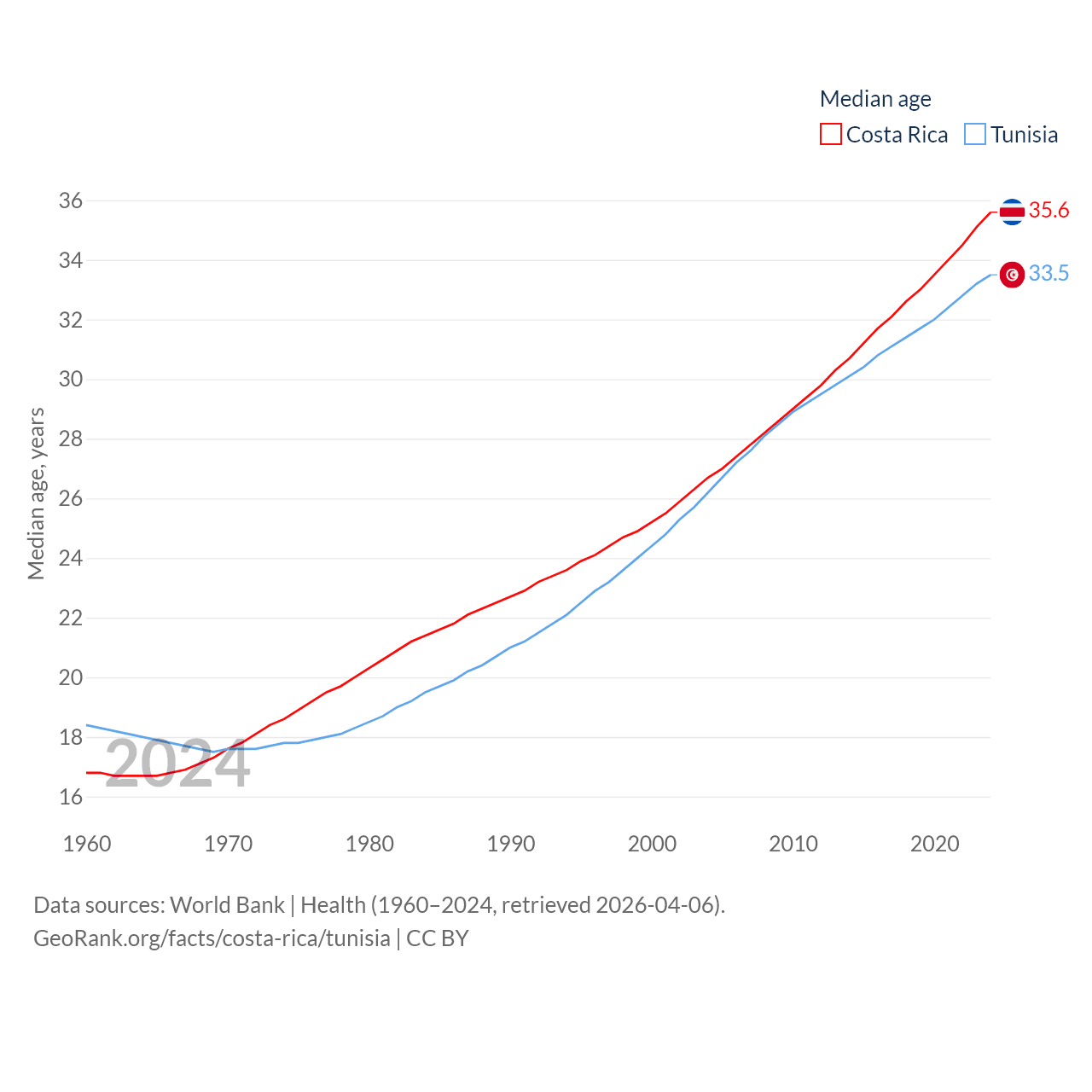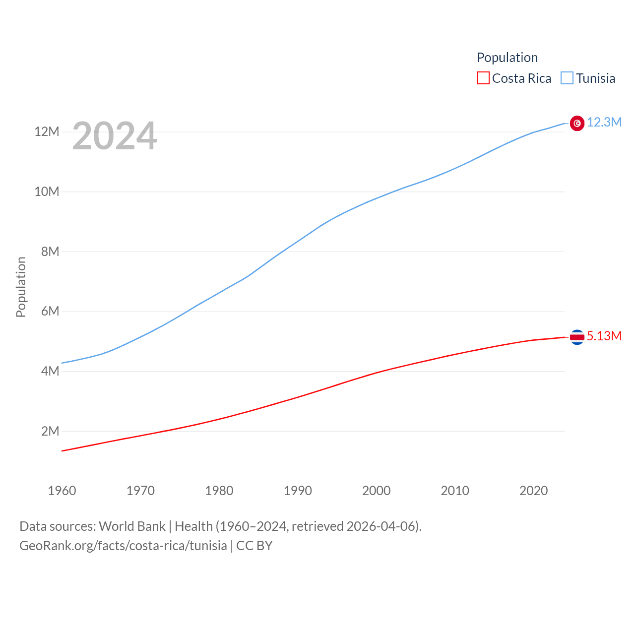 Costa Rica has a population of 5.13M (ranked 126/197), compared with 12.3M in Tunisia (ranked 80/197). Costa Rica's land area is 19,714 sq mi versus 59,985 sq mi for Tunisia (ranked 126th vs. 91st).