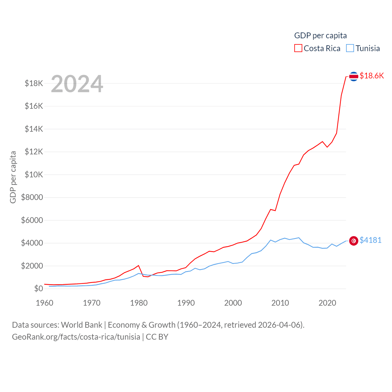 By GDP, Costa Rica ranks 73/197 ($95.4B) and Tunisia ranks 93/197 ($51.3B). By GDP per capita, Costa Rica ranks 62/197 ($18,587), while Tunisia ranks 129/197 ($4,181).