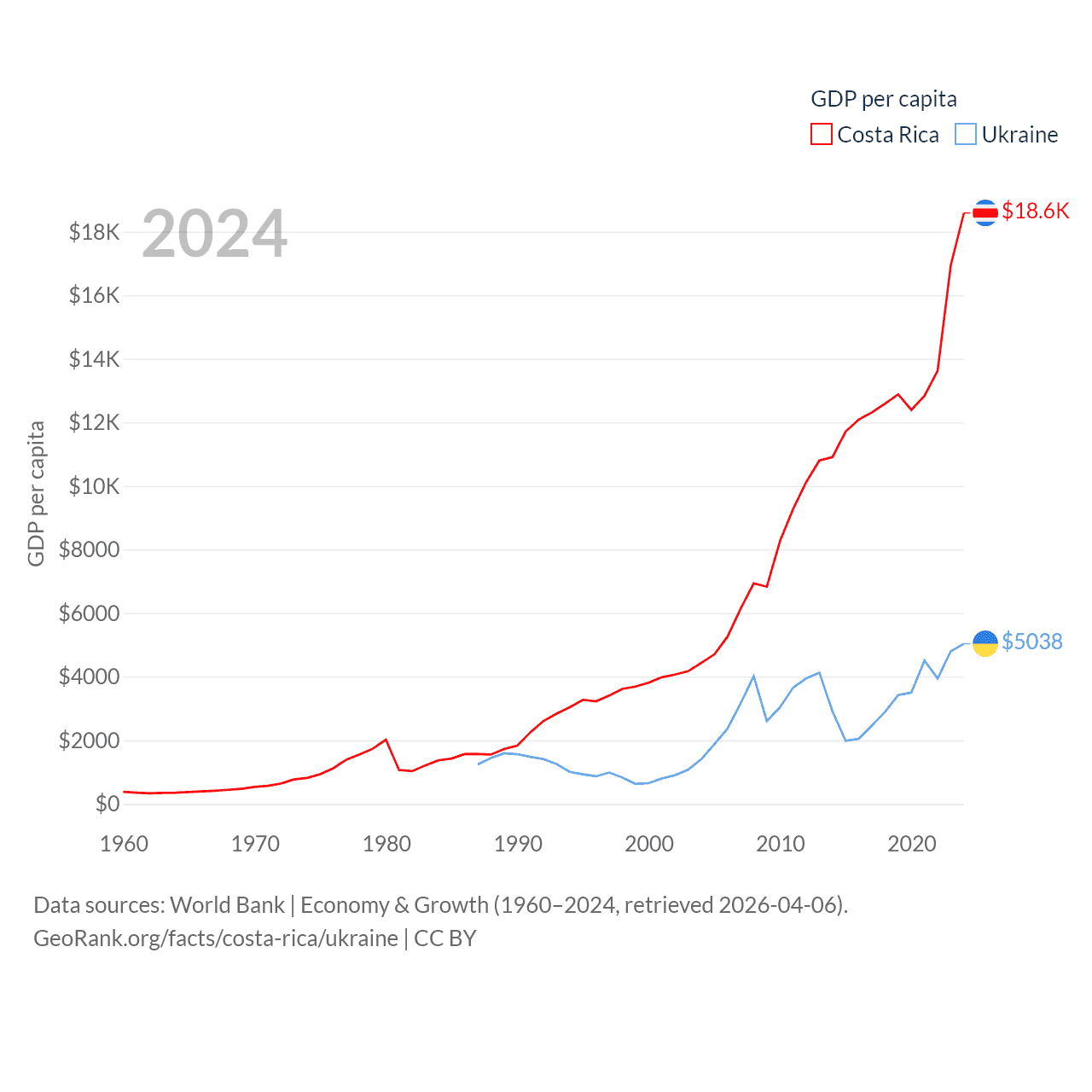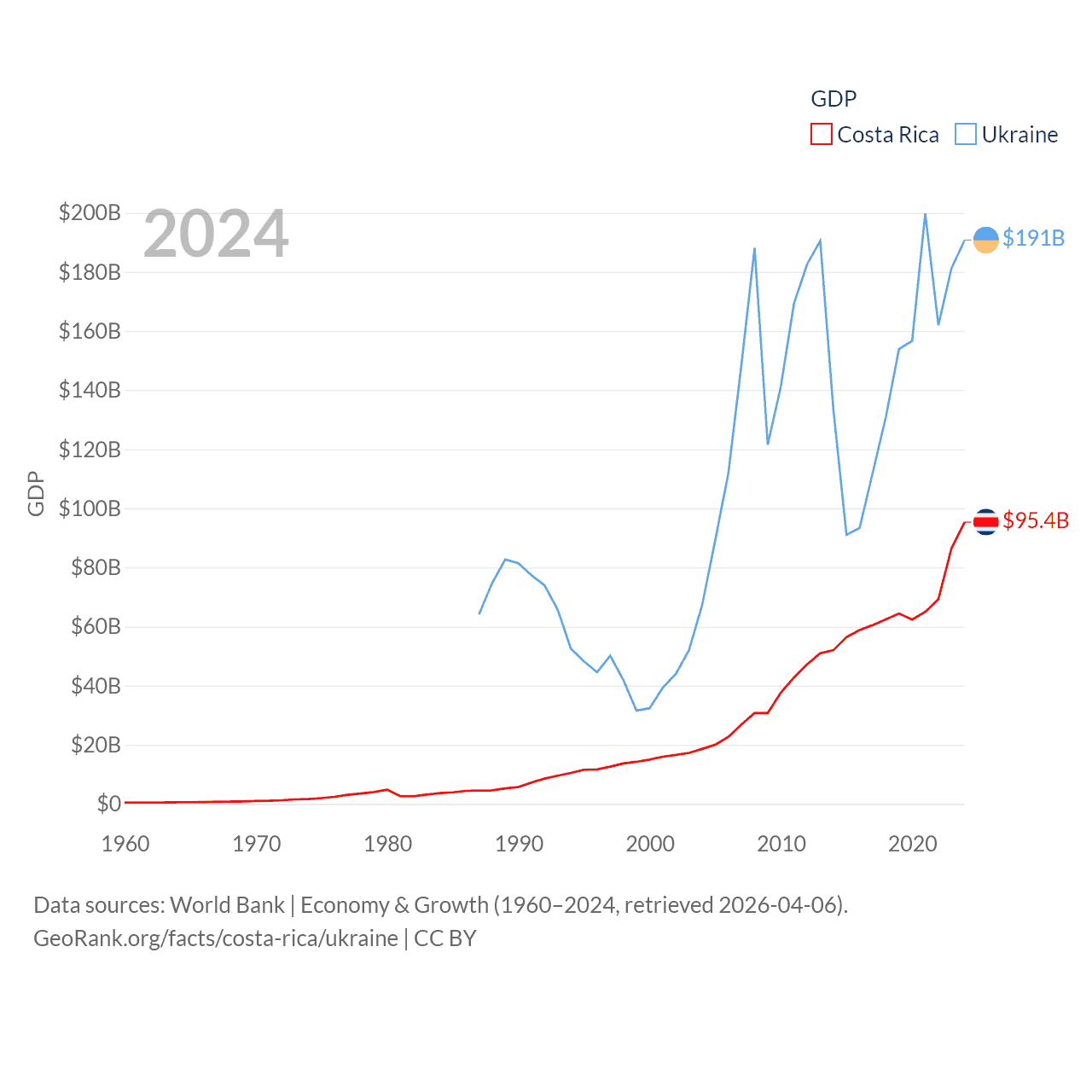 By GDP, Costa Rica ranks 73/197 ($95.4B) and Ukraine ranks 57/197 ($191B). By GDP per capita, Costa Rica ranks 62/197 ($18,587), while Ukraine ranks 120/197 ($5,038).