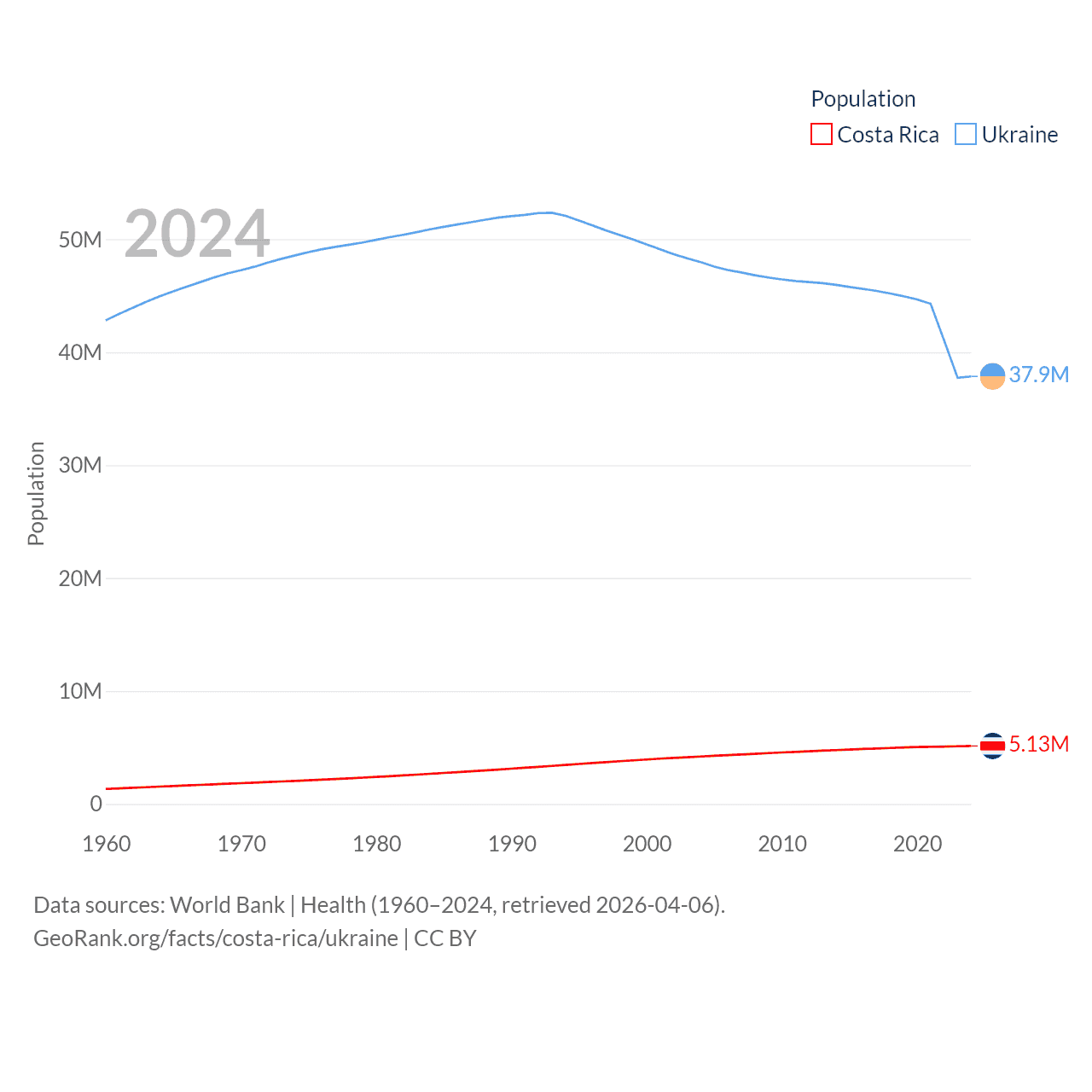 Costa Rica has a population of 5.13M (ranked 126/197), compared with 37.9M in Ukraine (ranked 41/197). Costa Rica's land area is 19,714 sq mi versus 223,708 sq mi for Ukraine (ranked 126th vs. 46th).
