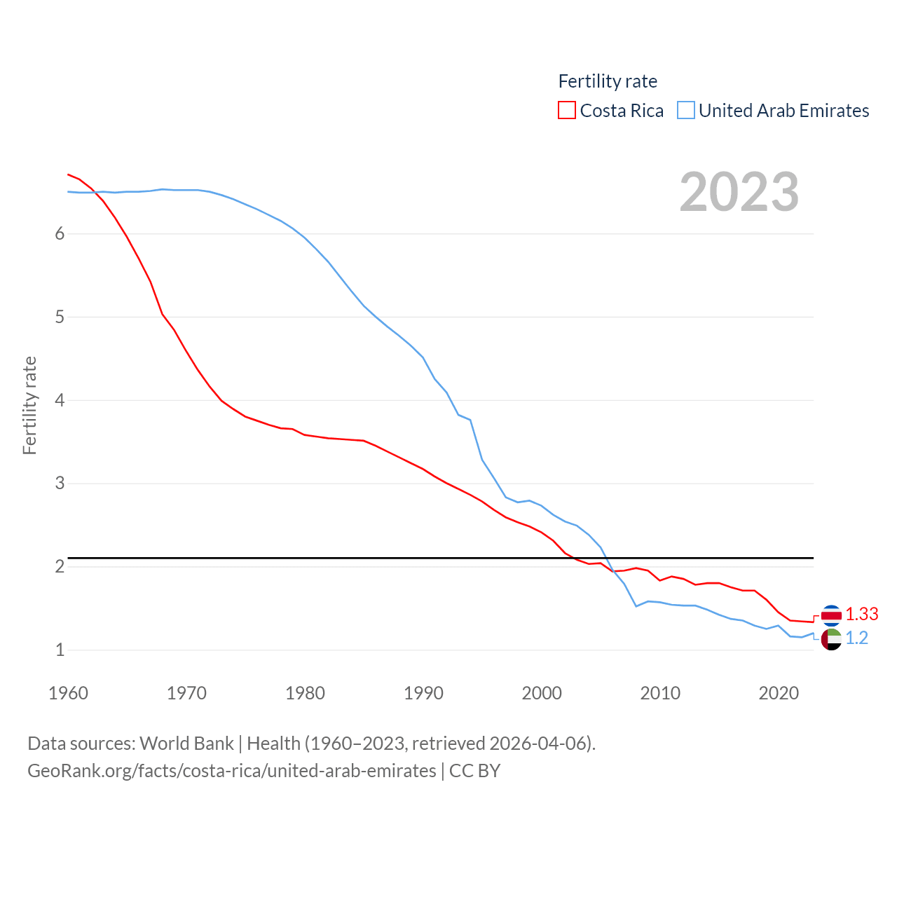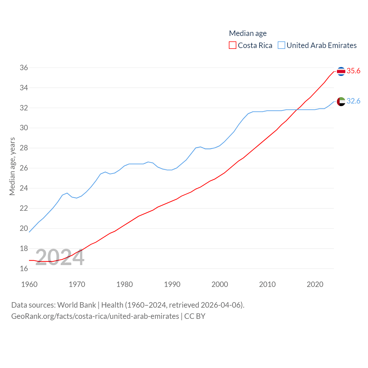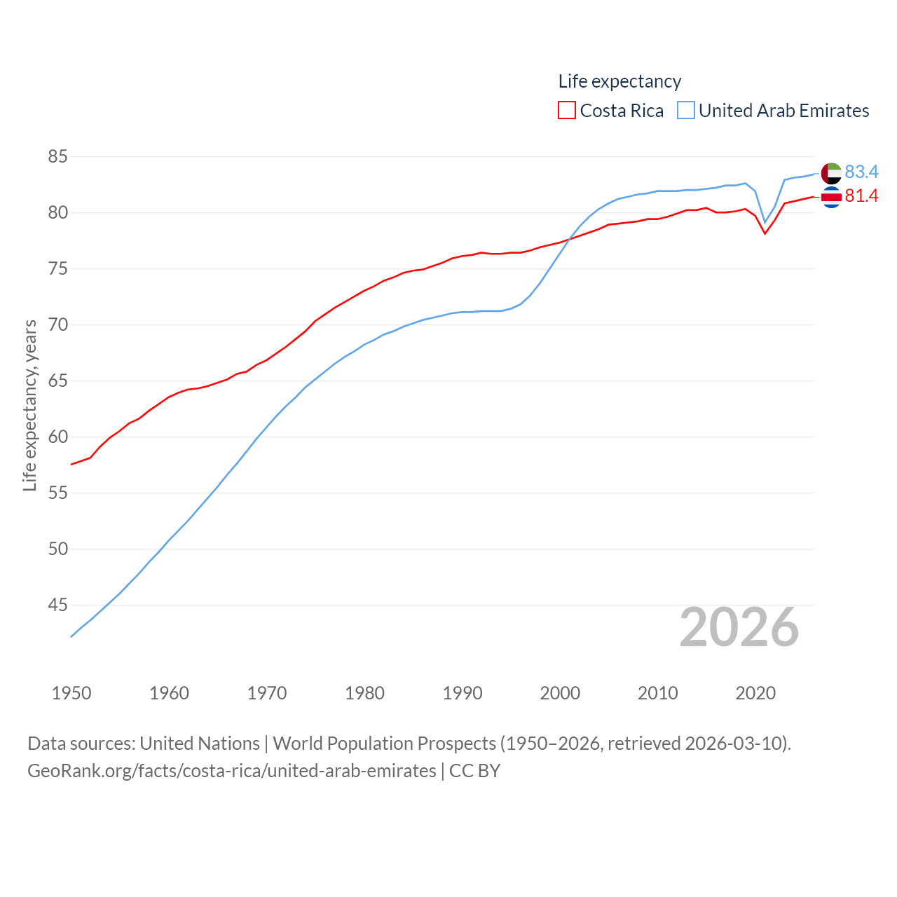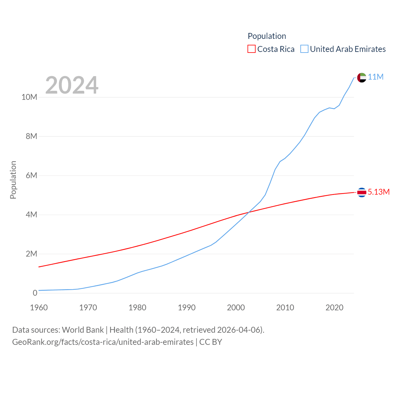 Costa Rica has a population of 5.13M (ranked 126/197), compared with 11M in The United Arab Emirates (ranked 86/197). Costa Rica's land area is 19,714 sq mi versus 27,421 sq mi for The United Arab Emirates (ranked 126th vs. 117th).