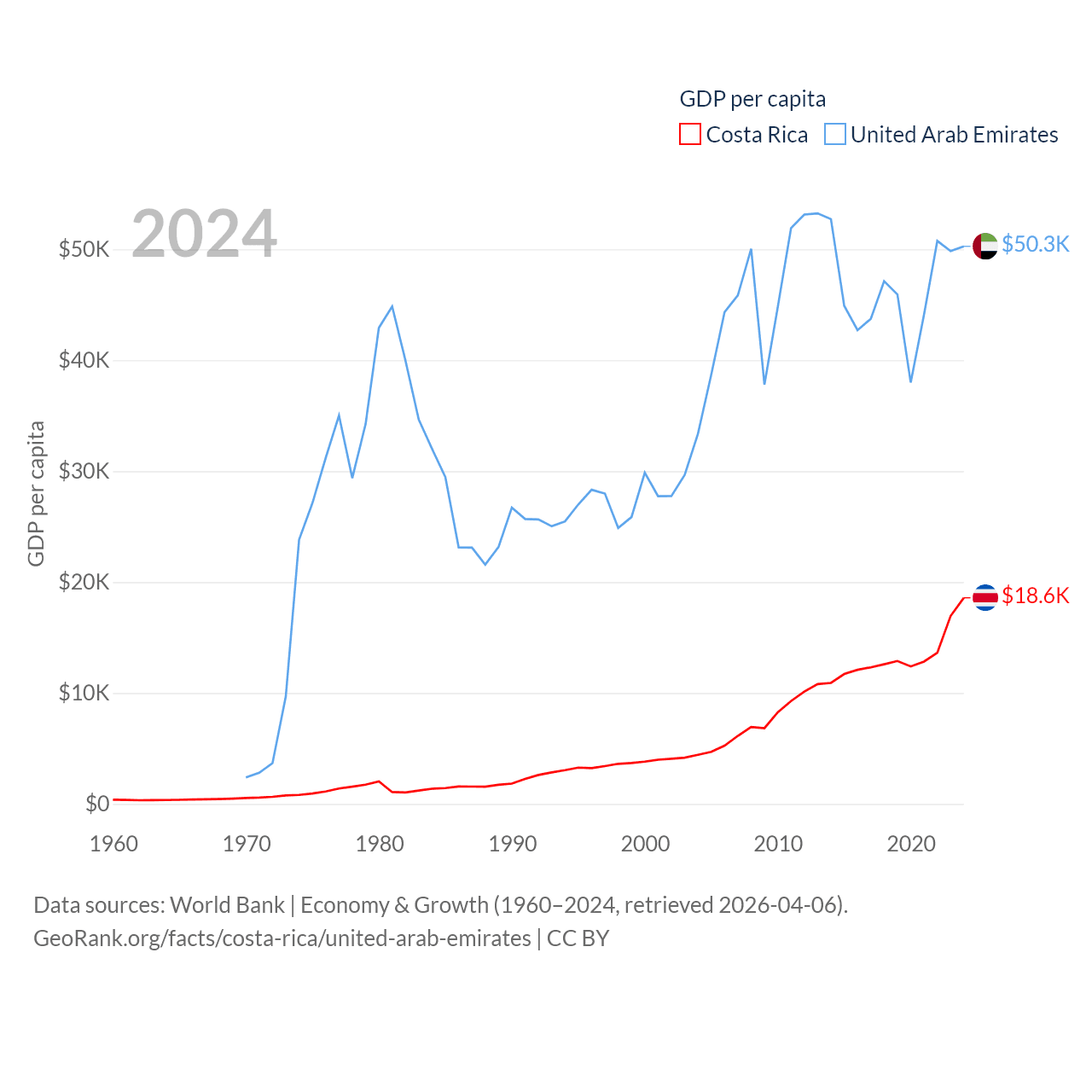 By GDP, Costa Rica ranks 73/197 ($95.4B) and The United Arab Emirates ranks 27/197 ($552B). By GDP per capita, Costa Rica ranks 62/197 ($18,587), while The United Arab Emirates ranks 24/197 ($50,274).