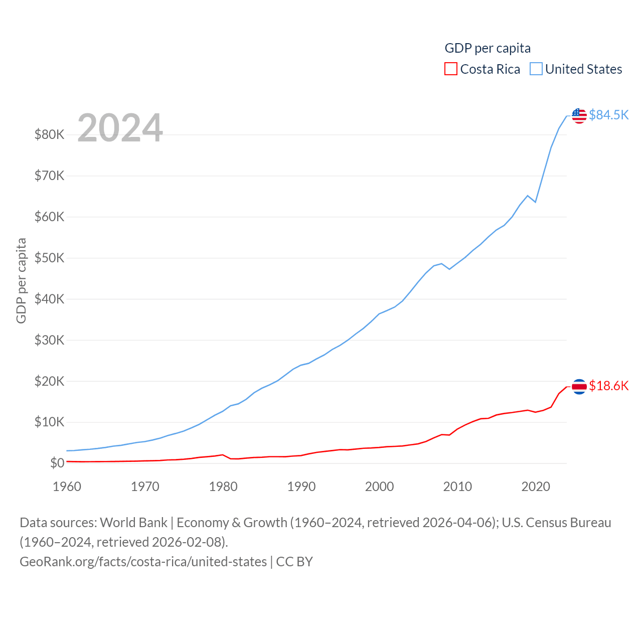 By GDP, Costa Rica ranks 73/197 ($95.4B) and The United States ranks 1/197 ($28.8T). By GDP per capita, Costa Rica ranks 62/197 ($18,587), while The United States ranks 10/197 ($84,534).