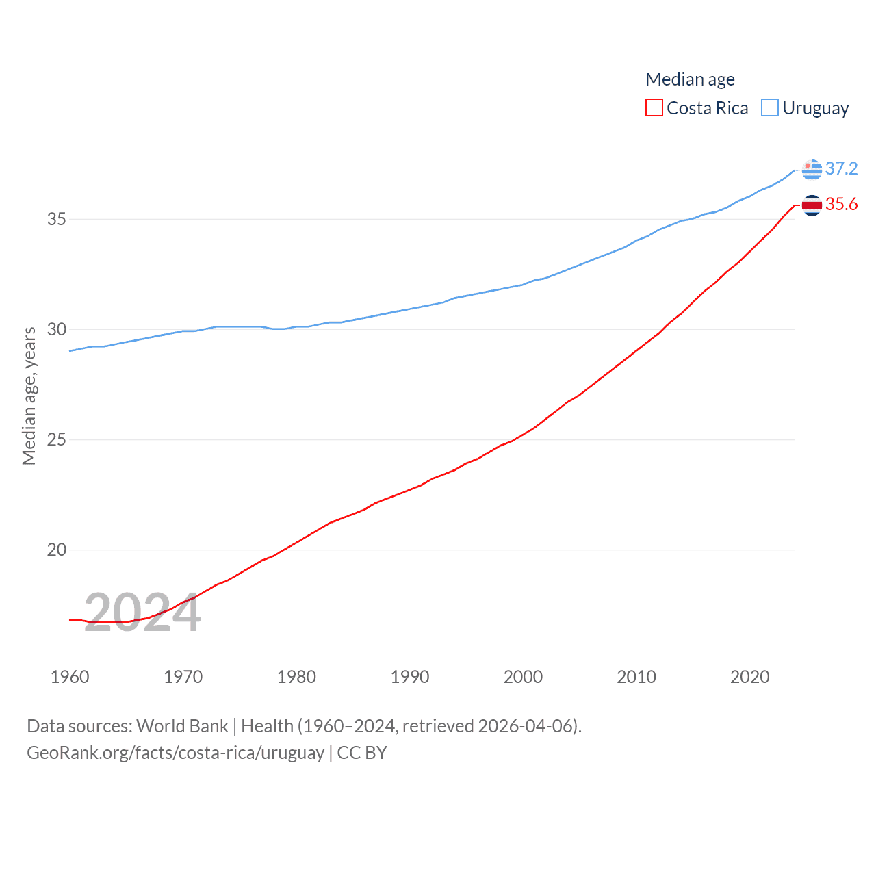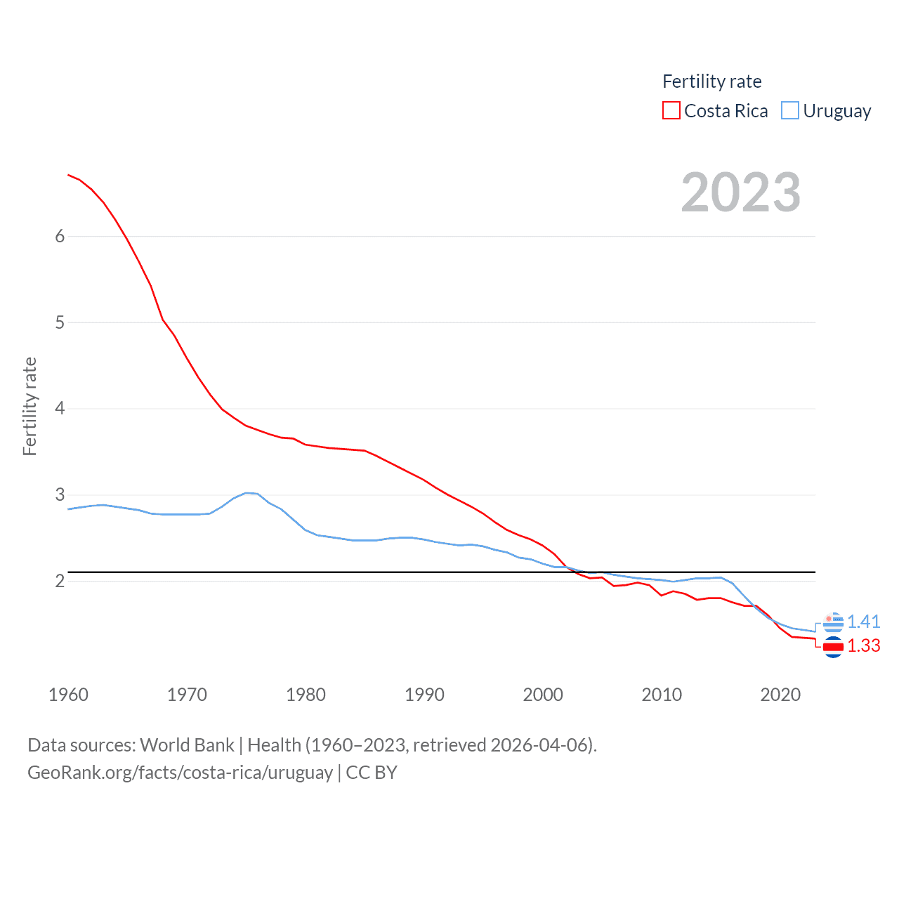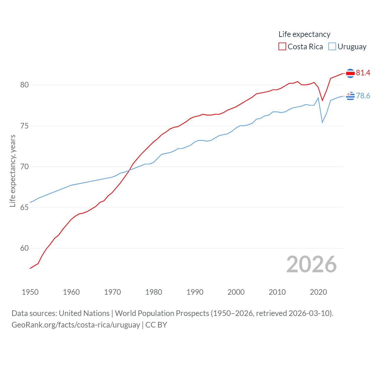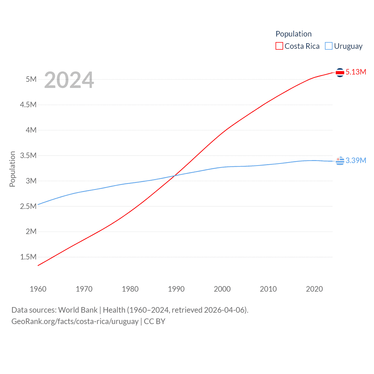 Costa Rica has a population of 5.13M (ranked 126/197), compared with 3.39M in Uruguay (ranked 133/197). Costa Rica's land area is 19,714 sq mi versus 67,576 sq mi for Uruguay (ranked 126th vs. 89th).