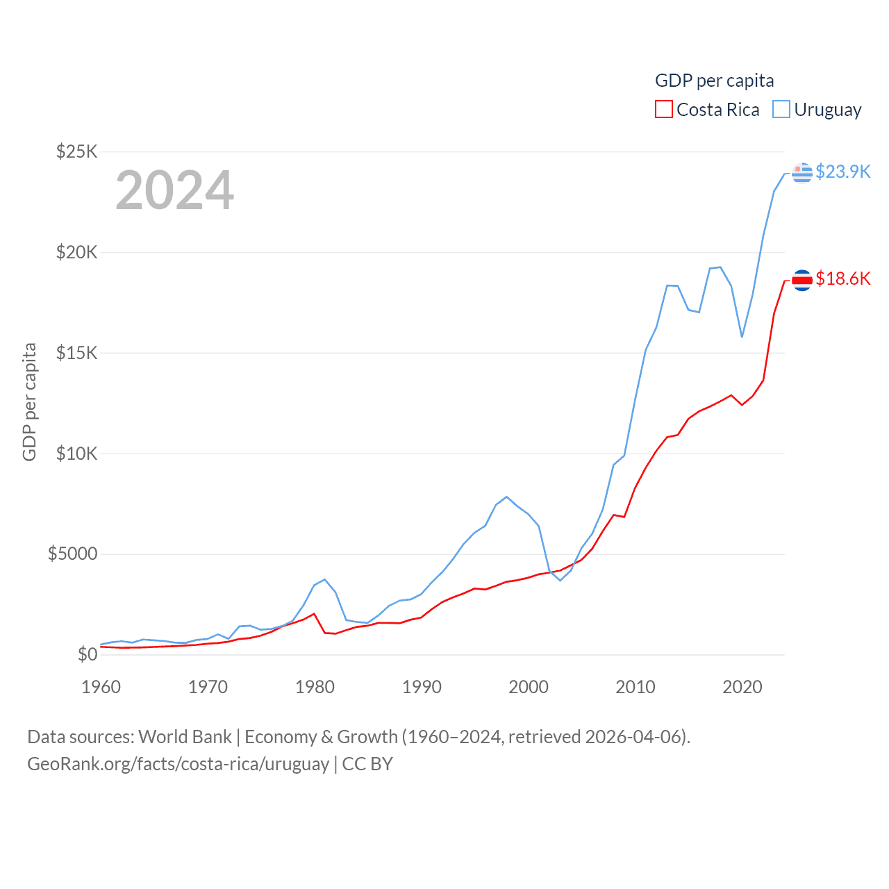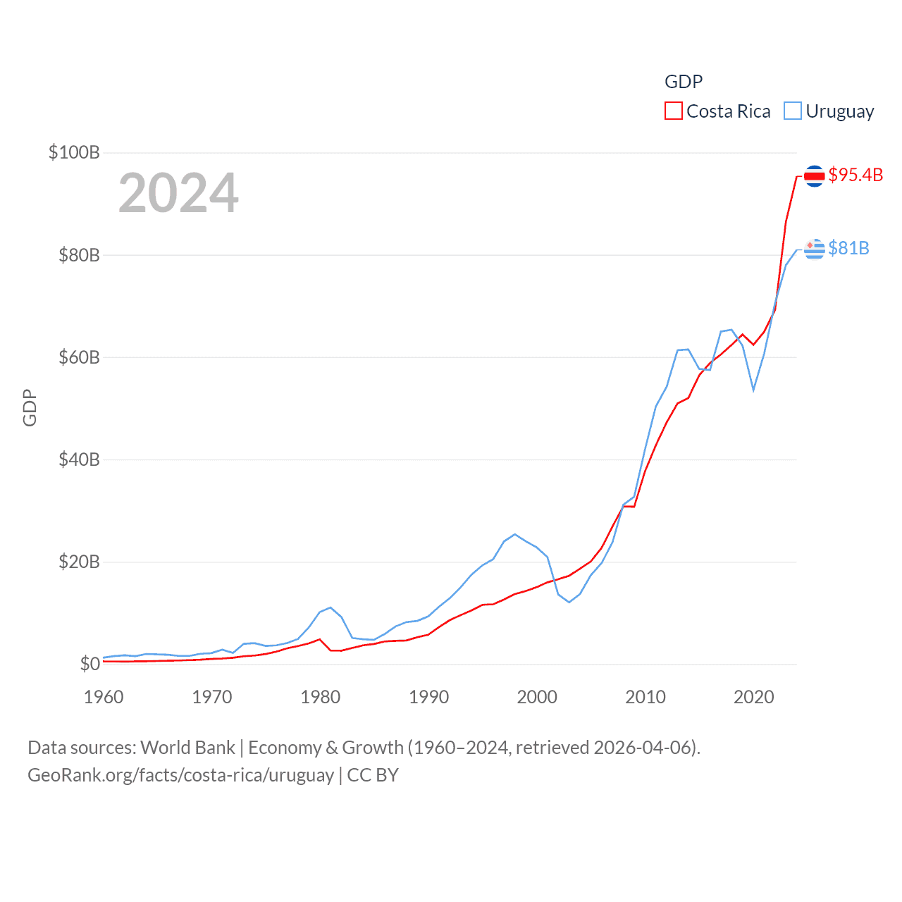 By GDP, Costa Rica ranks 73/197 ($95.4B) and Uruguay ranks 81/197 ($81B). By GDP per capita, Costa Rica ranks 62/197 ($18,587), while Uruguay ranks 52/197 ($23,907).