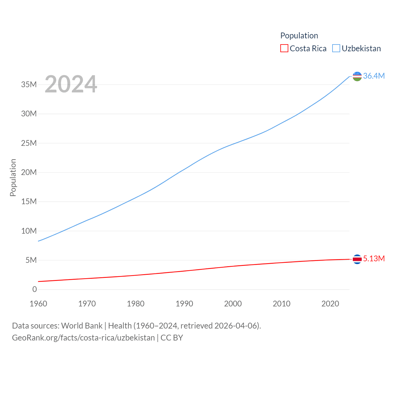 Costa Rica has a population of 5.13M (ranked 126/197), compared with 36.4M in Uzbekistan (ranked 43/197). Costa Rica's land area is 19,714 sq mi versus 170,136 sq mi for Uzbekistan (ranked 126th vs. 56th).