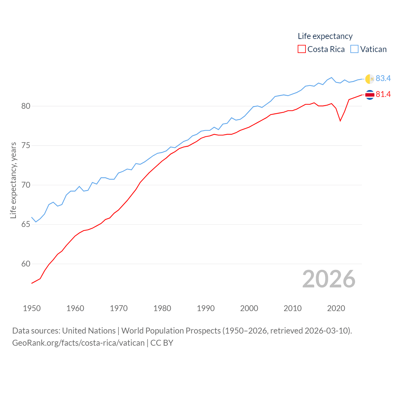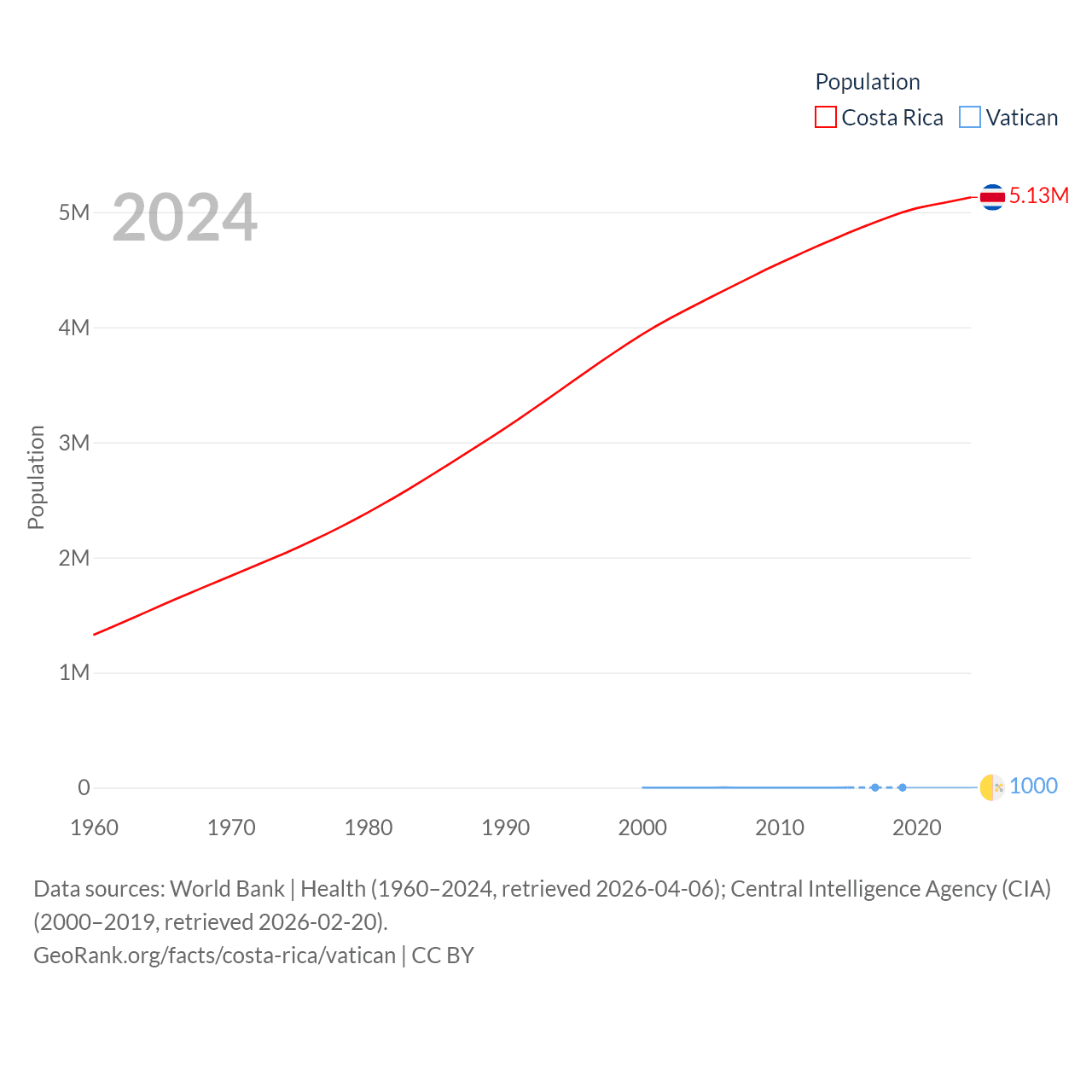 Costa Rica has a population of 5.13M (ranked 126/197), compared with 1K in The Vatican (ranked 197/197). Costa Rica's land area is 19,714 sq mi versus 0.17 sq mi for The Vatican (ranked 126th vs. 197th).