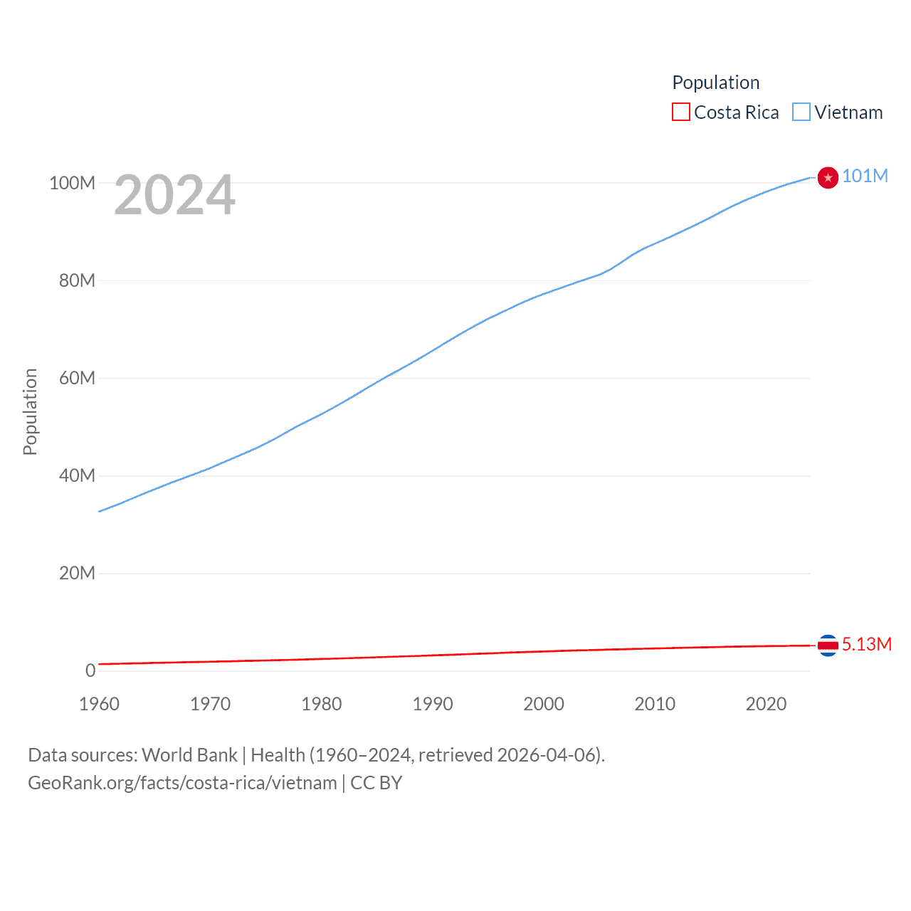 Costa Rica has a population of 5.13M (ranked 126/197), compared with 101M in Vietnam (ranked 16/197). Costa Rica's land area is 19,714 sq mi versus 121,016 sq mi for Vietnam (ranked 126th vs. 67th).
