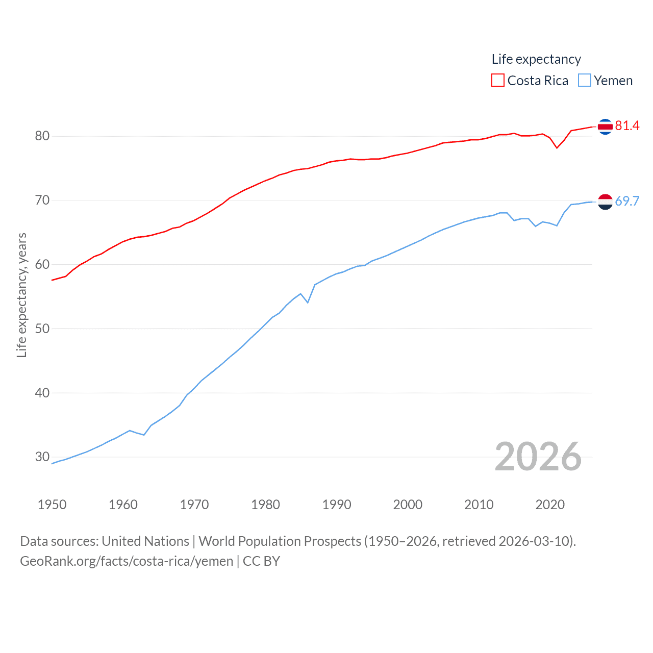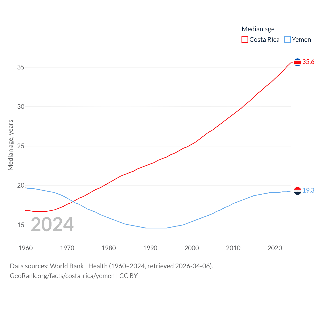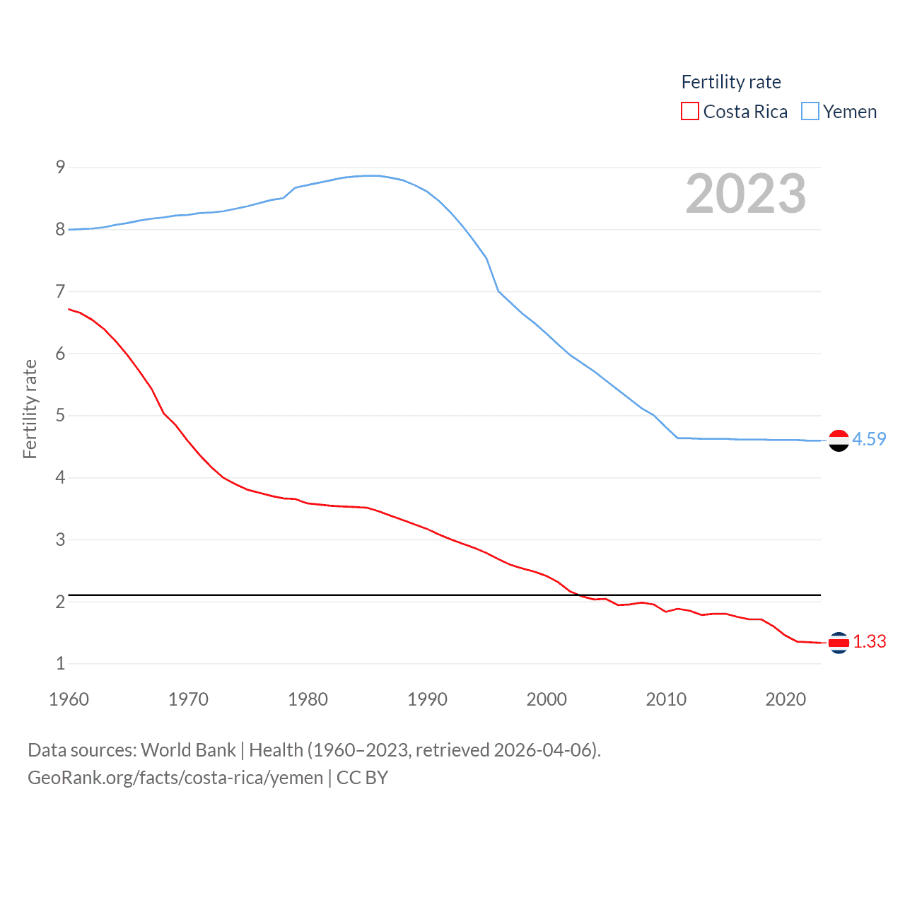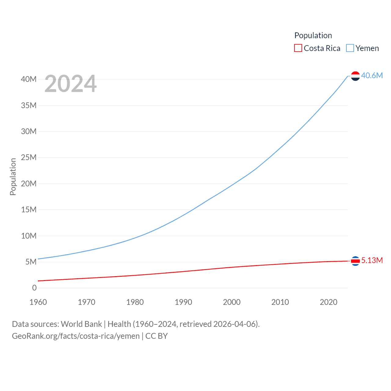 Costa Rica has a population of 5.13M (ranked 126/197), compared with 40.6M in Yemen (ranked 38/197). Costa Rica's land area is 19,714 sq mi versus 203,850 sq mi for Yemen (ranked 126th vs. 49th).