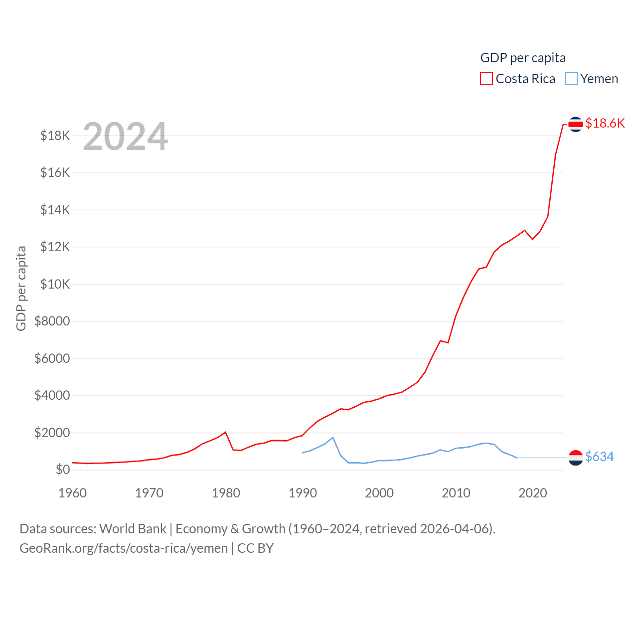By GDP, Costa Rica ranks 73/197 ($95.4B) and Yemen ranks 125/197 ($21.6B). By GDP per capita, Costa Rica ranks 62/197 ($18,587), while Yemen ranks 191/197 ($634).