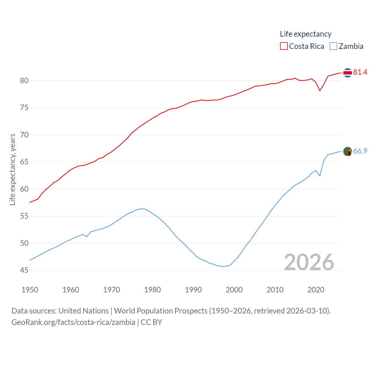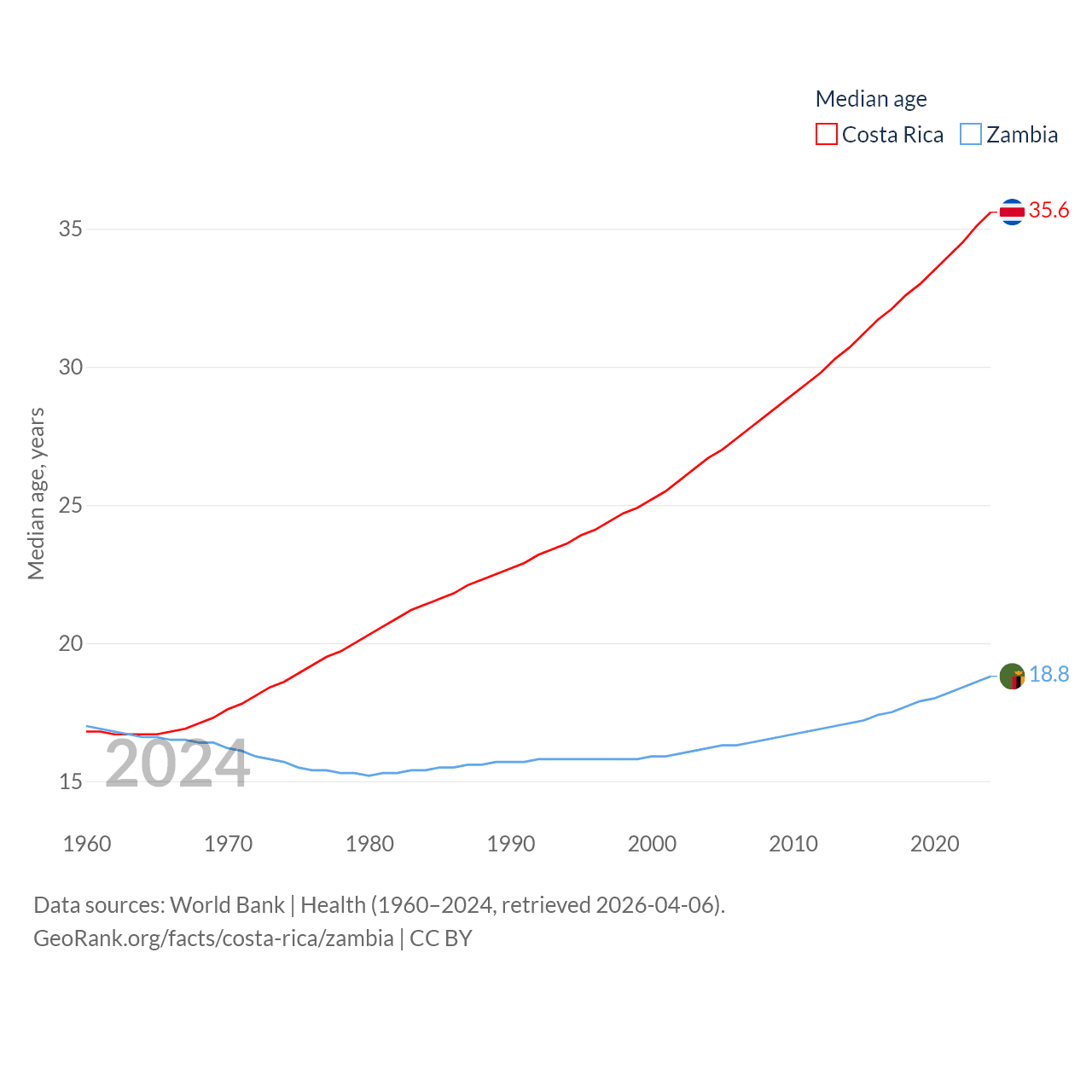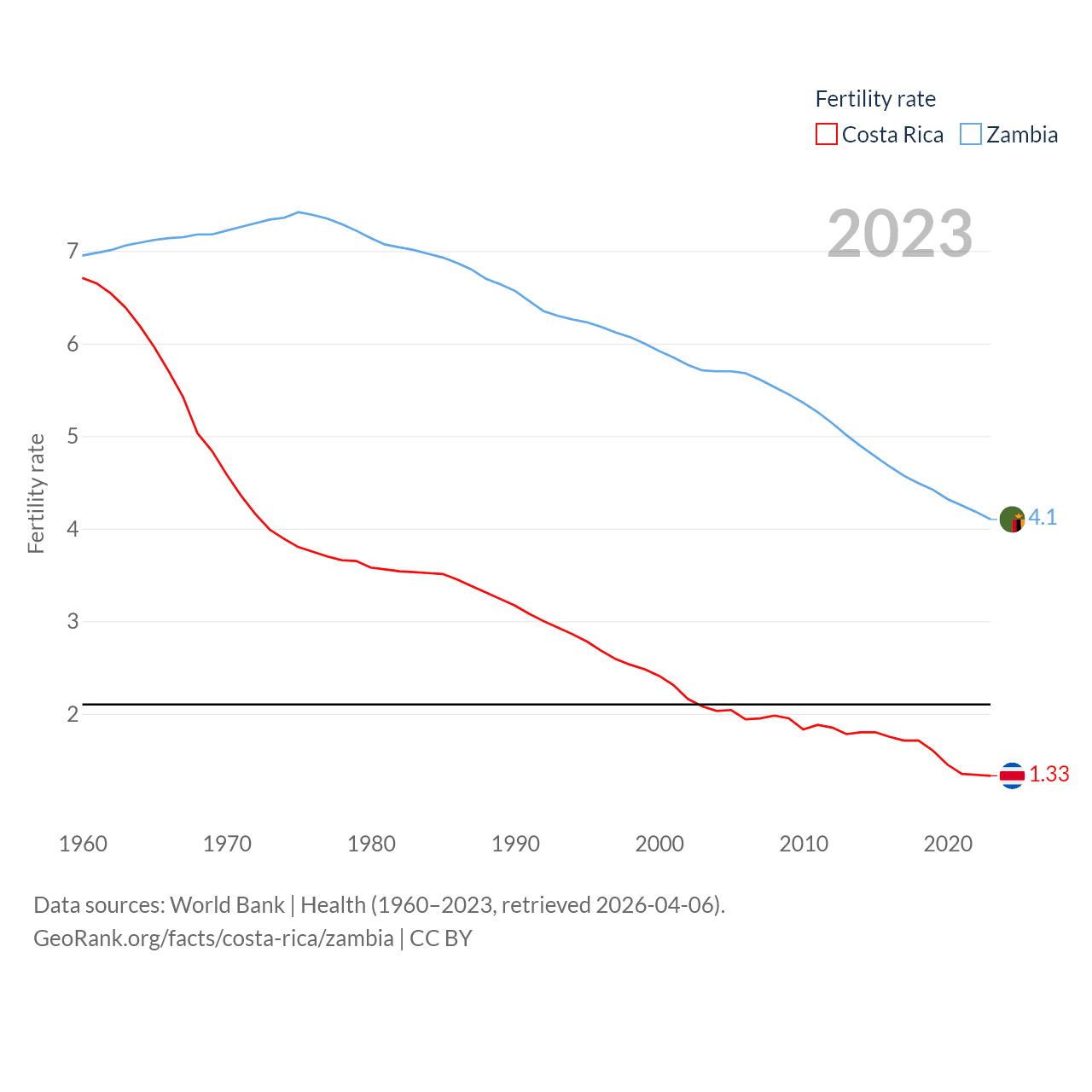 Costa Rica has a population of 5.13M (ranked 126/197), compared with 21.3M in Zambia (ranked 63/197). Costa Rica's land area is 19,714 sq mi versus 287,024 sq mi for Zambia (ranked 126th vs. 37th).