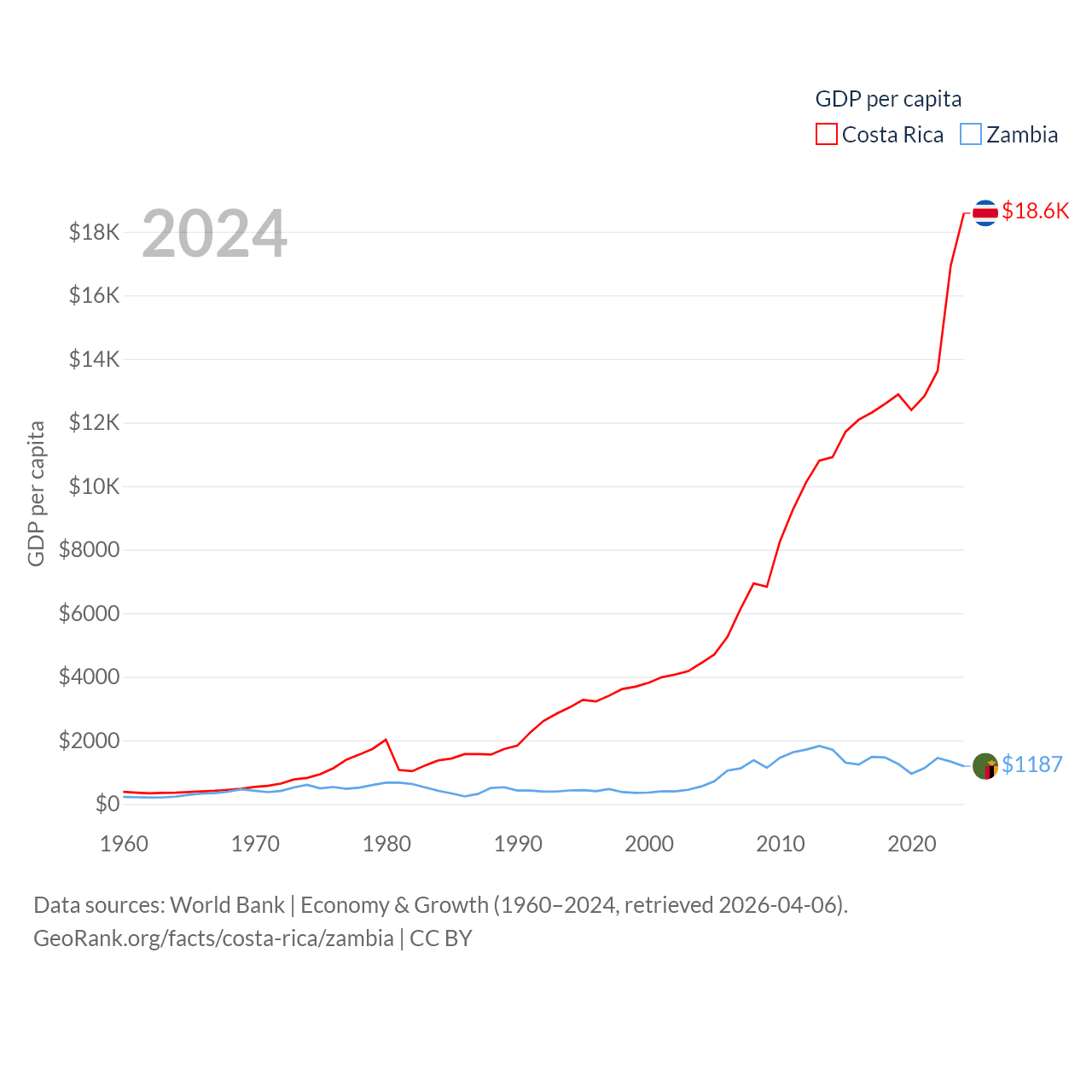 By GDP, Costa Rica ranks 73/197 ($95.4B) and Zambia ranks 116/197 ($25.3B). By GDP per capita, Costa Rica ranks 62/197 ($18,587), while Zambia ranks 169/197 ($1,187).