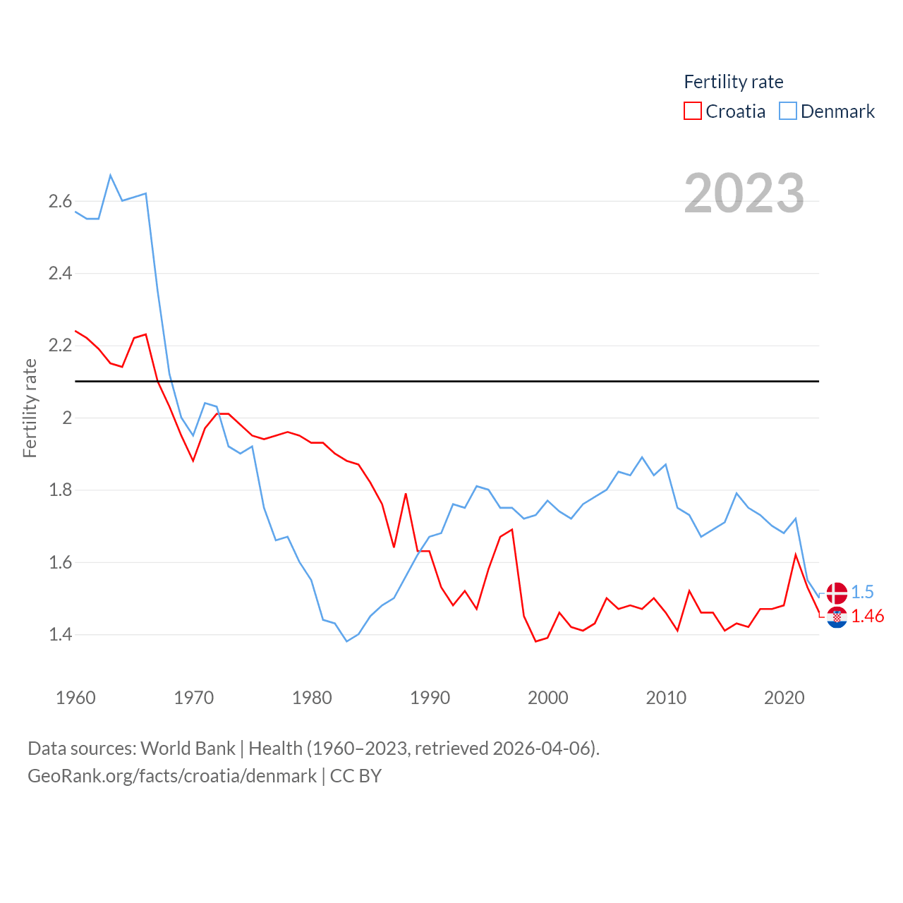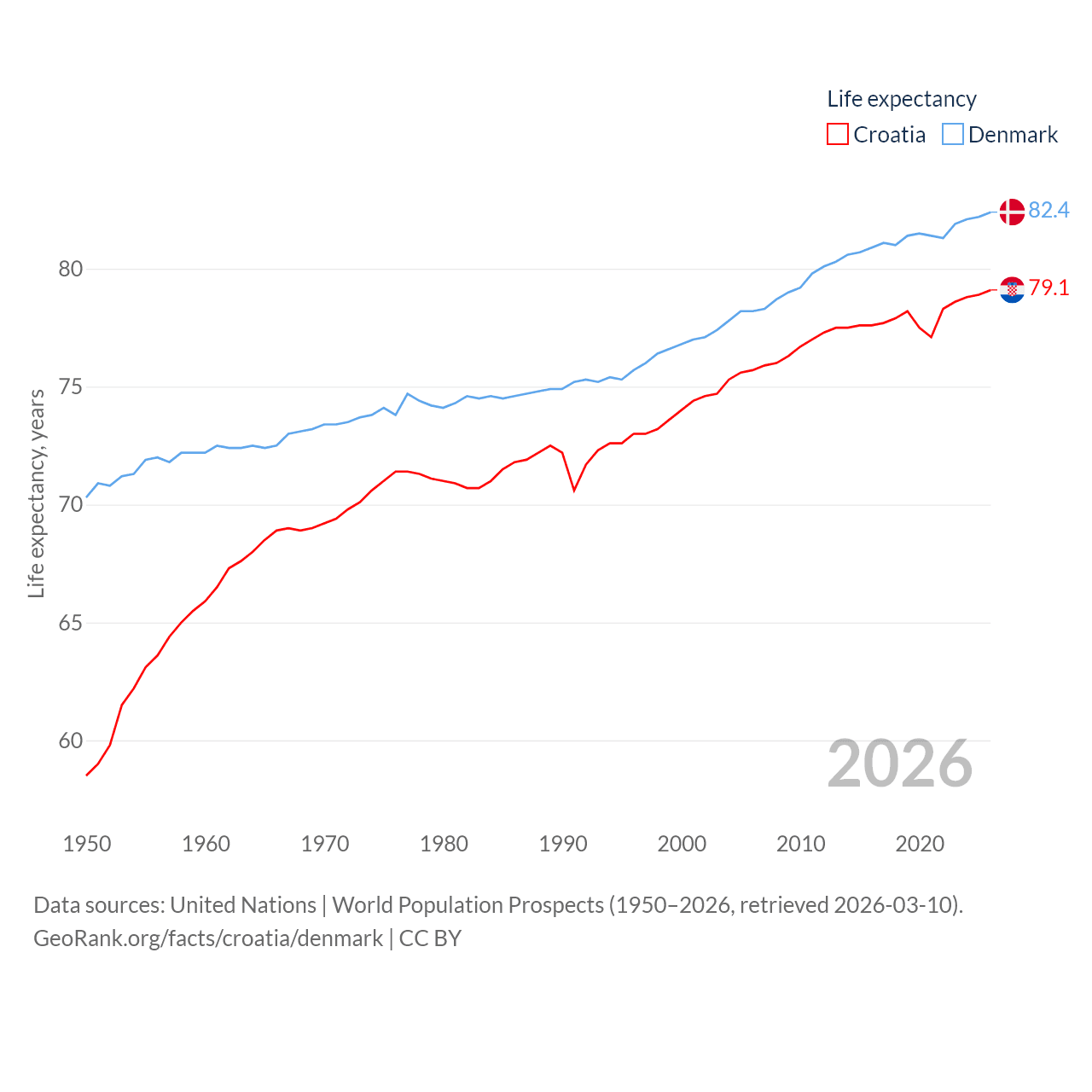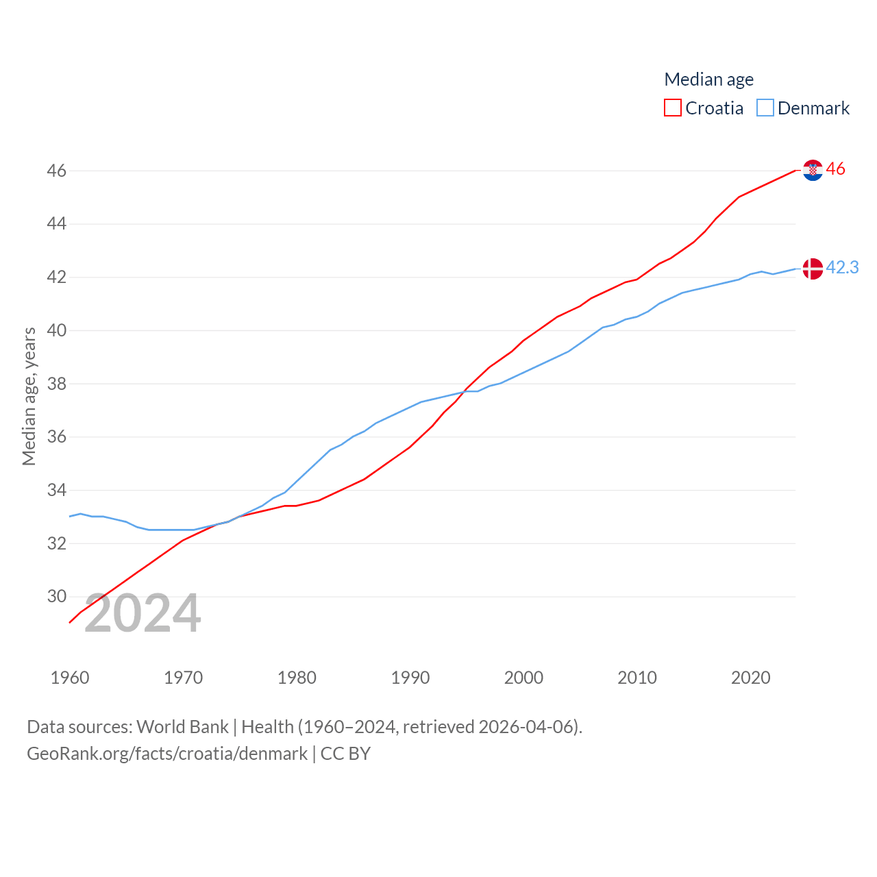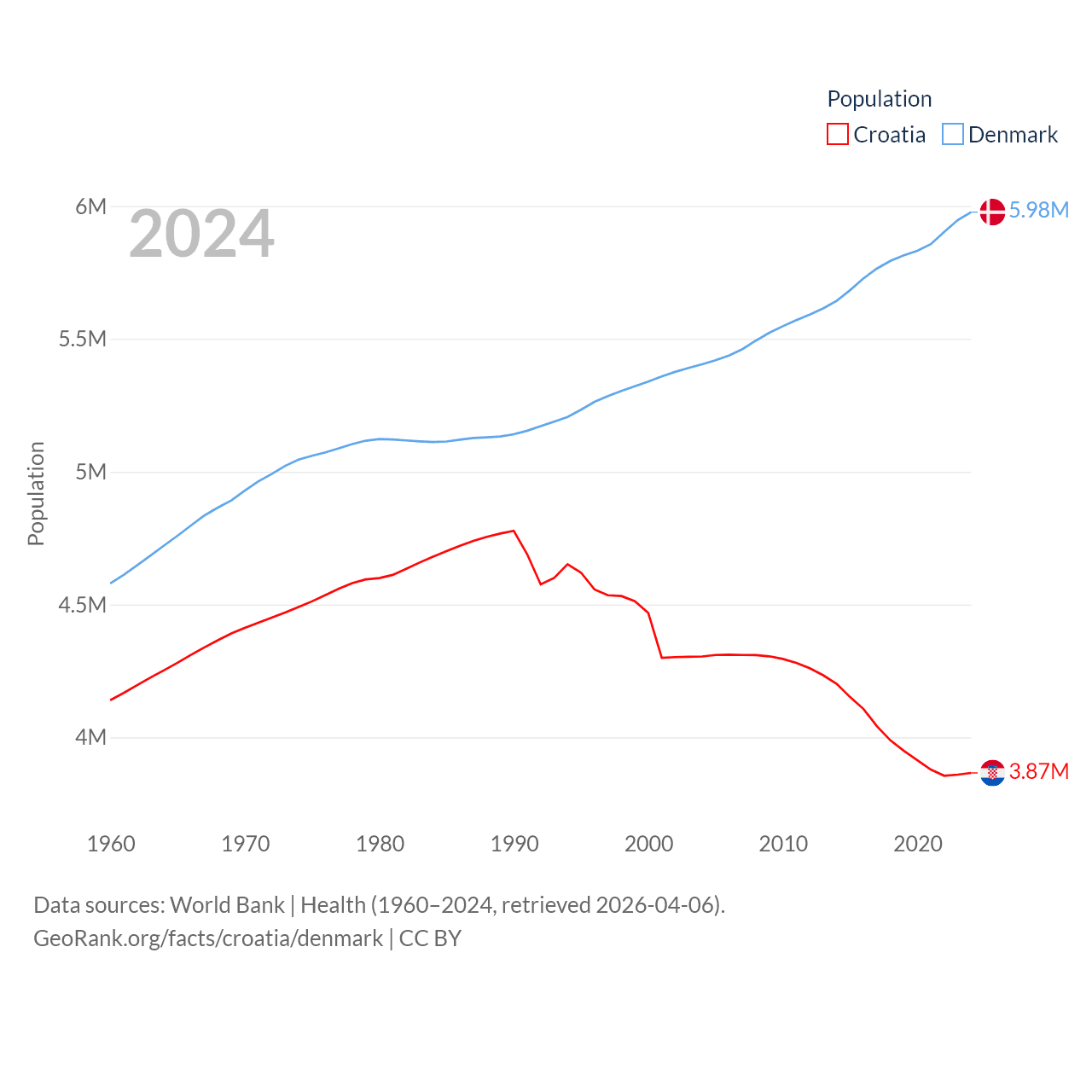 Croatia has a population of 3.87M (ranked 129/197), compared with 5.98M in Denmark (ranked 114/197). Croatia's land area is 21,606 sq mi versus 15,444 sq mi for Denmark (ranked 123rd vs. 130th).
