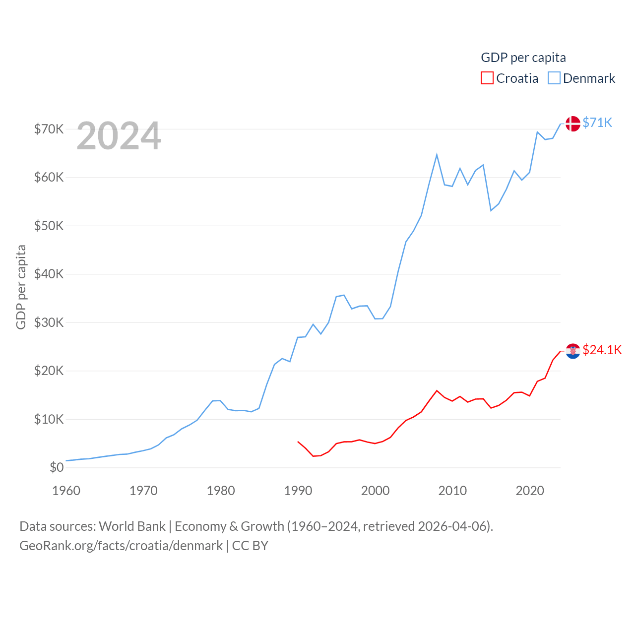 By GDP, Croatia ranks 75/197 ($93B) and Denmark ranks 37/197 ($425B). By GDP per capita, Croatia ranks 50/197 ($24,050), while Denmark ranks 12/197 ($71,026).