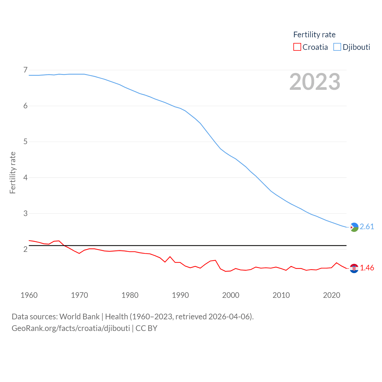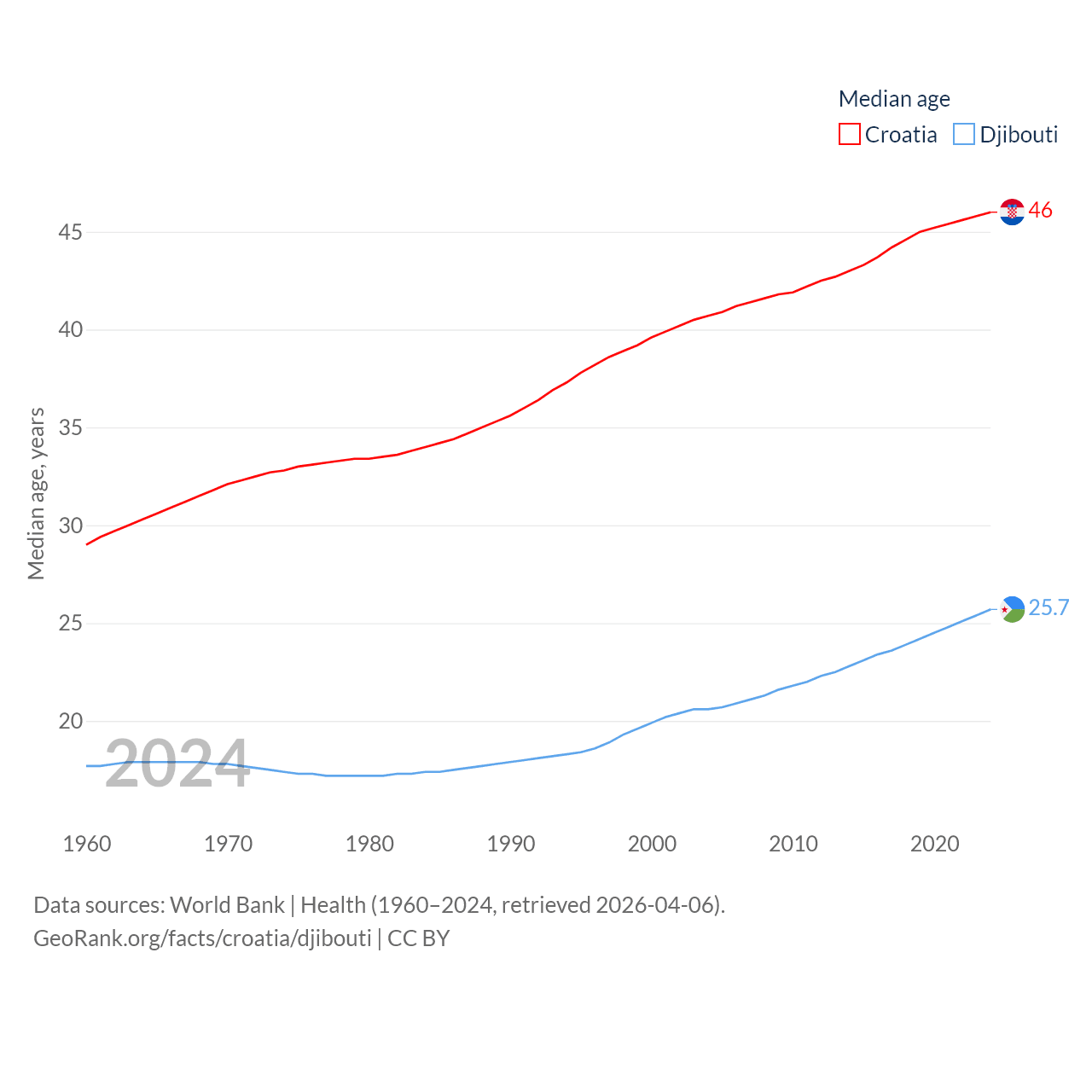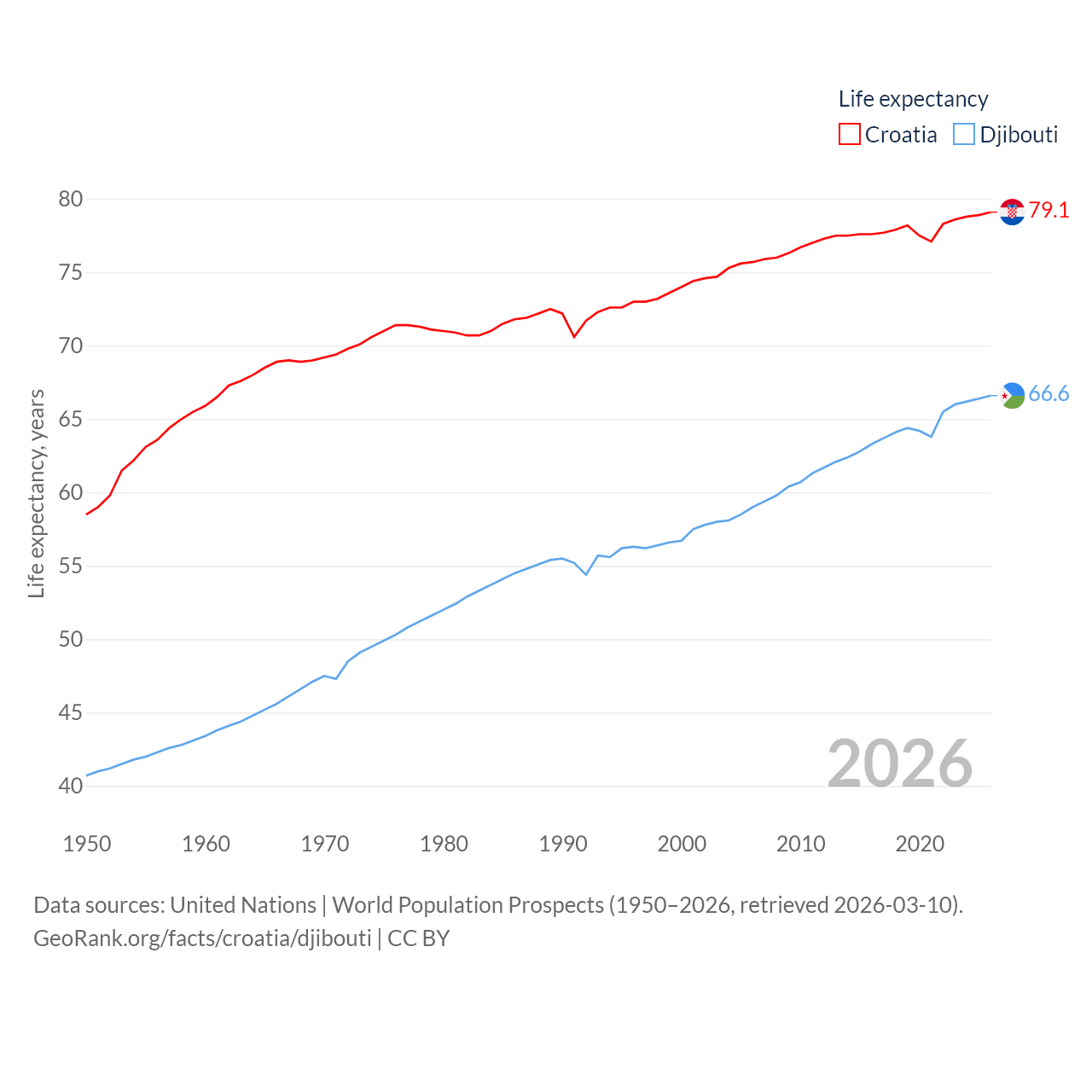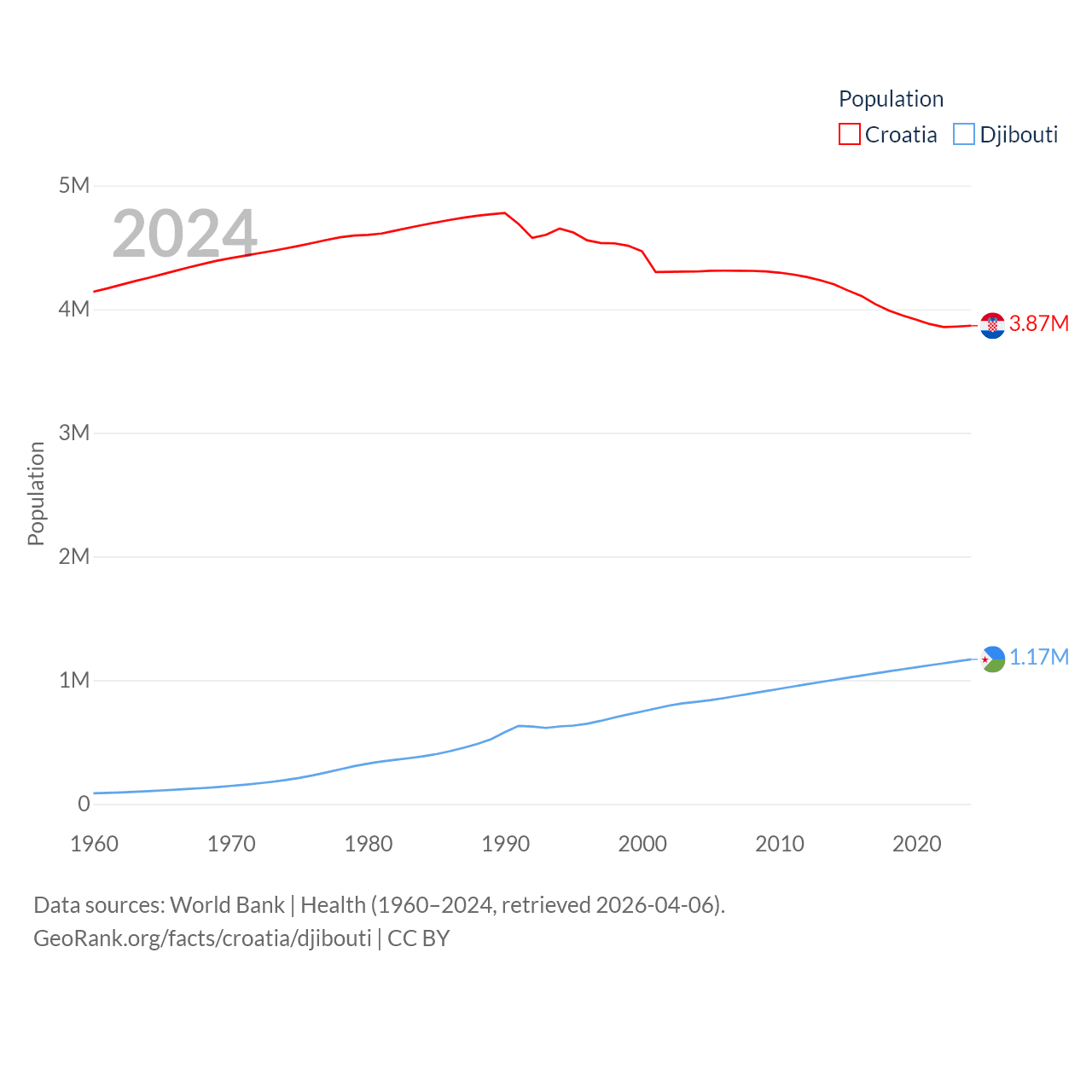 Croatia has a population of 3.87M (ranked 129/197), compared with 1.17M in Djibouti (ranked 158/197). Croatia's land area is 21,606 sq mi versus 8,950 sq mi for Djibouti (ranked 123rd vs. 147th).