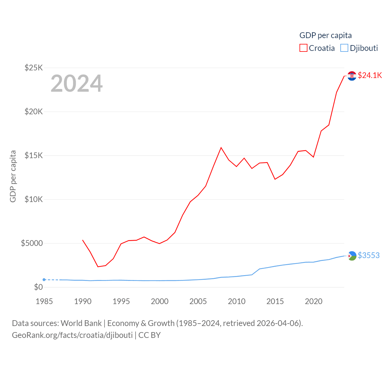 By GDP, Croatia ranks 75/197 ($93B) and Djibouti ranks 165/197 ($4.15B). By GDP per capita, Croatia ranks 50/197 ($24,050), while Djibouti ranks 133/197 ($3,553).