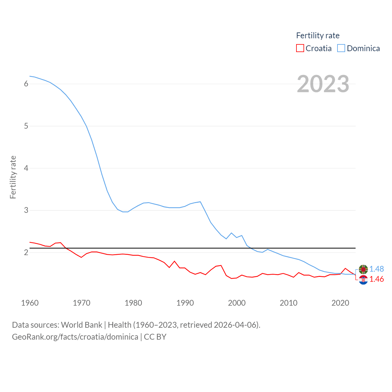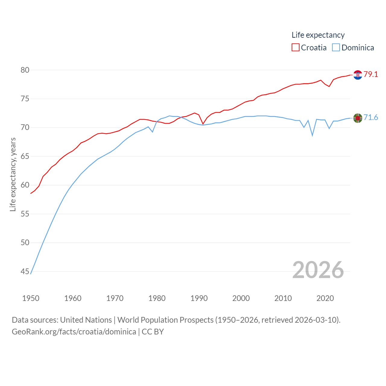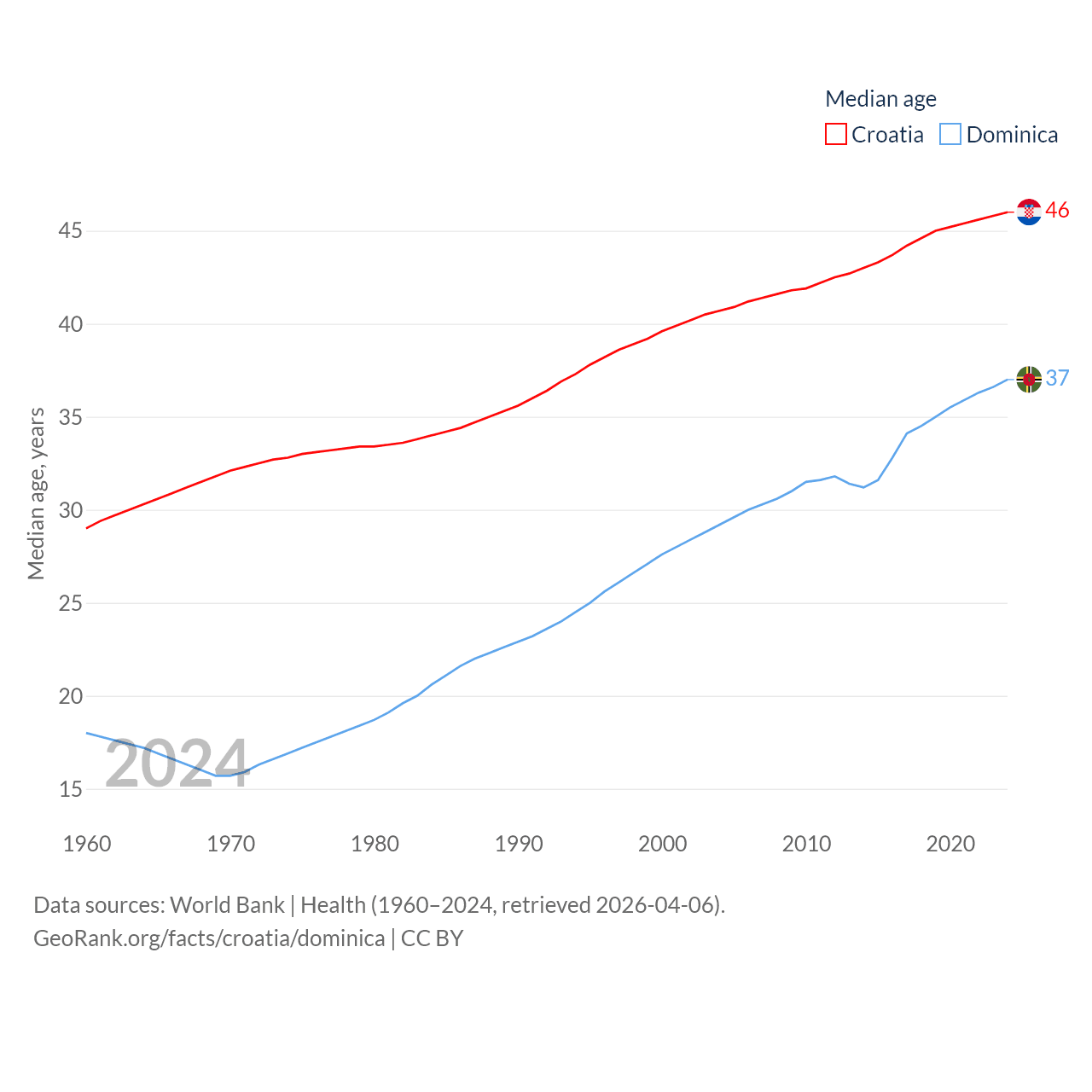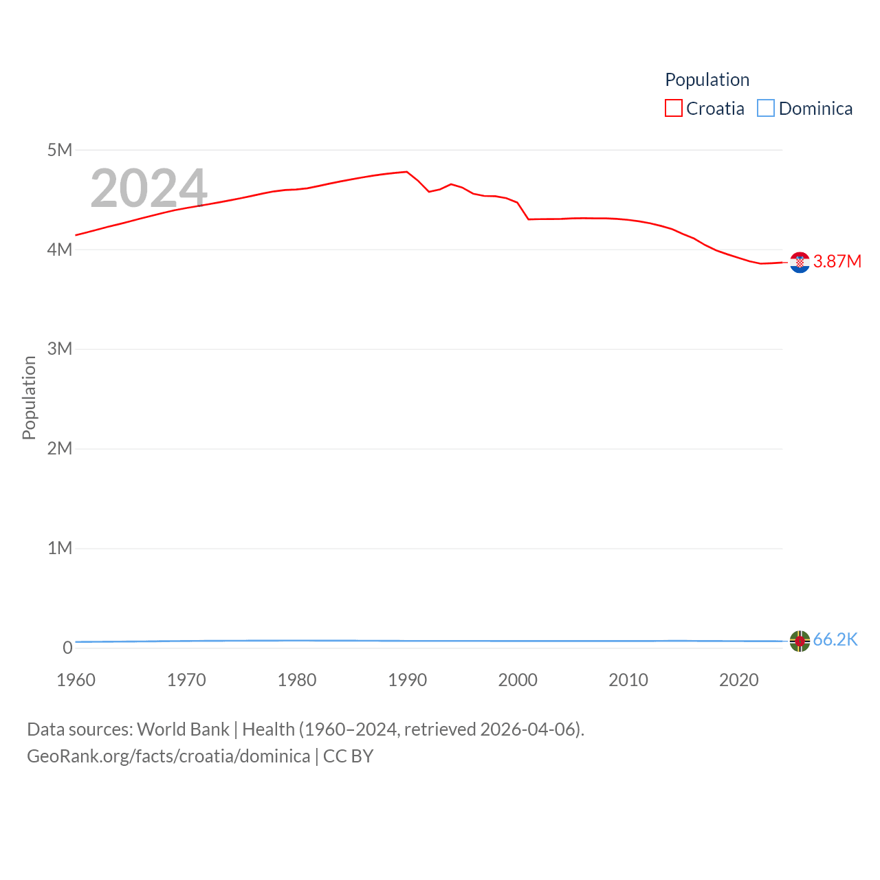 Croatia has a population of 3.87M (ranked 129/197), compared with 66.2K in Dominica (ranked 188/197). Croatia's land area is 21,606 sq mi versus 289.6 sq mi for Dominica (ranked 123rd vs. 175th).