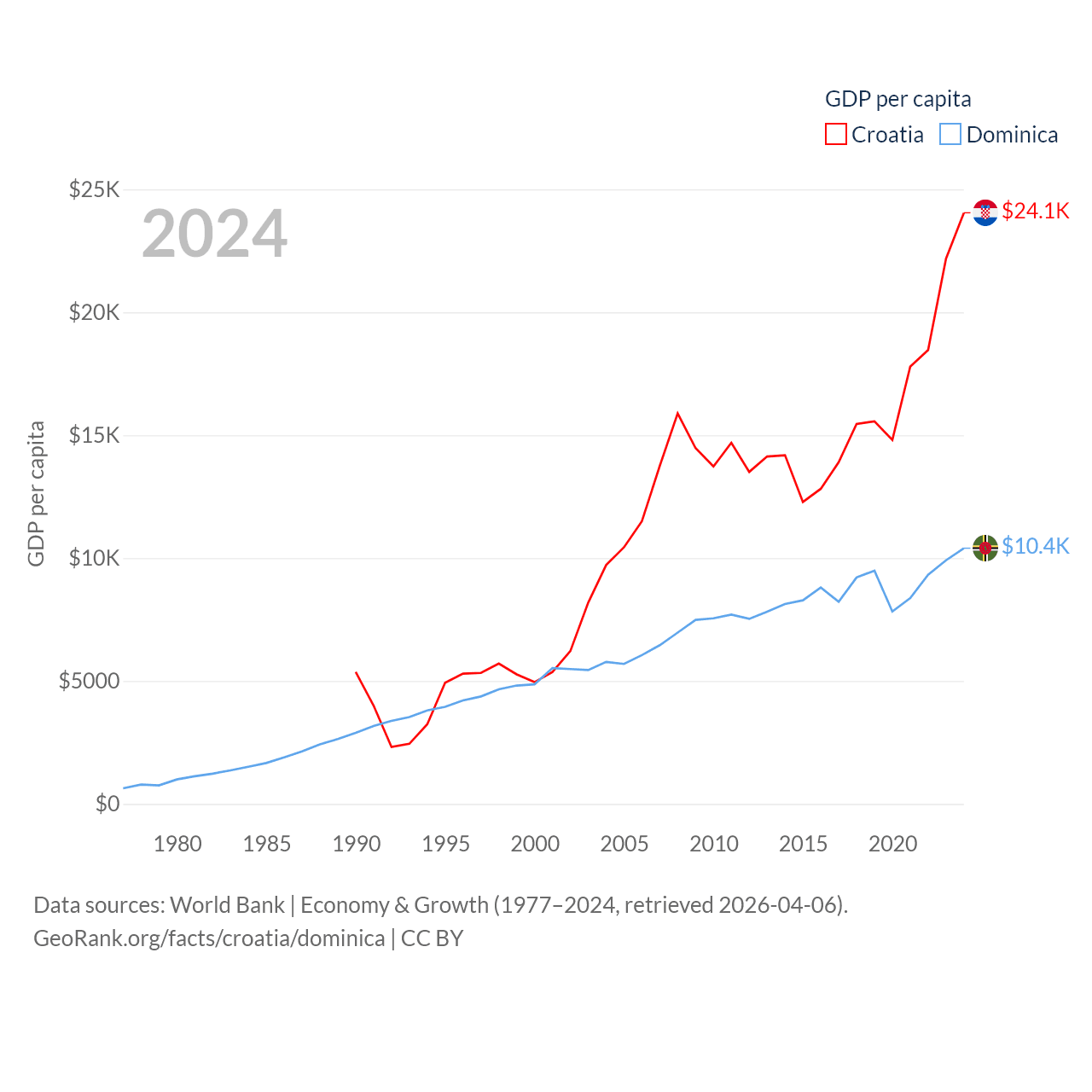 By GDP, Croatia ranks 75/197 ($93B) and Dominica ranks 190/197 ($689M). By GDP per capita, Croatia ranks 50/197 ($24,050), while Dominica ranks 84/197 ($10,405).