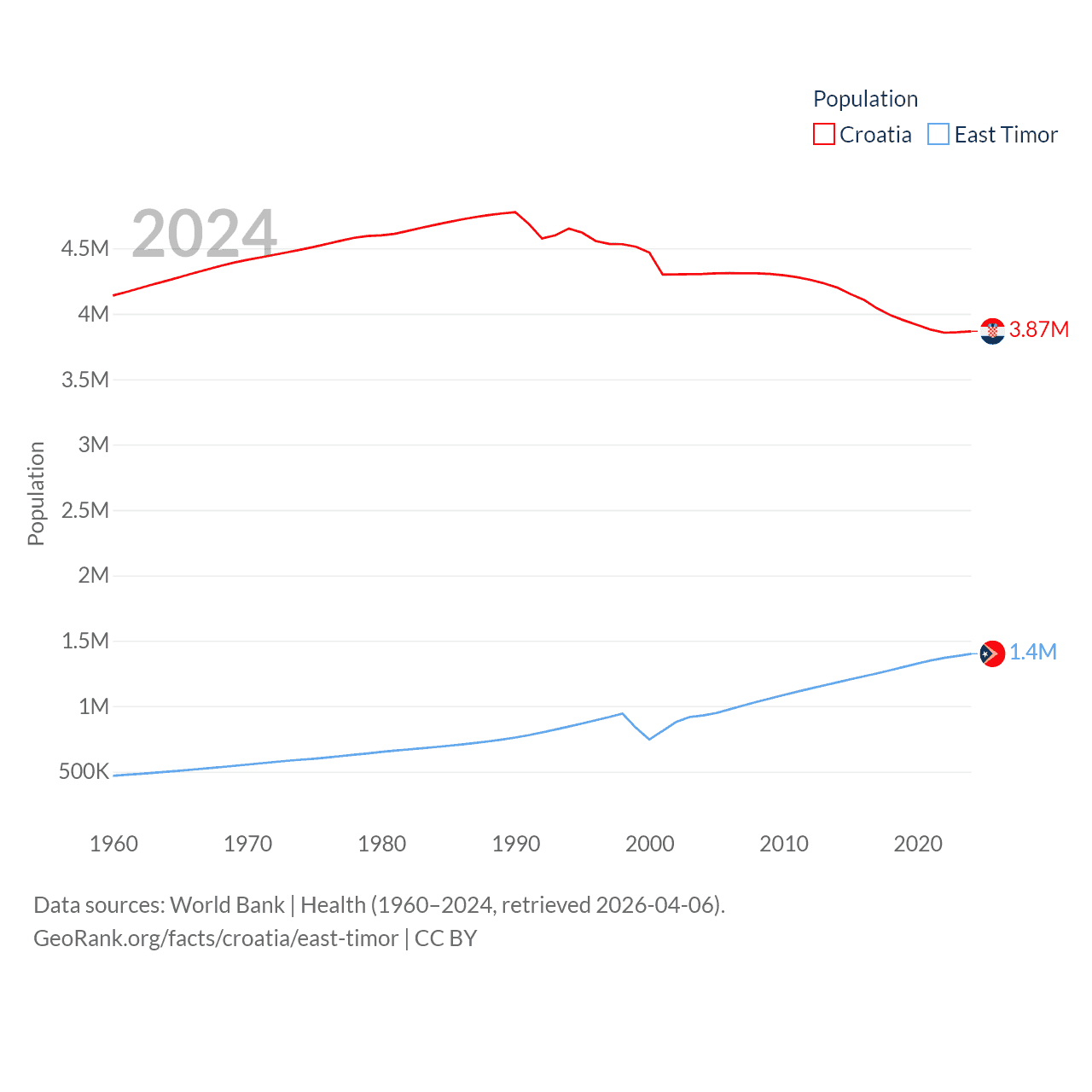 Croatia has a population of 3.87M (ranked 129/197), compared with 1.4M in East Timor (ranked 152/197). Croatia's land area is 21,606 sq mi versus 5,741 sq mi for East Timor (ranked 123rd vs. 155th).