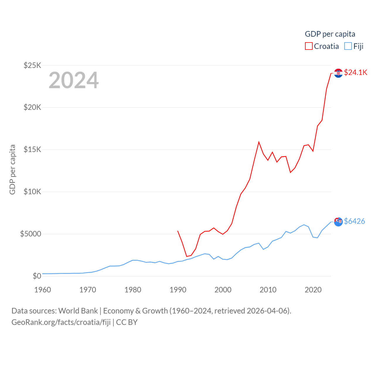 By GDP, Croatia ranks 75/197 ($93B) and Fiji ranks 161/197 ($5.97B). By GDP per capita, Croatia ranks 50/197 ($24,050), while Fiji ranks 108/197 ($6,426).