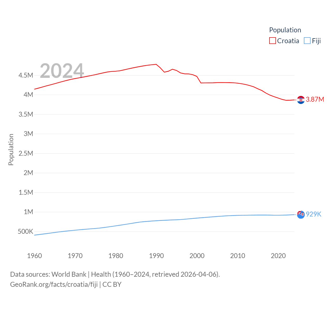 Croatia has a population of 3.87M (ranked 129/197), compared with 929K in Fiji (ranked 159/197). Croatia's land area is 21,606 sq mi versus 7,054 sq mi for Fiji (ranked 123rd vs. 152nd).
