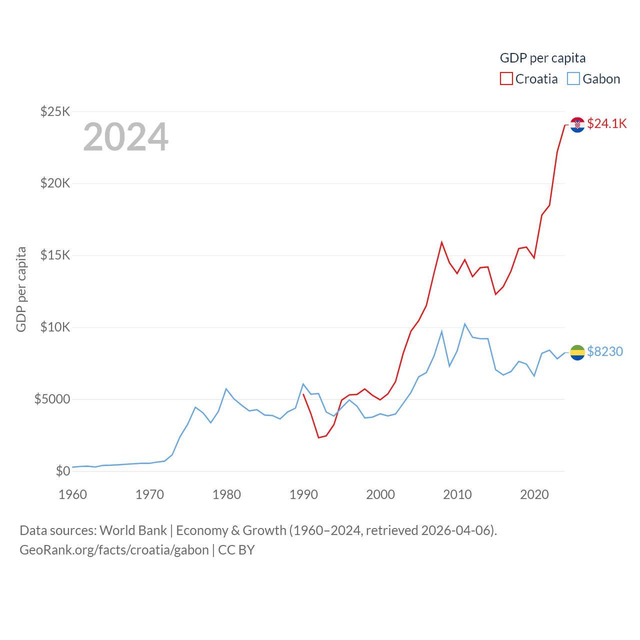 By GDP, Croatia ranks 75/197 ($93B) and Gabon ranks 127/197 ($20.9B). By GDP per capita, Croatia ranks 50/197 ($24,050), while Gabon ranks 93/197 ($8,230).