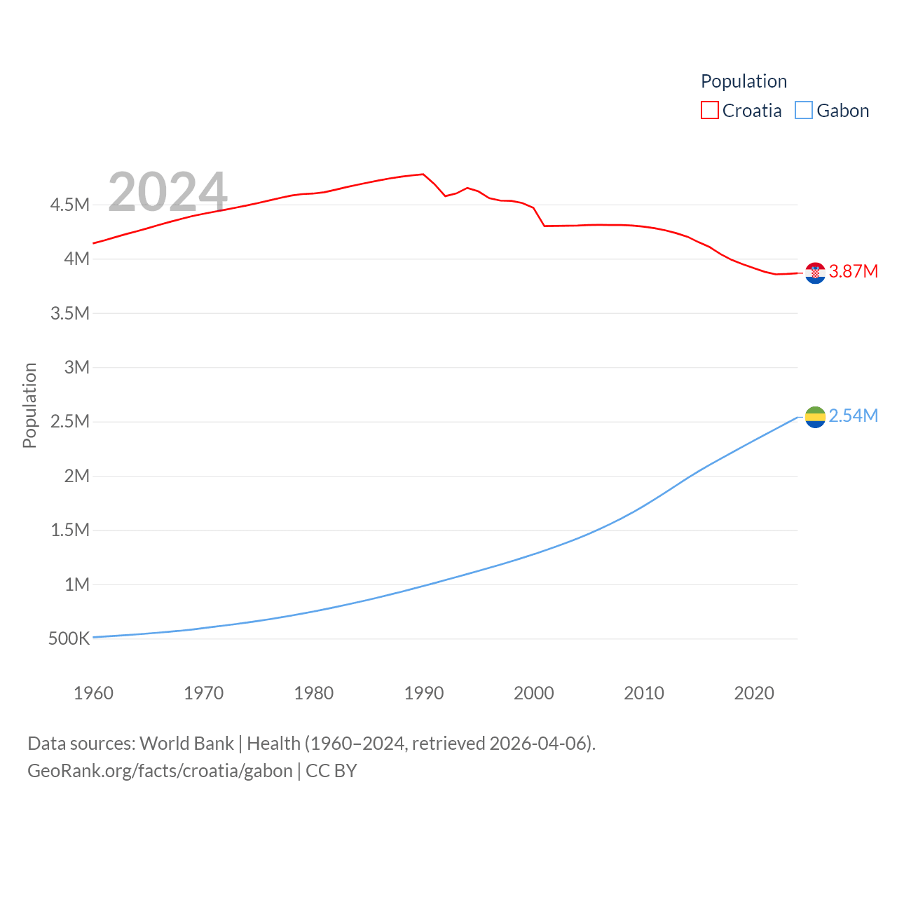 Croatia has a population of 3.87M (ranked 129/197), compared with 2.54M in Gabon (ranked 141/197). Croatia's land area is 21,606 sq mi versus 99,487 sq mi for Gabon (ranked 123rd vs. 75th).